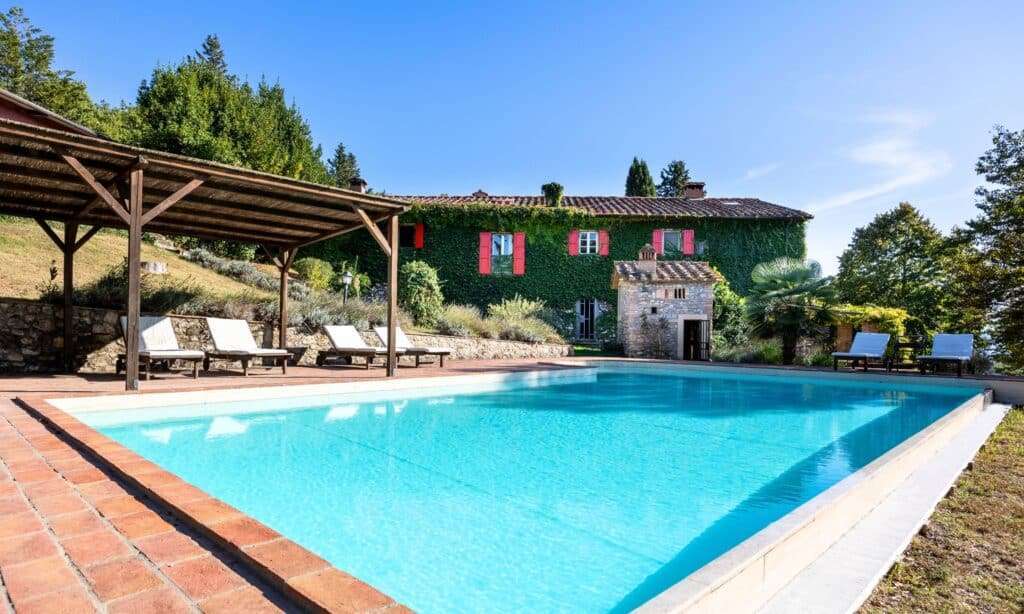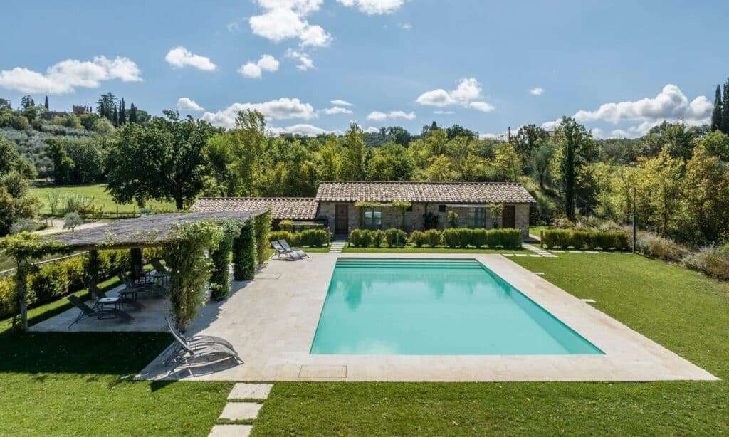 One example is the stone manor house with a swimming pool in Val di Chiana, with state-of-the-art facilities, such as solar panels, for electricity and hot water supply.