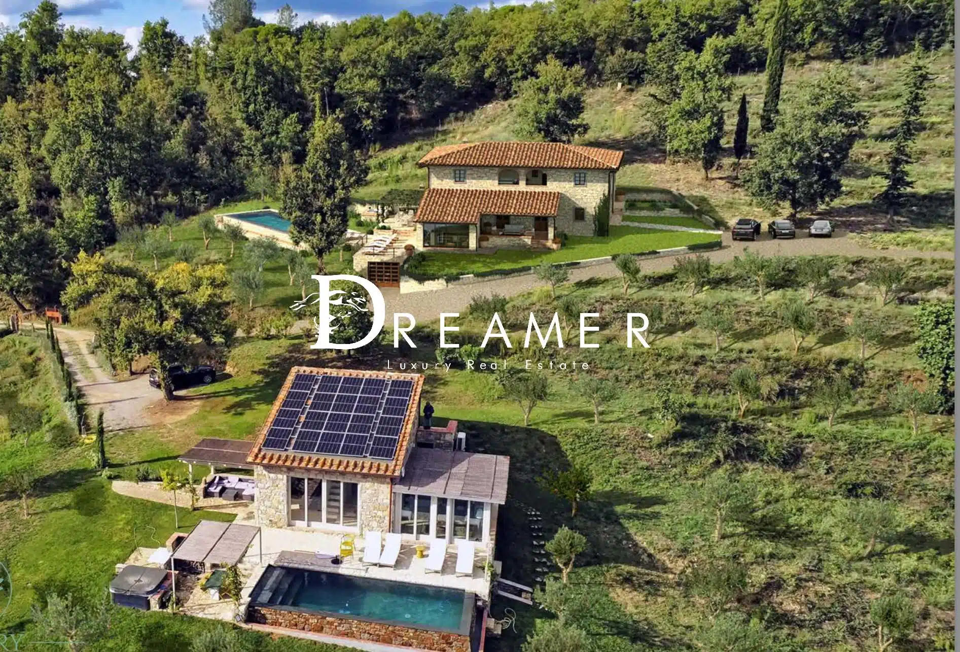 The properties include a garage and a double infinity pool with salt water filter, as well as a pergola, barbecue area, solarium, and jacuzzi corner. The outdoor grounds are dotted with fruit trees and offer an exclusive and peaceful setting, ideal for enjoying Chianti in complete privacy. A unique property, perfect as a prestigious residence or a high-yield investment.