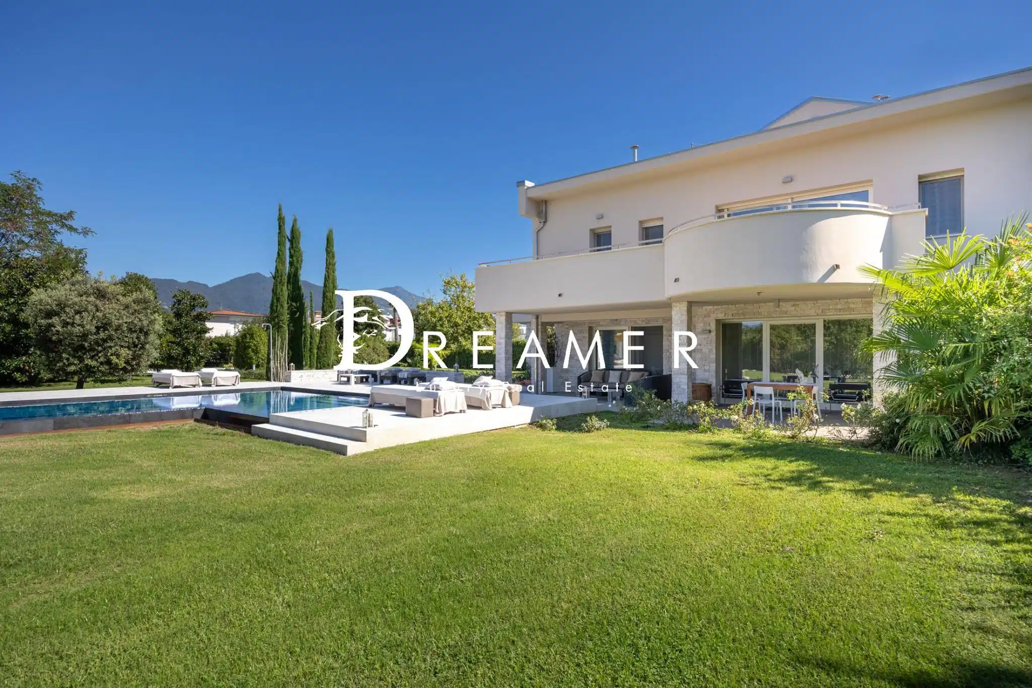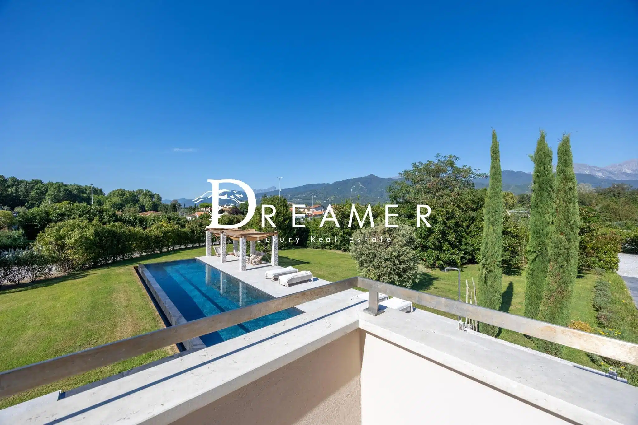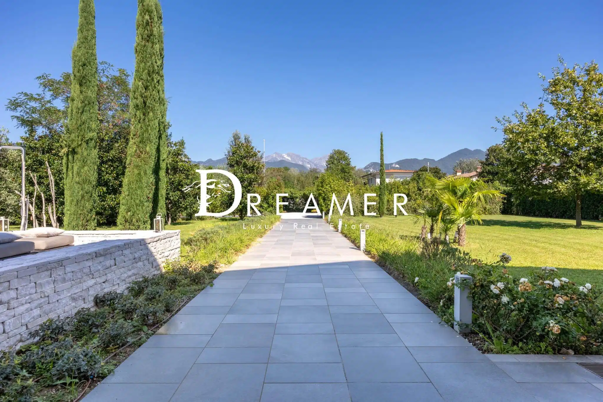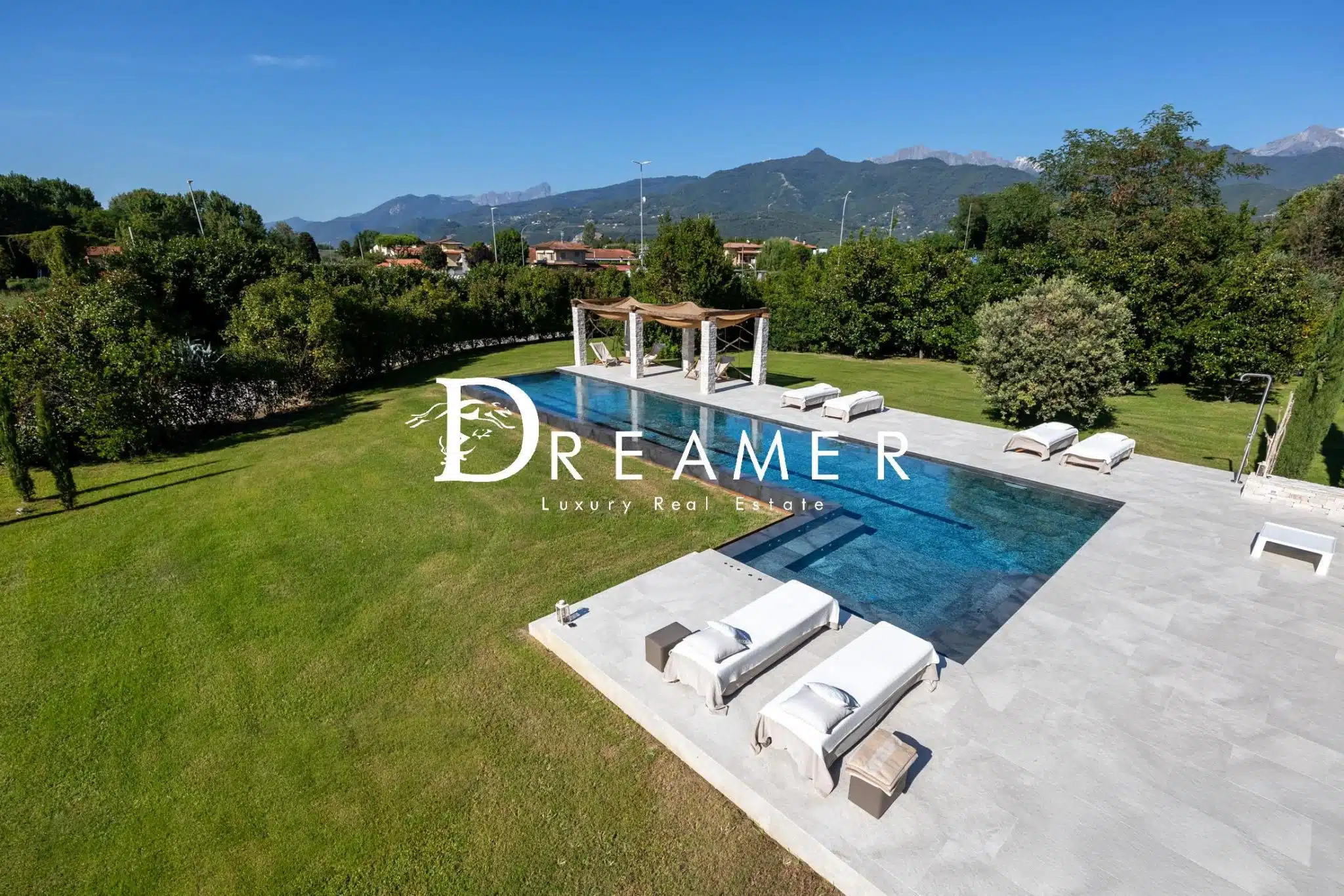 Nestled in a lush private garden, the villa is surrounded by Mediterranean trees such as holm oaks, cypresses, and oleanders, ensuring privacy and tranquility. The focal point of the outdoor area is the magnificent infinity pool with a whirlpool area and solarium, ideal for relaxing under the Versilia sun.