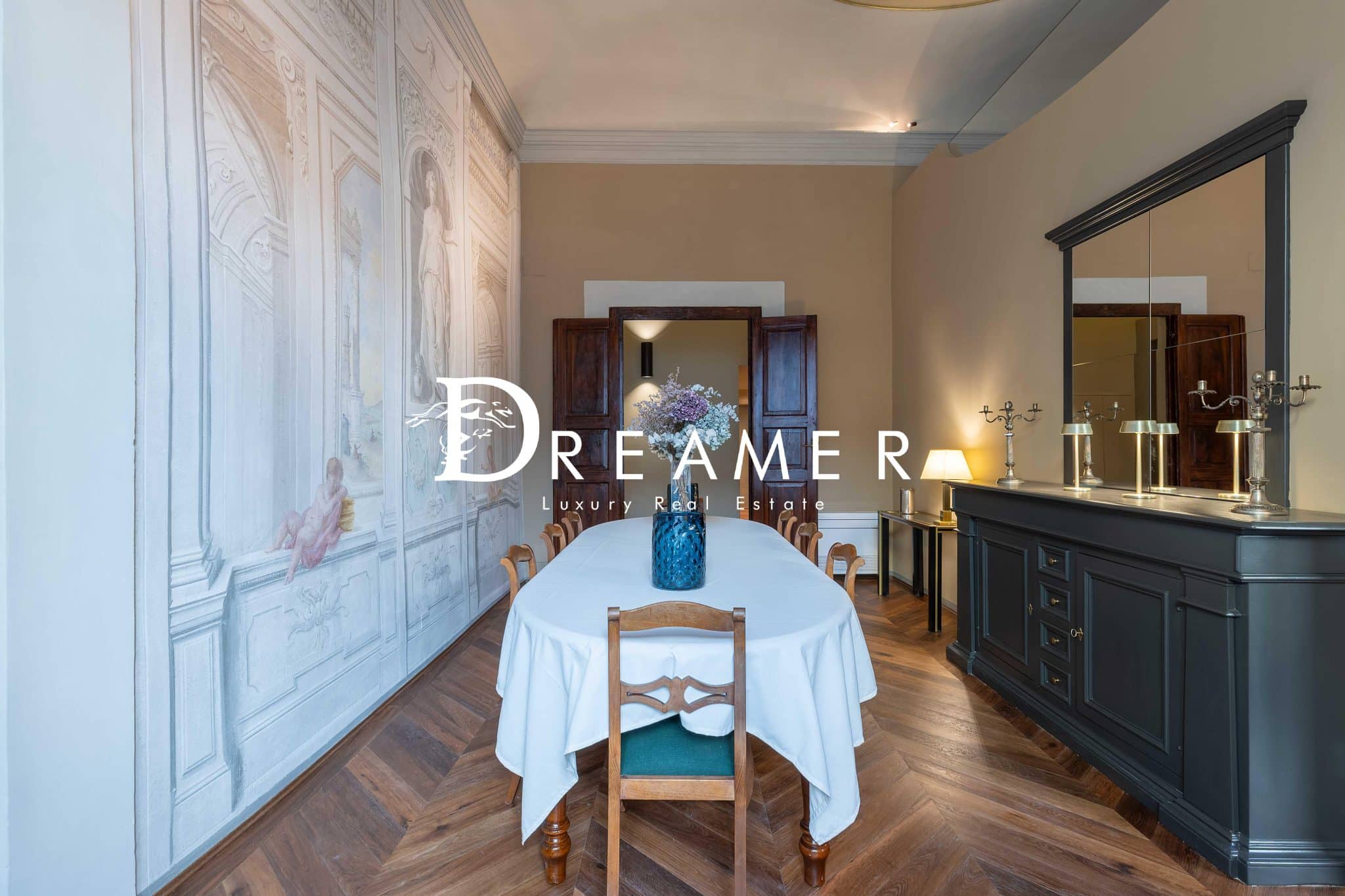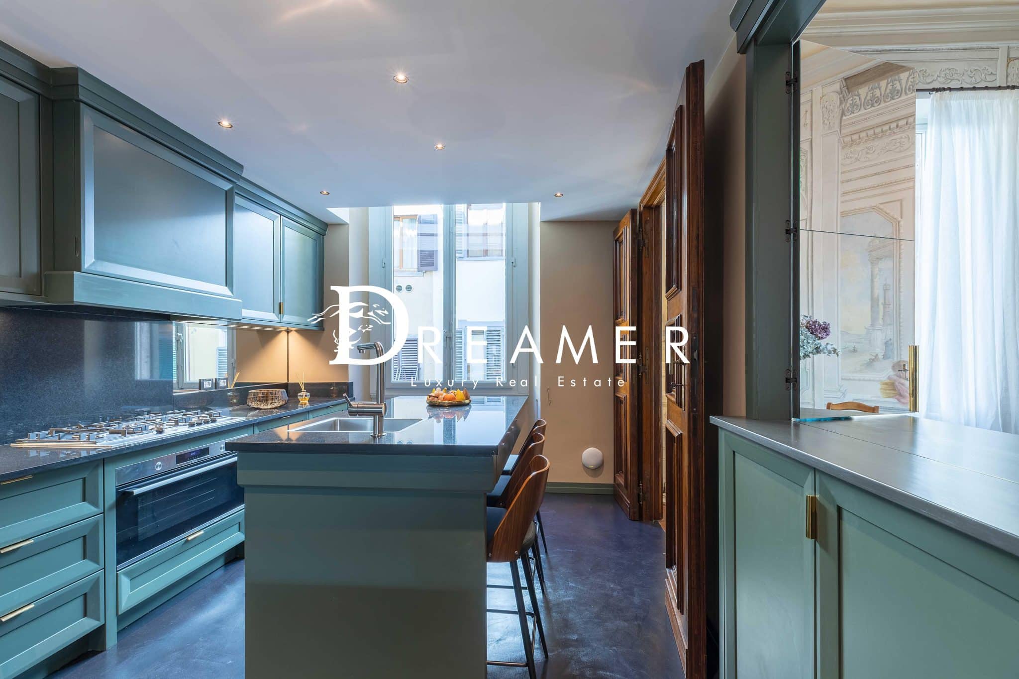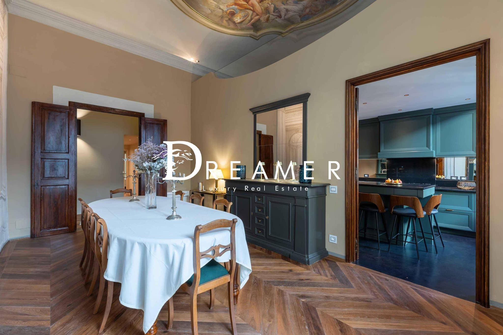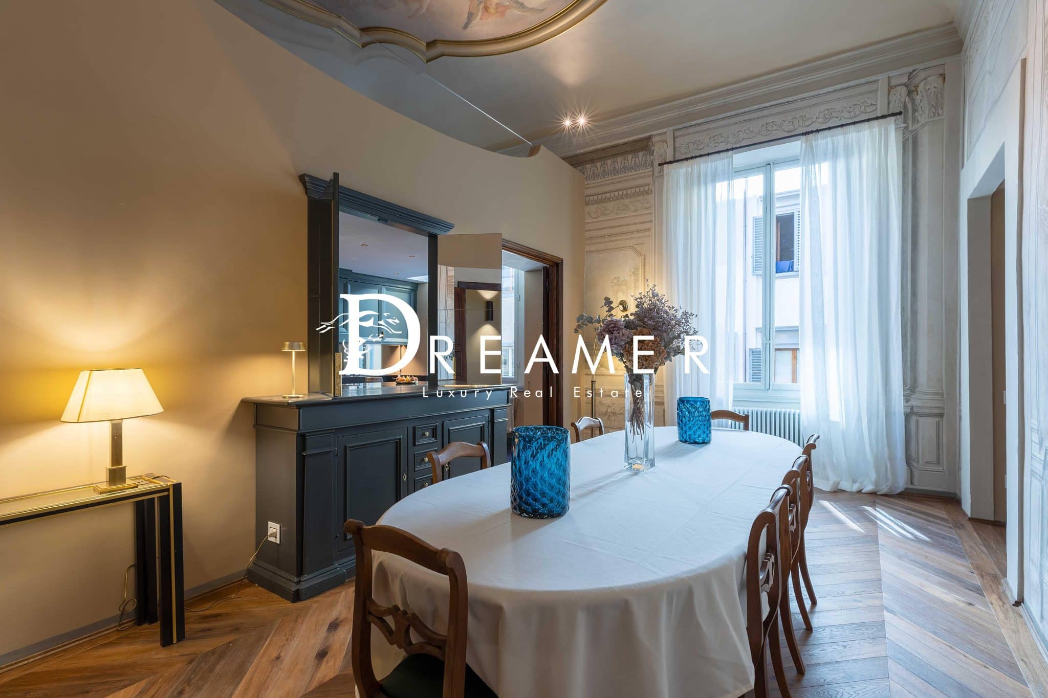 Magnificent frescoed apartment with garage and concierge service for rent in the heart of Florence, just steps from Santa Croce and the city’s main historic attractions. Located on the first floor of an elegant historic building with an elevator, this prestigious residence, recently renovated with meticulous attention to detail, offers approximately 300 sqm of refined interiors with four bedrooms and five bathrooms.