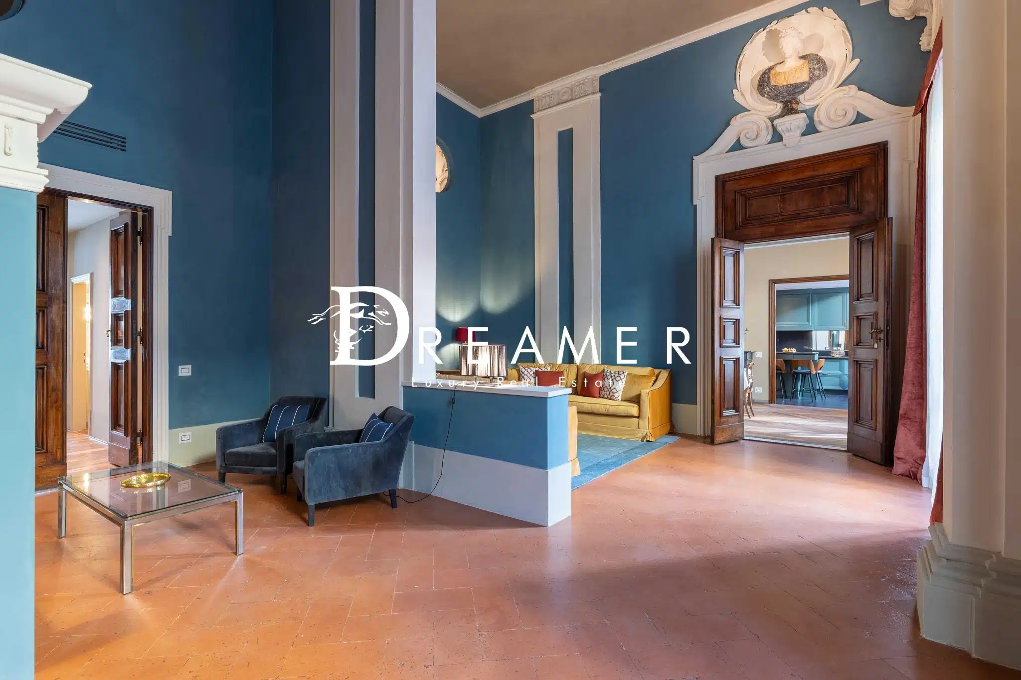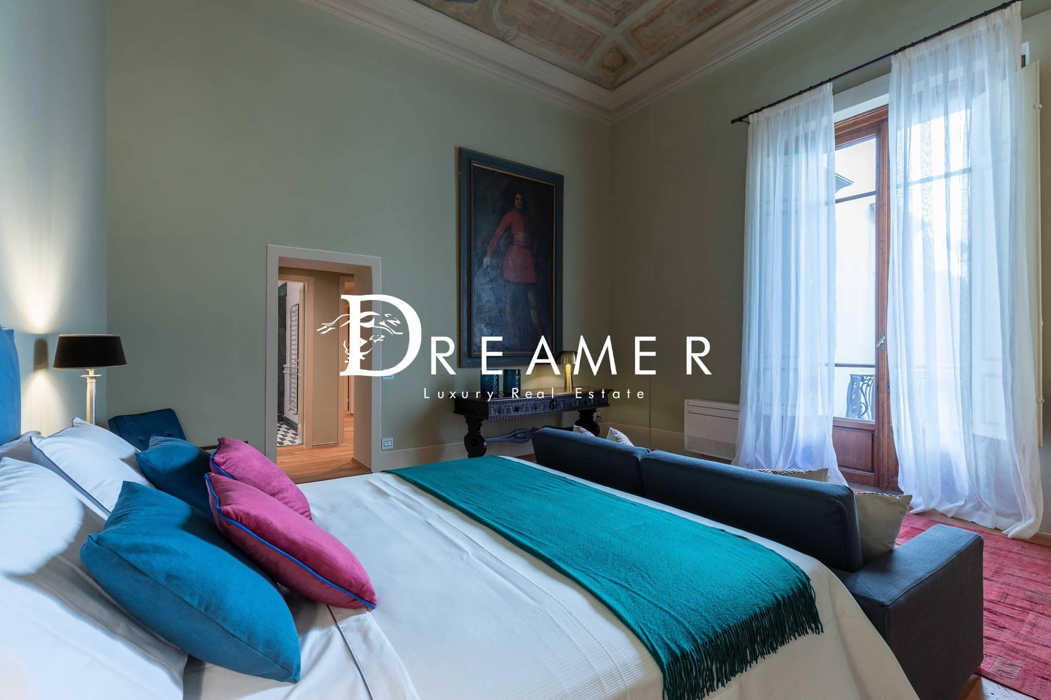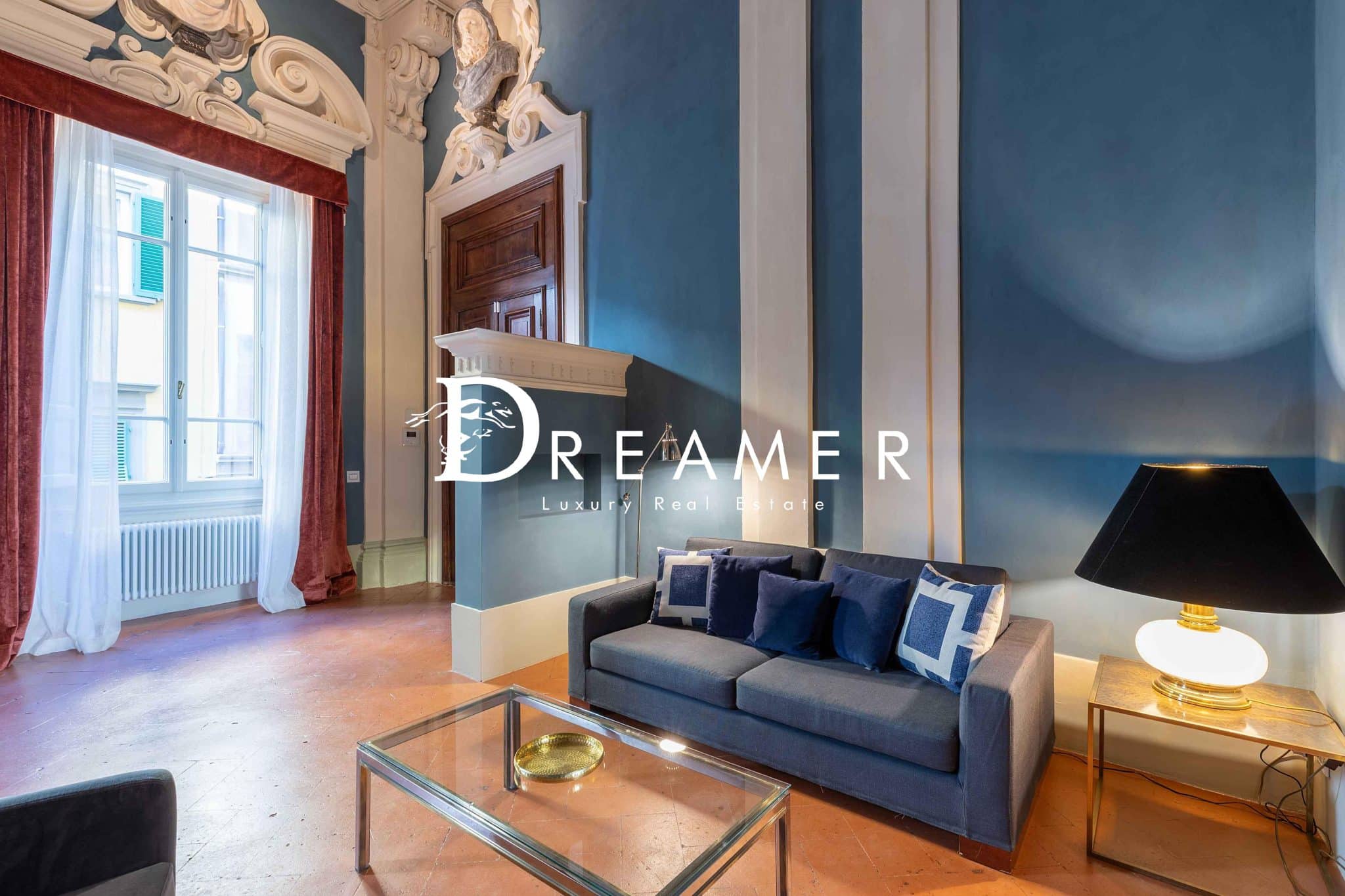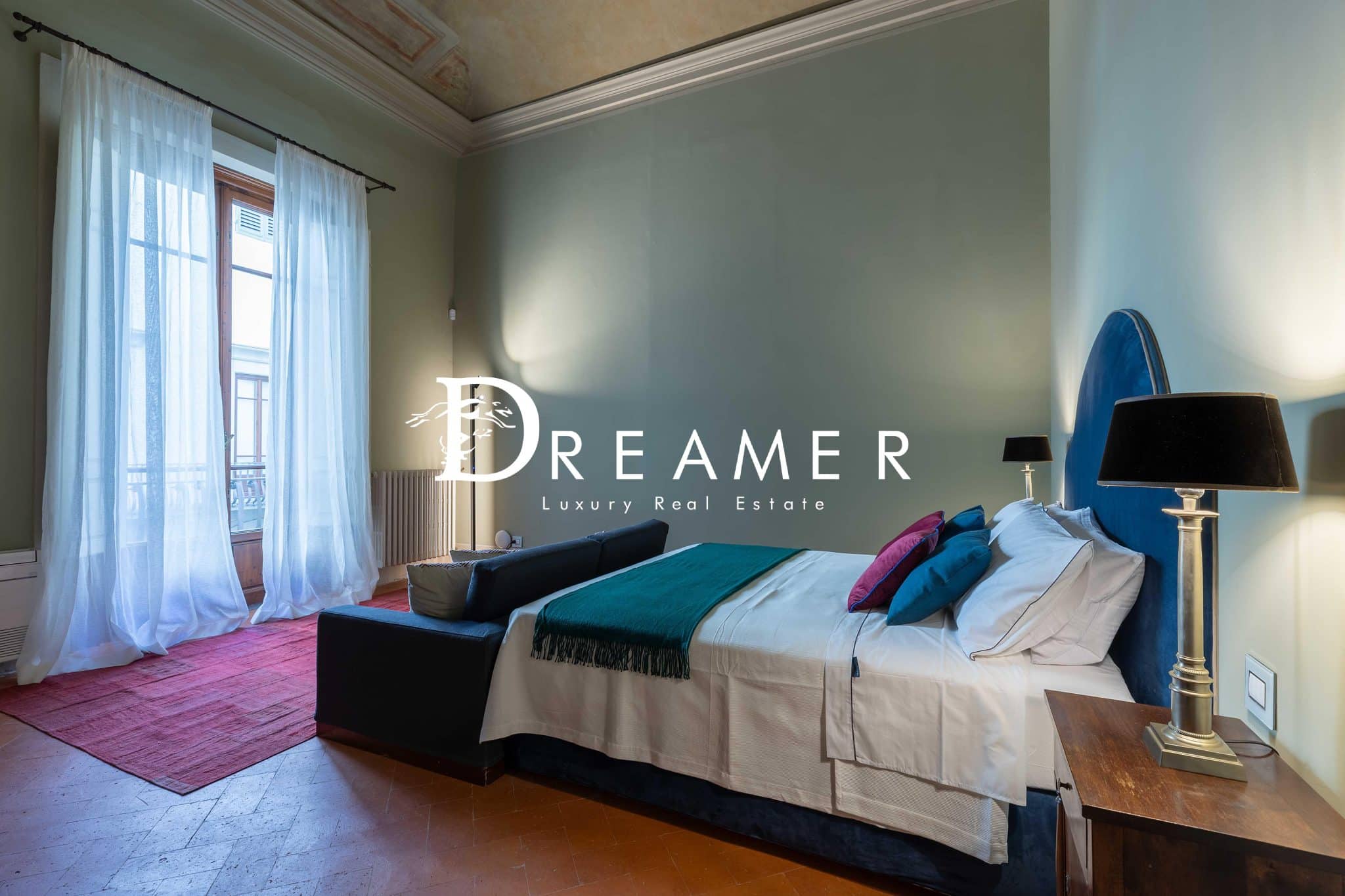 Magnificent frescoed apartment with garage and concierge service for rent in the heart of Florence, just steps from Santa Croce and the city’s main historic attractions. Located on the first floor of an elegant historic building with an elevator, this prestigious residence, recently renovated with meticulous attention to detail, offers approximately 300 sqm of refined interiors with four bedrooms and five bathrooms.
