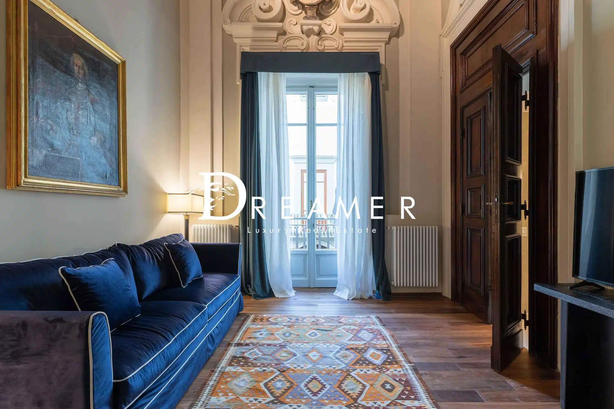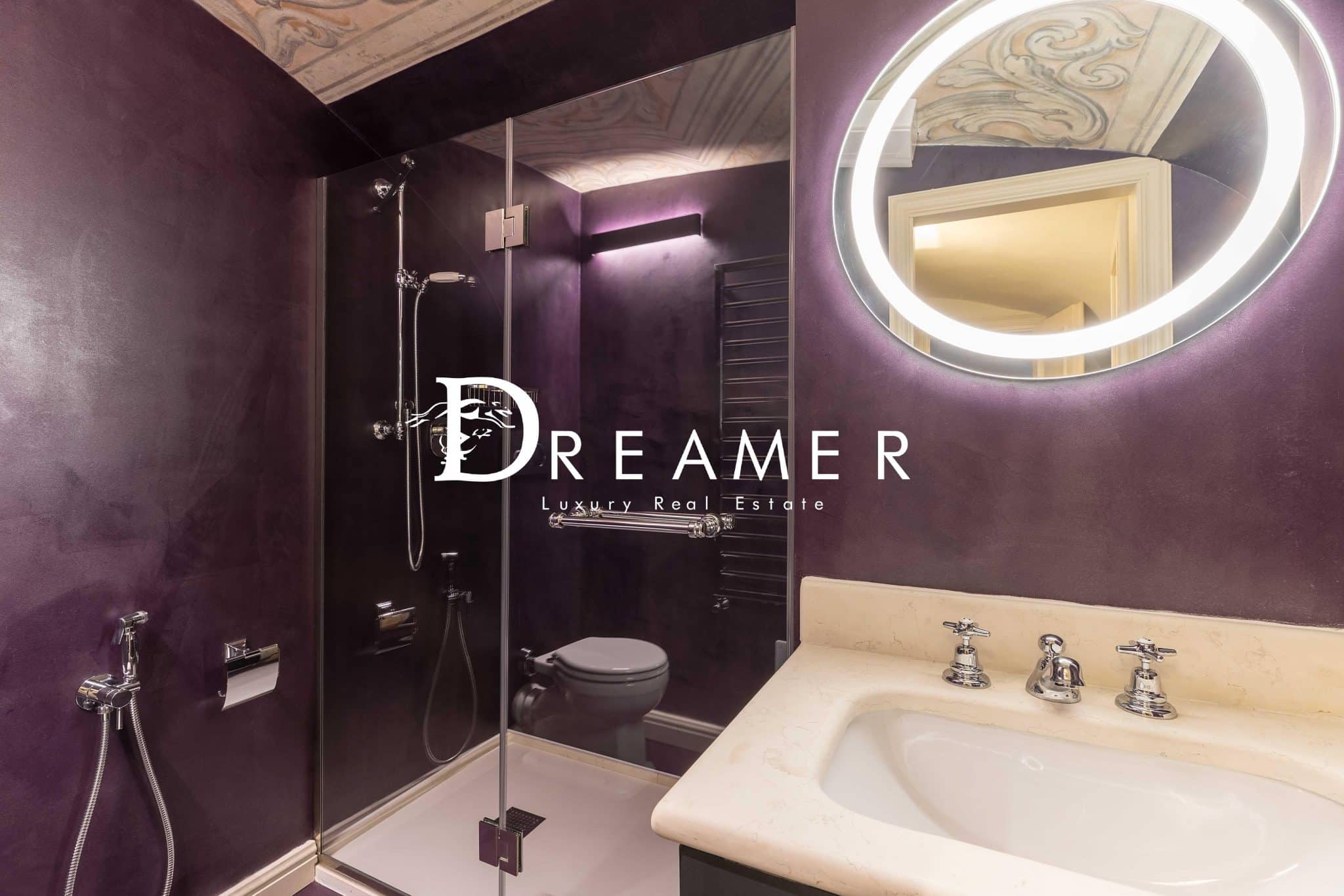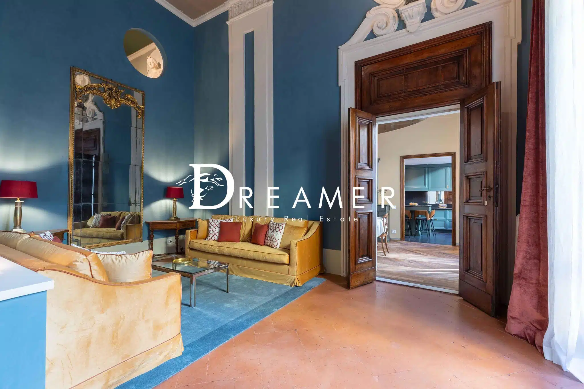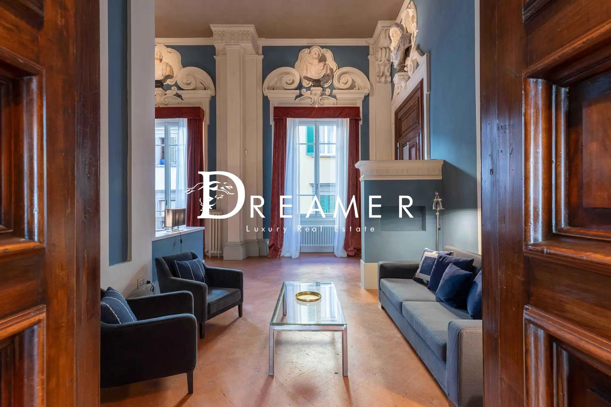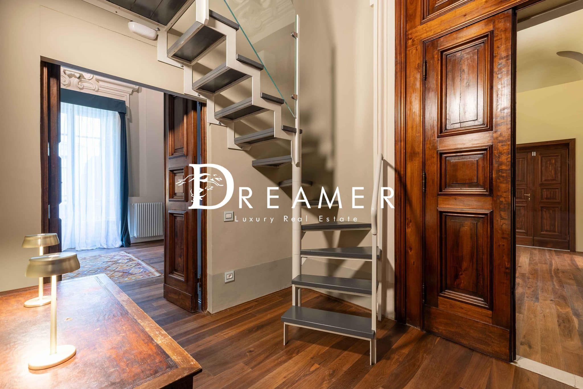 Magnificent frescoed apartment with garage and concierge service for rent in the heart of Florence, just steps from Santa Croce and the city’s main historic attractions. Located on the first floor of an elegant historic building with an elevator, this prestigious residence, recently renovated with meticulous attention to detail, offers approximately 300 sqm of refined interiors with four bedrooms and five bathrooms.