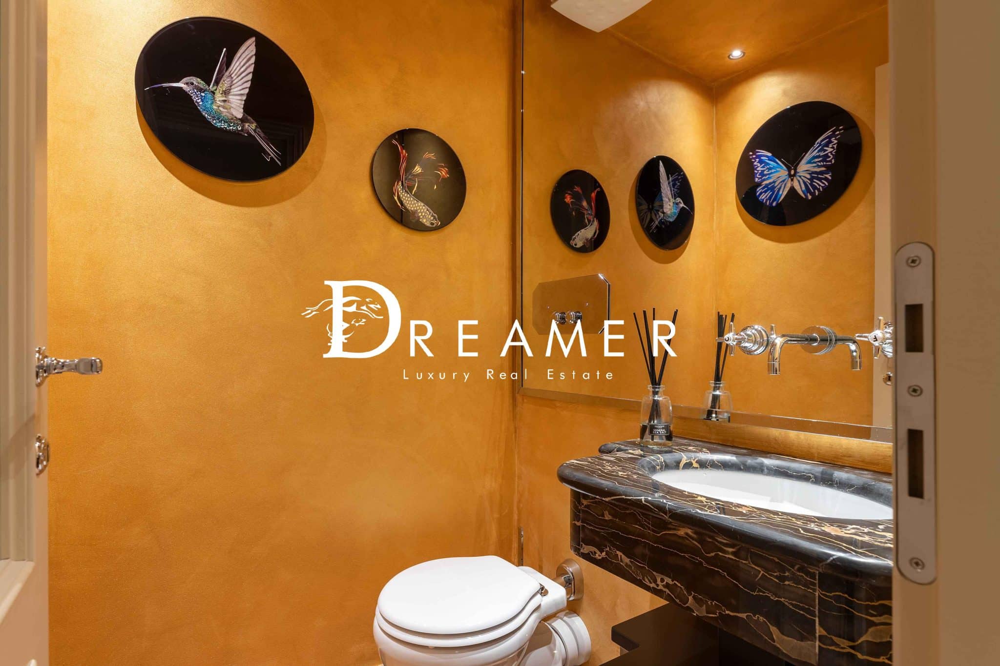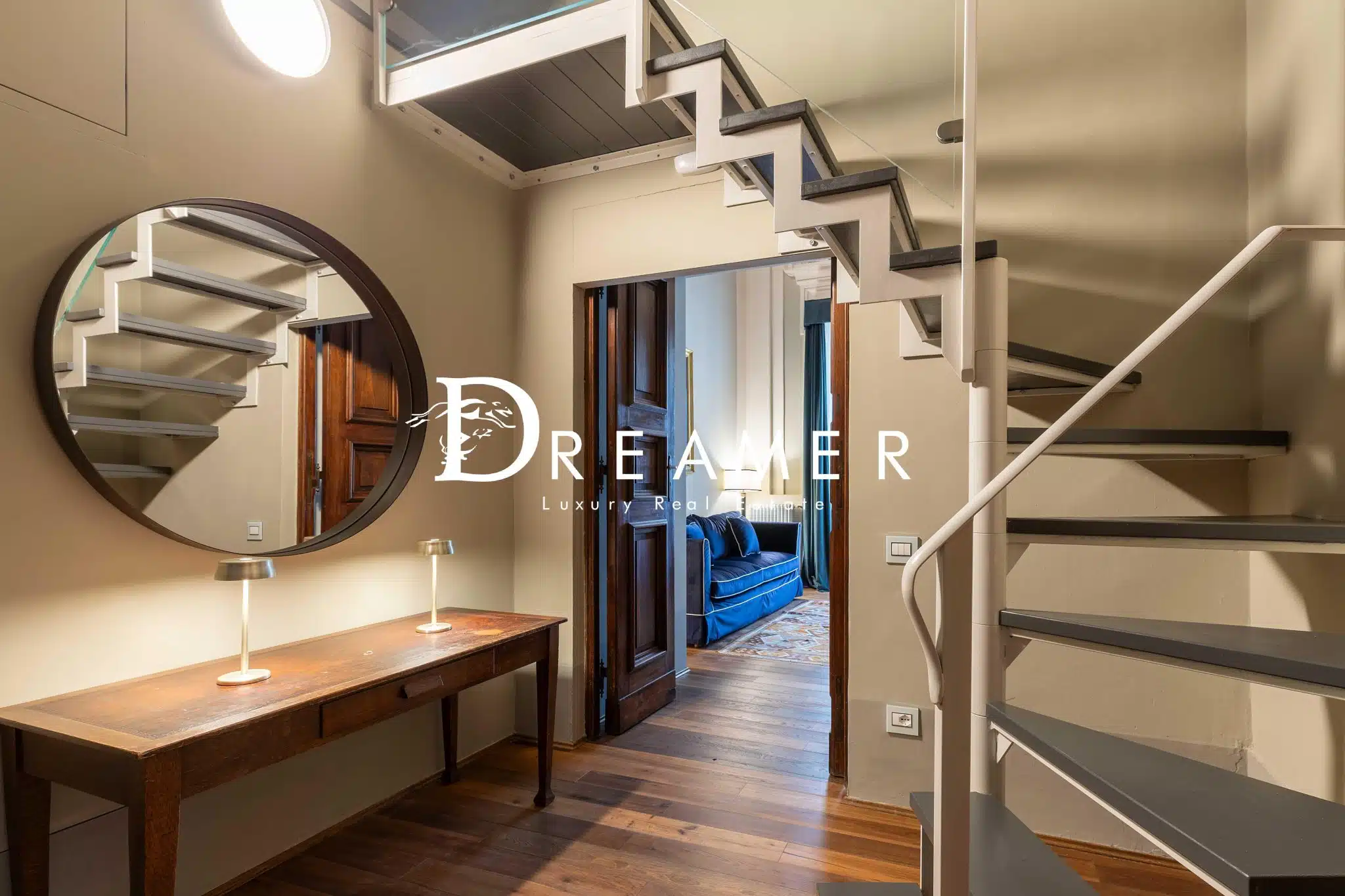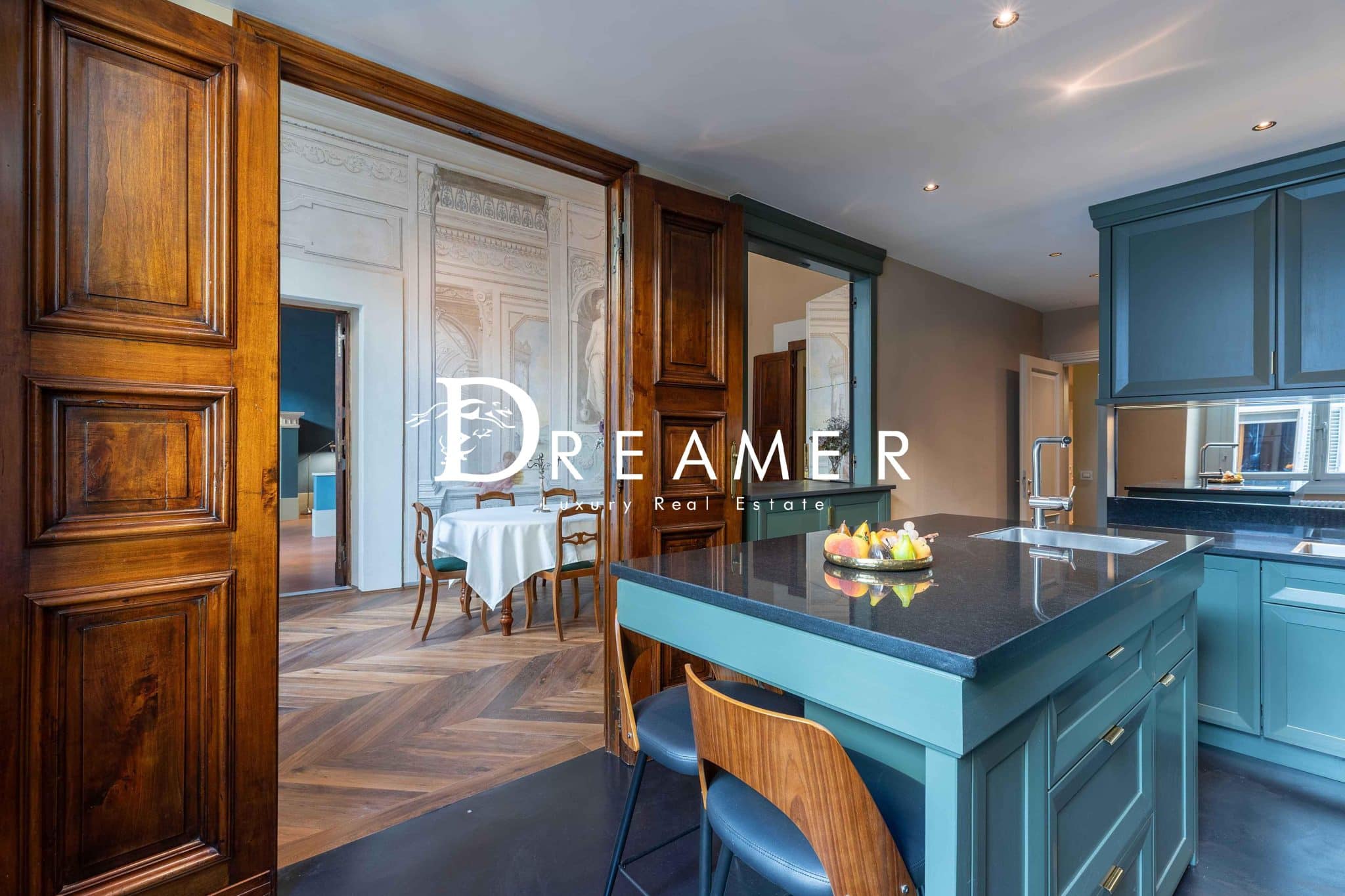 The main entrance leads to an elegant living area consisting of spacious and bright living rooms, a magnificent frescoed dining room that retains its original charm, and a fully equipped modern kitchen. The sleeping area includes four spacious suites with custom-built wardrobes, each with a private bathroom. Several mezzanines, totaling approximately 70 square meters, further enhance the property and can easily be adapted as a study, relaxation area, or additional guest space.