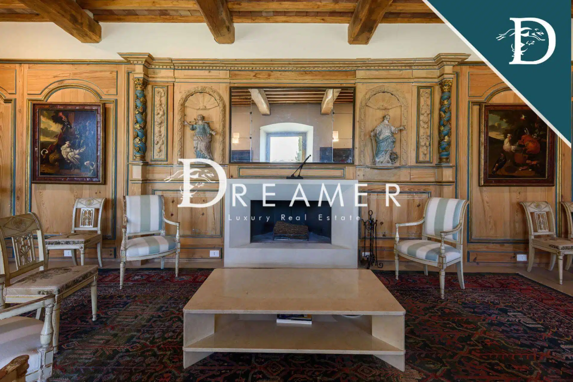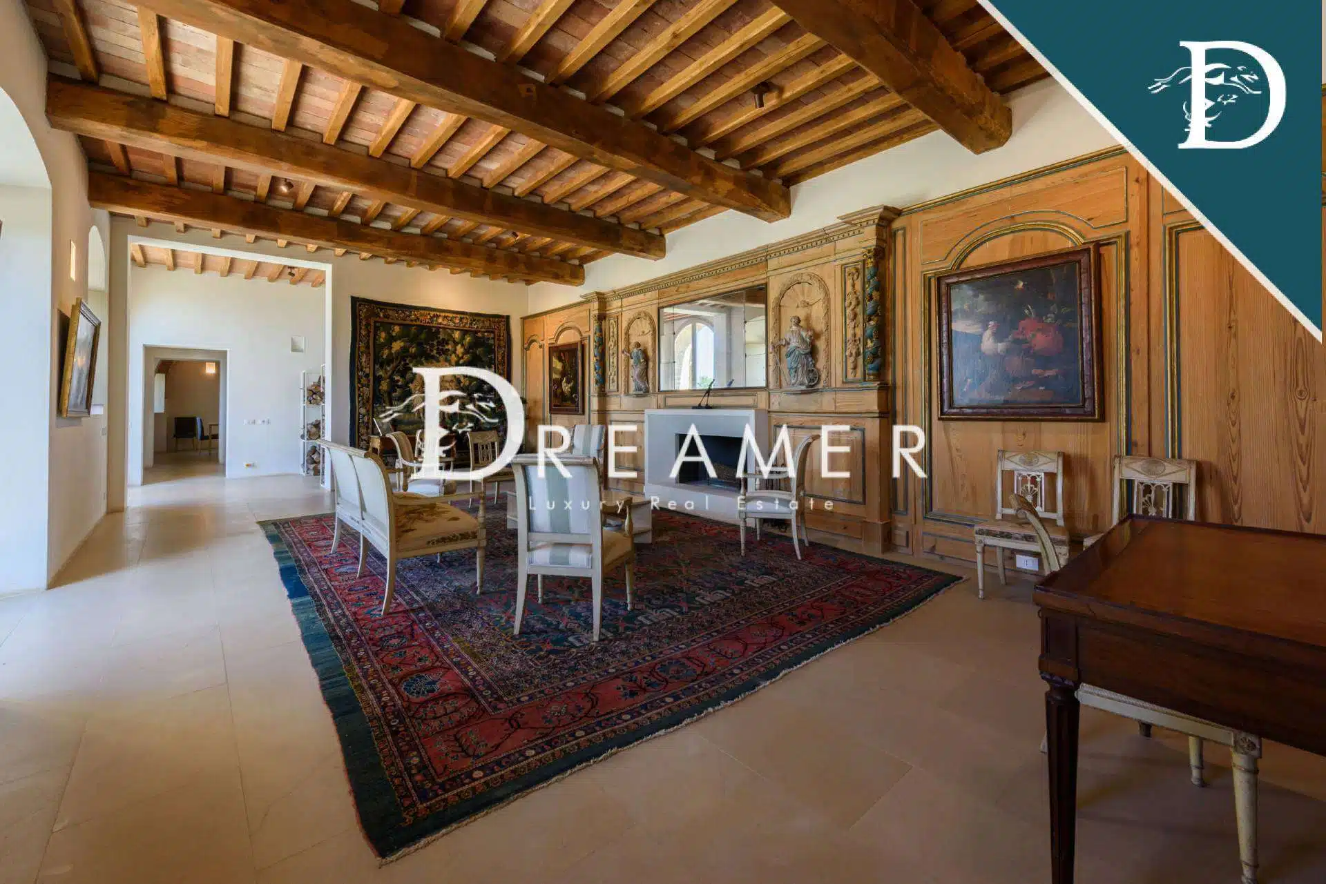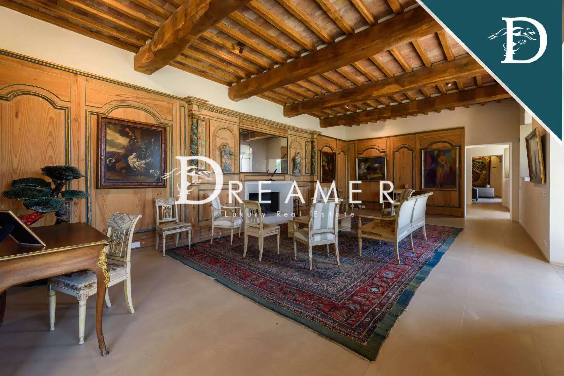 The large outdoor saltwater infinity pool is designed to be heated during the colder periods. 84 hectares of land surround the property, consisting of a fenced garden, fruit trees, arable land, 600 olive trees, and woods. A private well and three ponds provide water for irrigation. The property includes a large agricultural shed of approximately 275 sqm with photovoltaic panels on the roof.