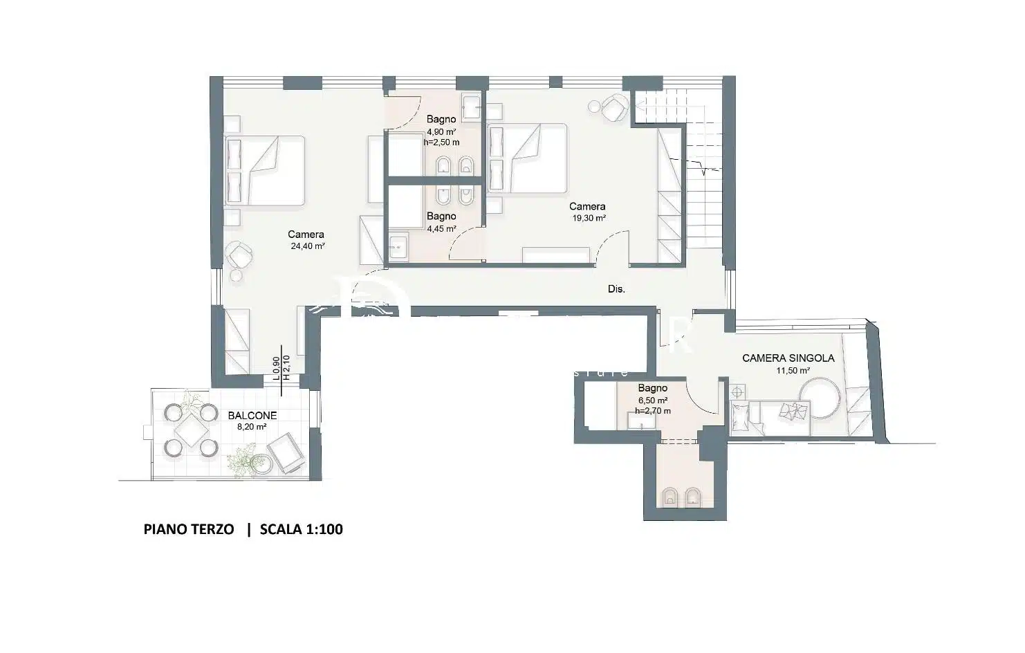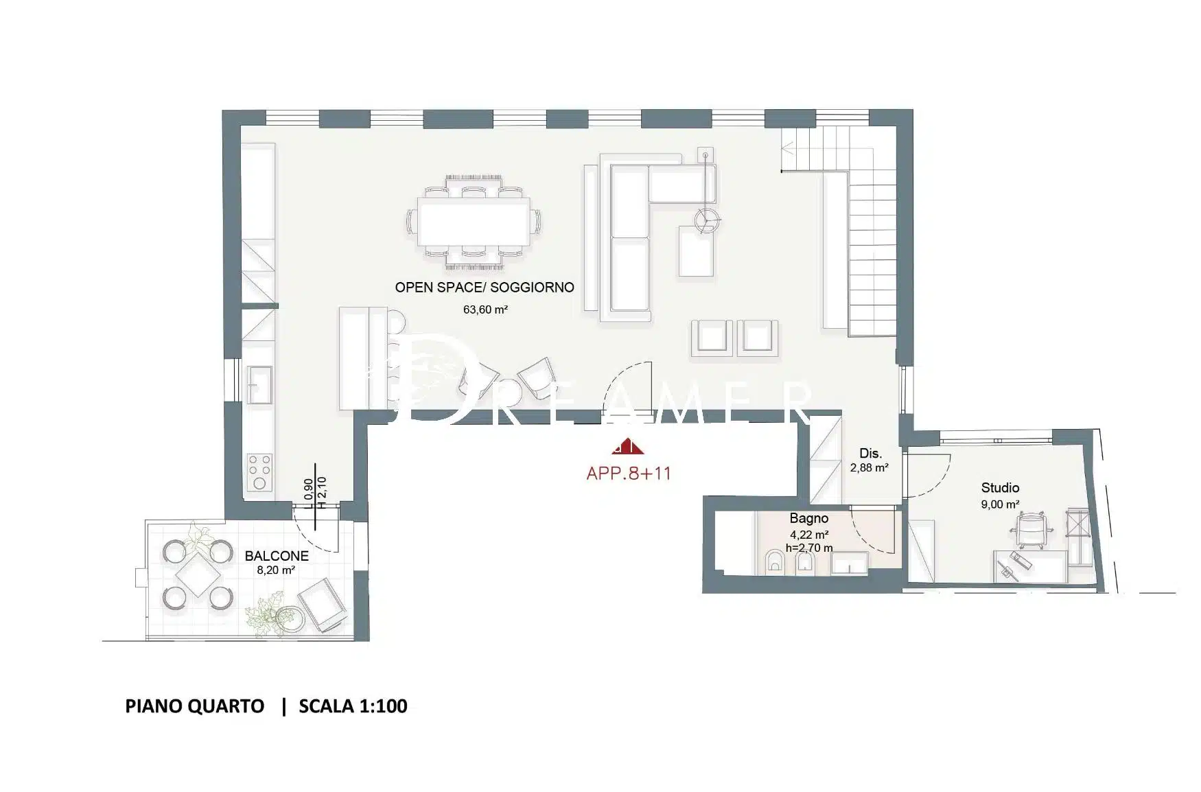 The apartment, located on the third and fourth floors, features a splendid 17 sqm terrace , perfect for relaxing outdoors and for expanding the liveability of the interior spaces.
