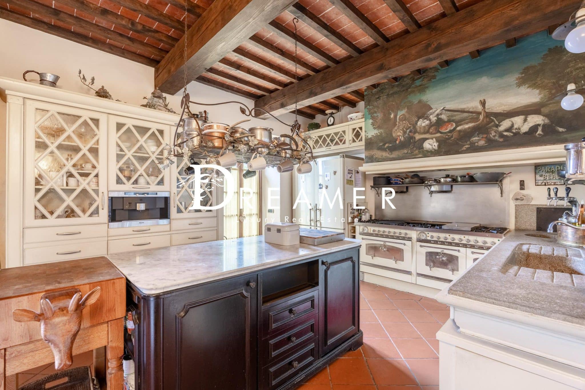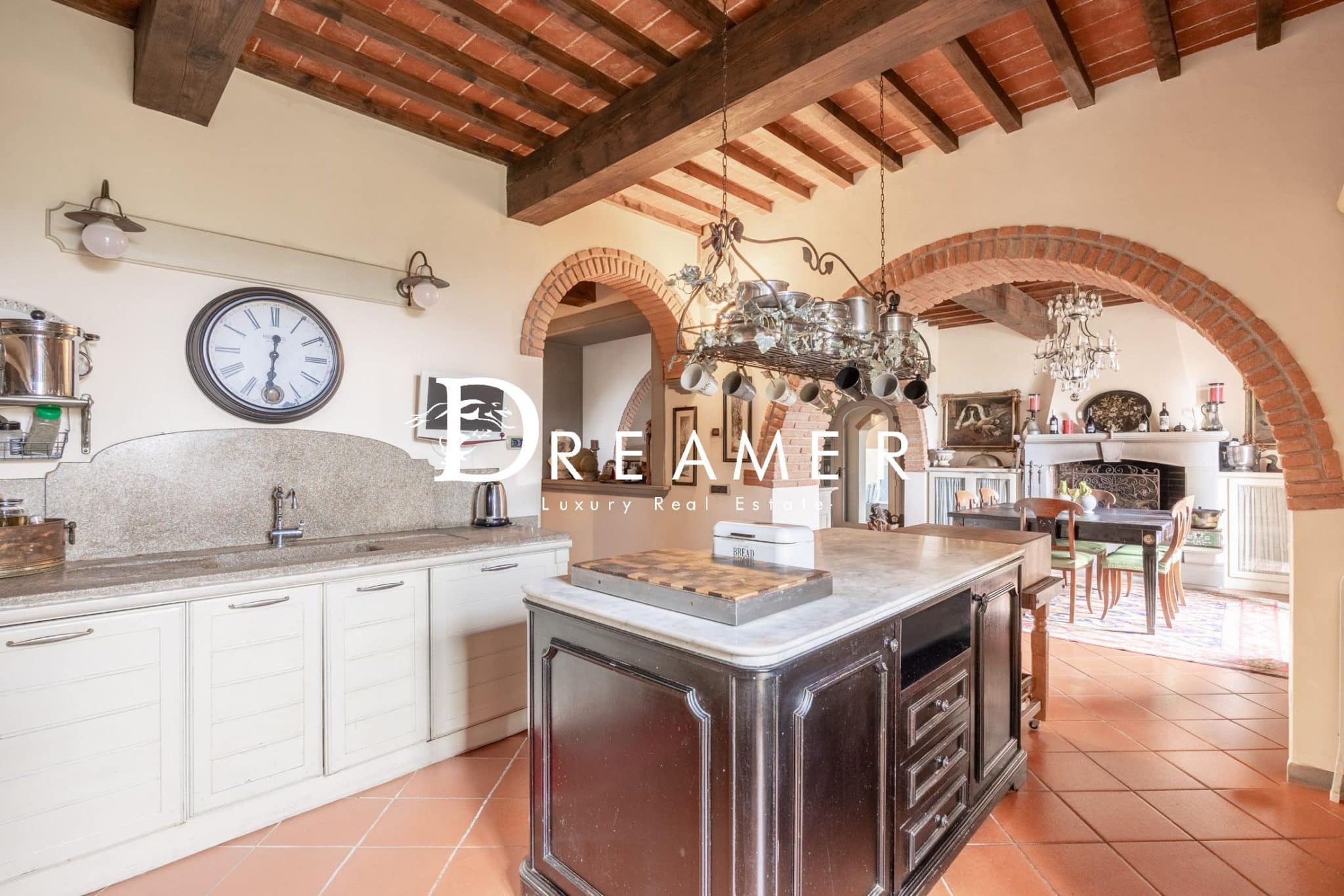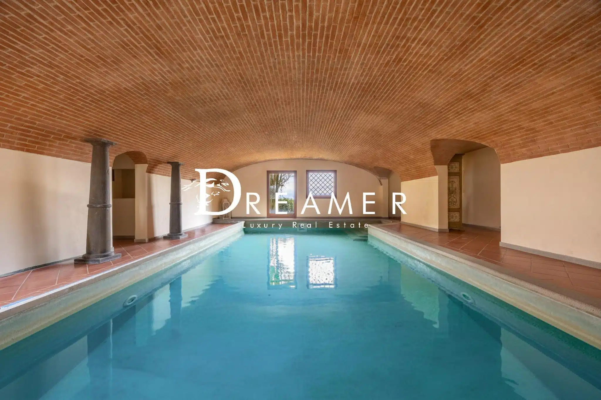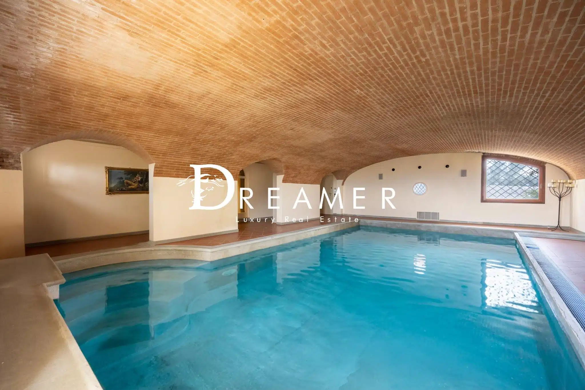The entrance leads to the living area, consisting of a magnificent double reception room with exposed wooden beams and an elegant stone fireplace. Also here is a dining room and a comfortable guest bathroom. On the lower level is a large eat-in kitchen, flanked by a second dining room with a fireplace and a welcoming living area. The entire space opens onto a splendid outdoor terrace, ideal for al fresco lunches and dinners. This floor also provides access to the exclusive private wellness area. This true haven of well-being includes a heated indoor pool, changing rooms, showers, a gym, a laundry room, and a large cellar. The sleeping area, located on the first floor, features four elegant double bedrooms, two of which have en suite bathrooms, and an additional bathroom.