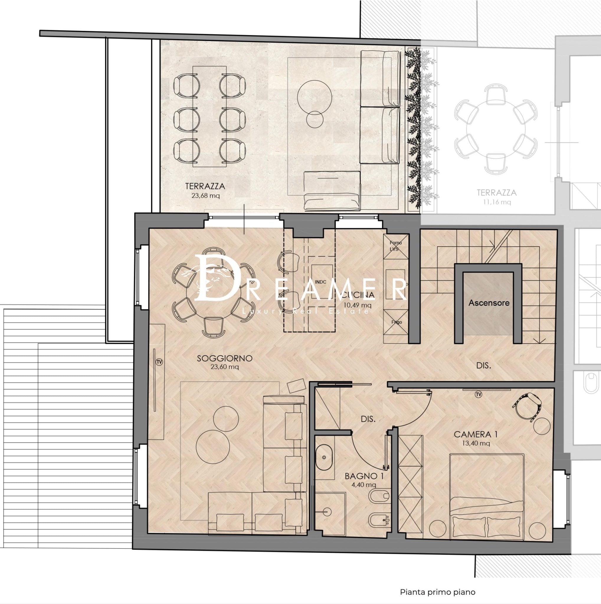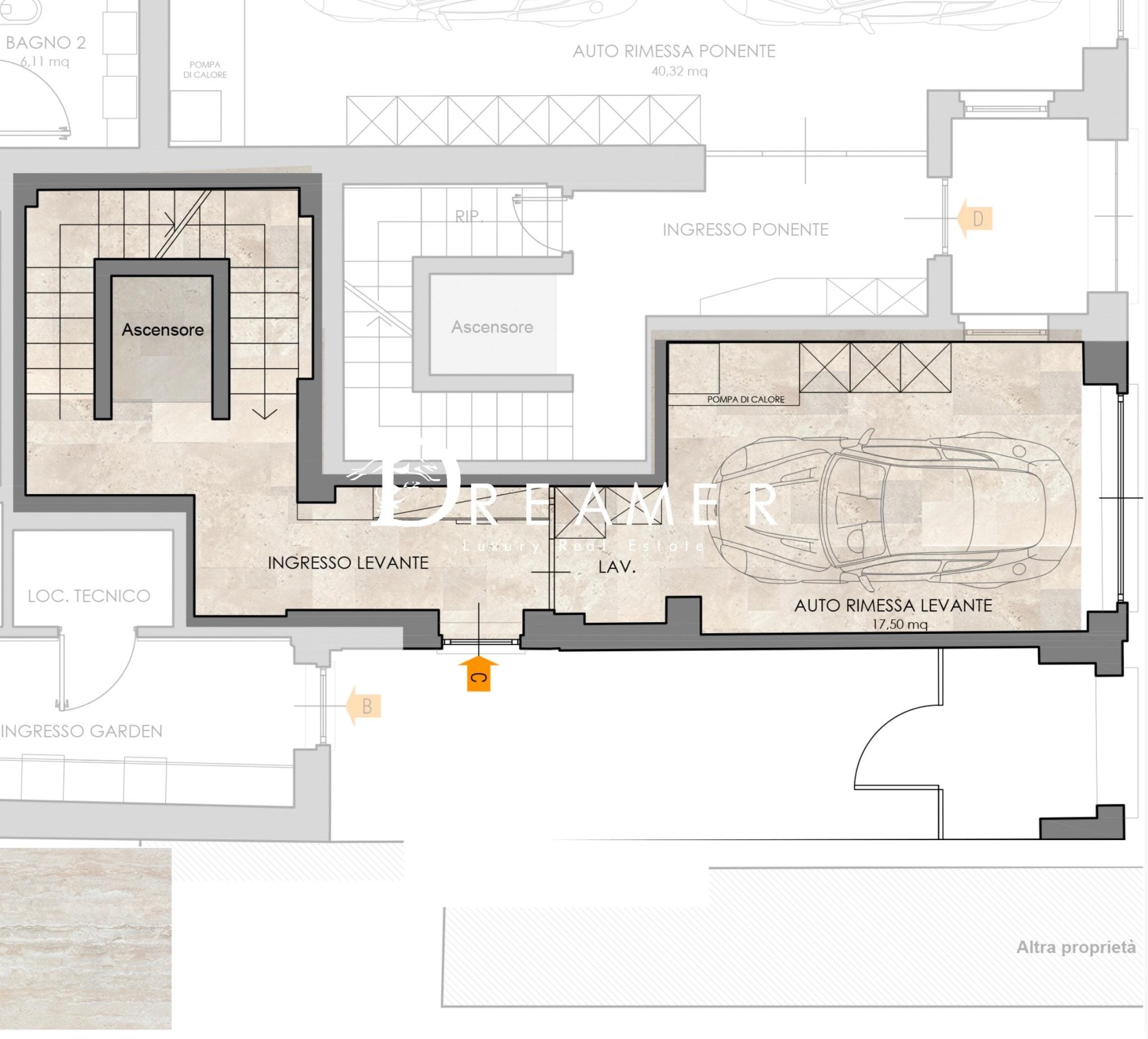 On the ground floor, the driveway leads directly to the private garage, which can easily accommodate a large vehicle. A private pedestrian entrance leads to the hallway leading to the staircase and elevator shaft, while a convenient laundry room completes this level, designed to optimize the functionality of everyday functionality.