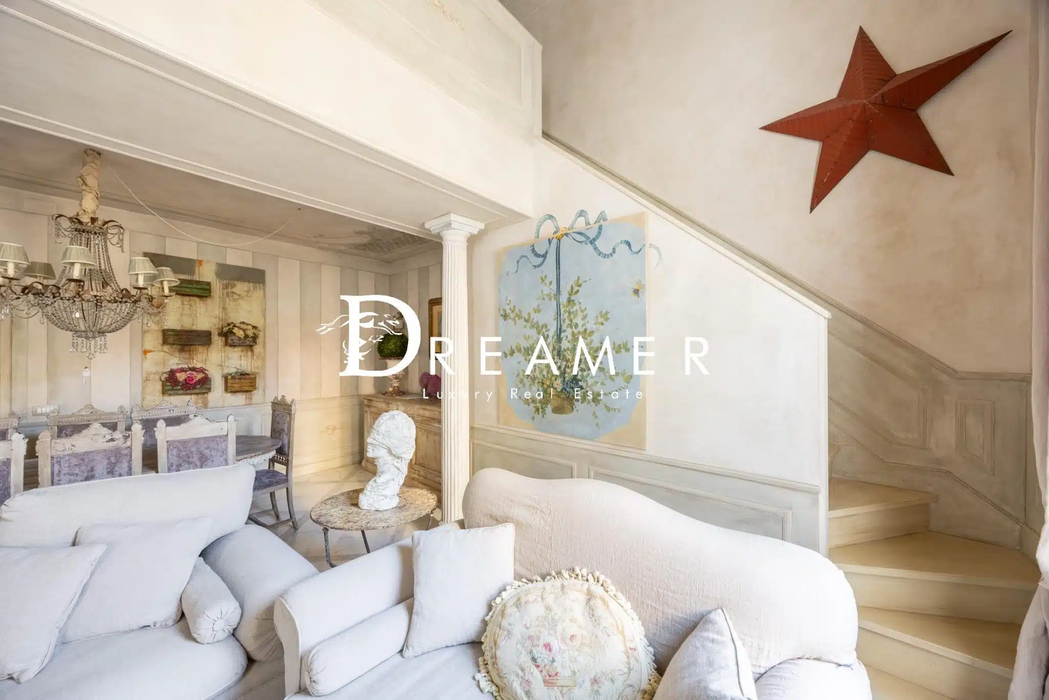 The entrance leads to a spacious living area, comprising an elegant living room with dining area, an eat-in kitchen with custom-built furniture, and a refined sitting room, ideal as a relaxation area or study. The first level is completed by a bathroom and a bedroom, from which an internal staircase leads to the mezzanine level. The mezzanine level houses a second bedroom, a second bathroom, a laundry room, and a spacious walk-in closet. An additional room can easily be converted into a third bedroom or study, offering great versatility in the layout of the space.