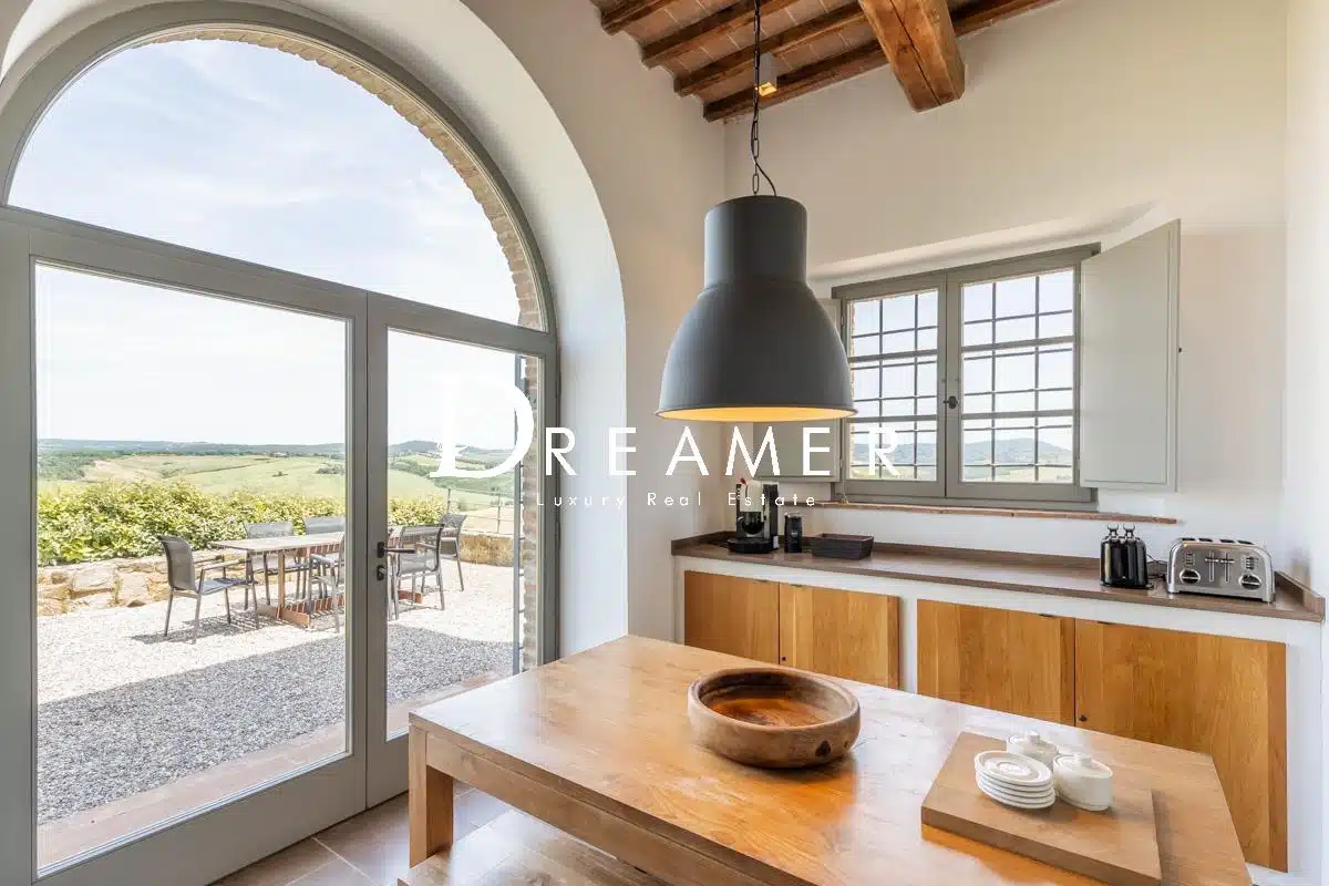 Located in the municipality of Asciano, the property is surrounded by an enchanting landscape characterized by rolling hills, cypress trees and hilltop villages such as San Giovanni d’Asso, Montalcino and Siena. Finally, thanks to its strategic shape and unique location, the farmhouse is ideal for use as a private residence but also for weddings and events.