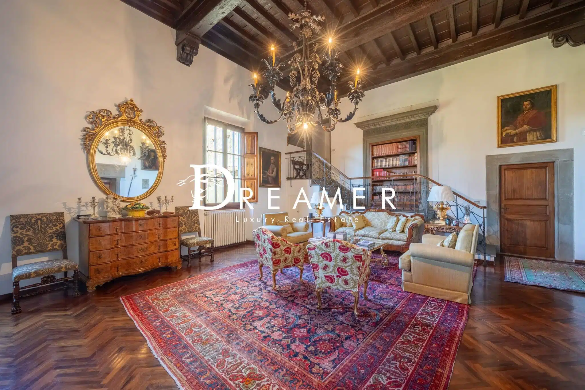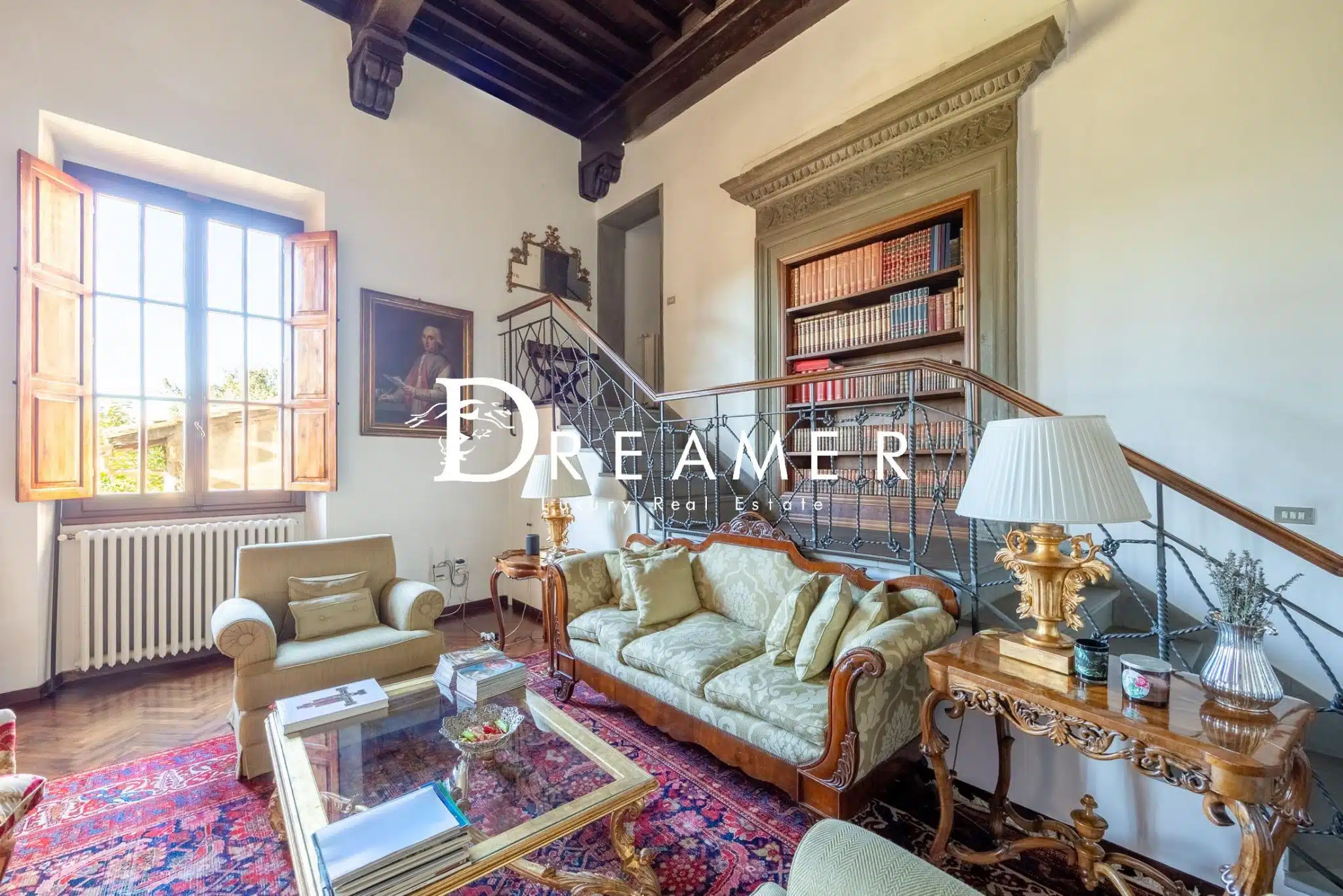 Prestigious portion of a villa for sale in the exclusive hillside setting of Marignolle, just 20 minutes from the historic center of Florence. The property extends over multiple levels, totaling approximately 590 sqm, with 5 bedrooms and 5 bathrooms, as well as a beautiful private courtyard.