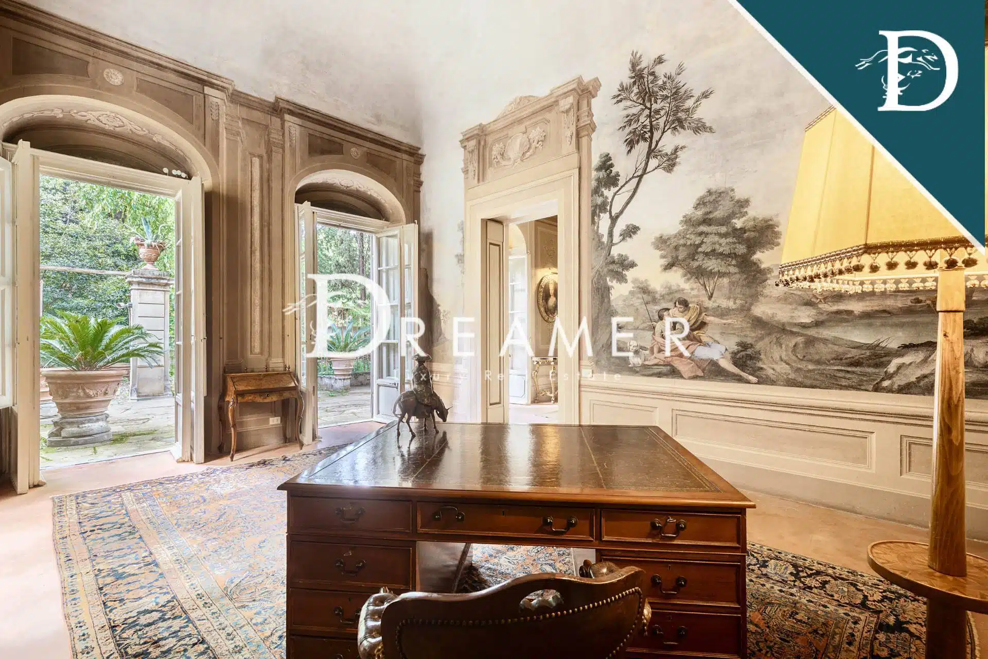 Stepping into this magnificent home, one is immediately enveloped in an atmosphere of refined grandeur. The spacious reception halls, adorned with high, frescoed ceilings and intricate stuccoes, are bathed in natural light from large windows overlooking the private garden. The dining rooms, decorated with antique sculptures, offer an exquisite setting for sophisticated entertaining. The sleeping quarters comprise 4 resplendent double bedrooms, each a masterpiece of proportion and detail, with en-suite marble-clad bathrooms. The master suite boasts direct access to the lush garden and is complemented by a spacious walk-in wardrobe. A delicate wooden staircase leads to a mezzanine level, an intimate retreat that can serve as a reading nook or additional bedroom, offering views onto the palazzo’s picturesque internal courtyard.