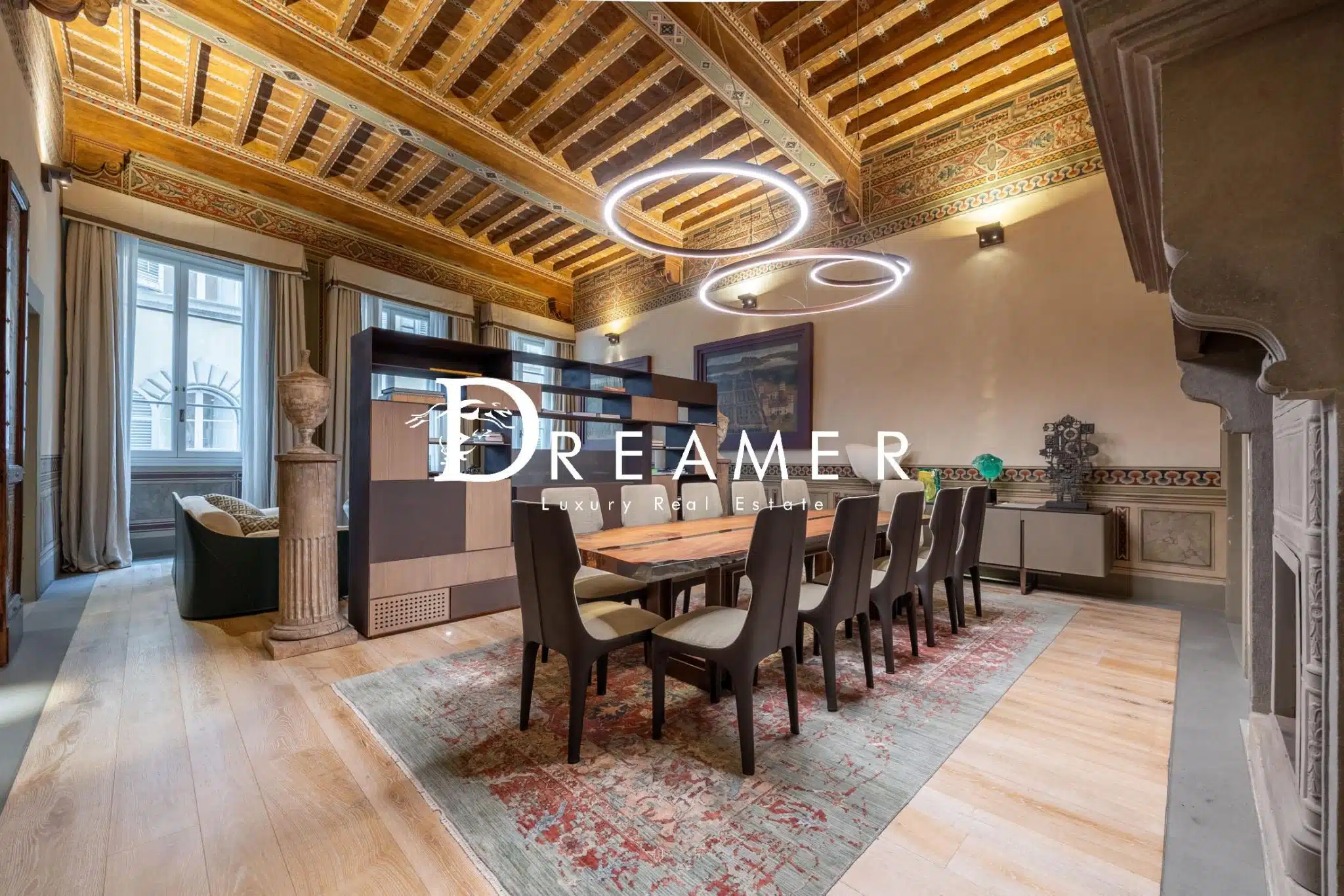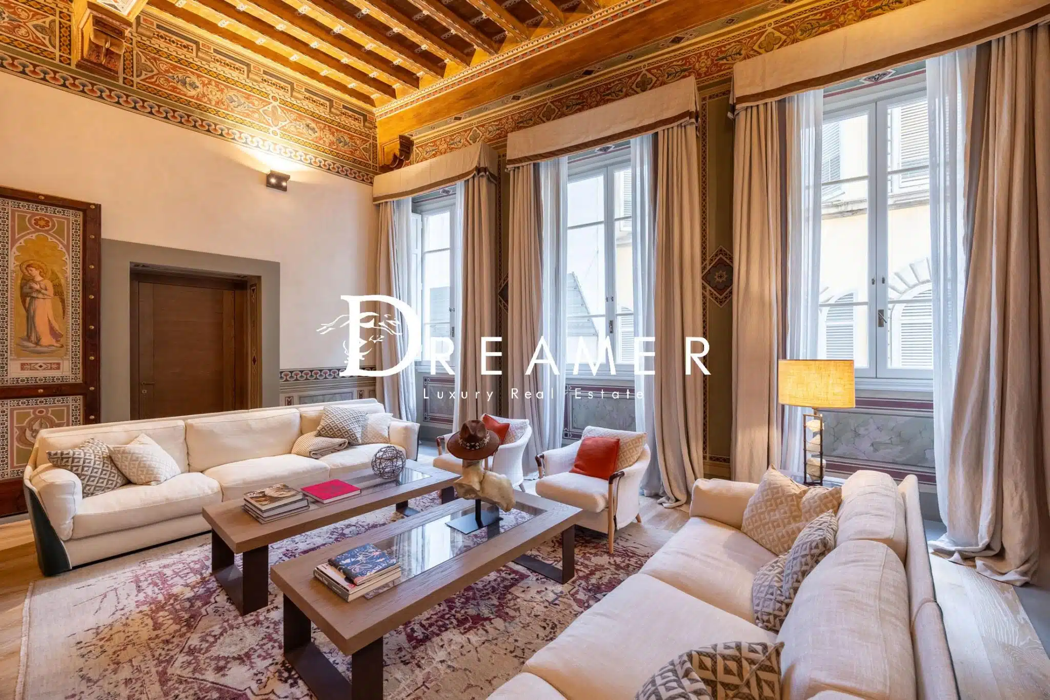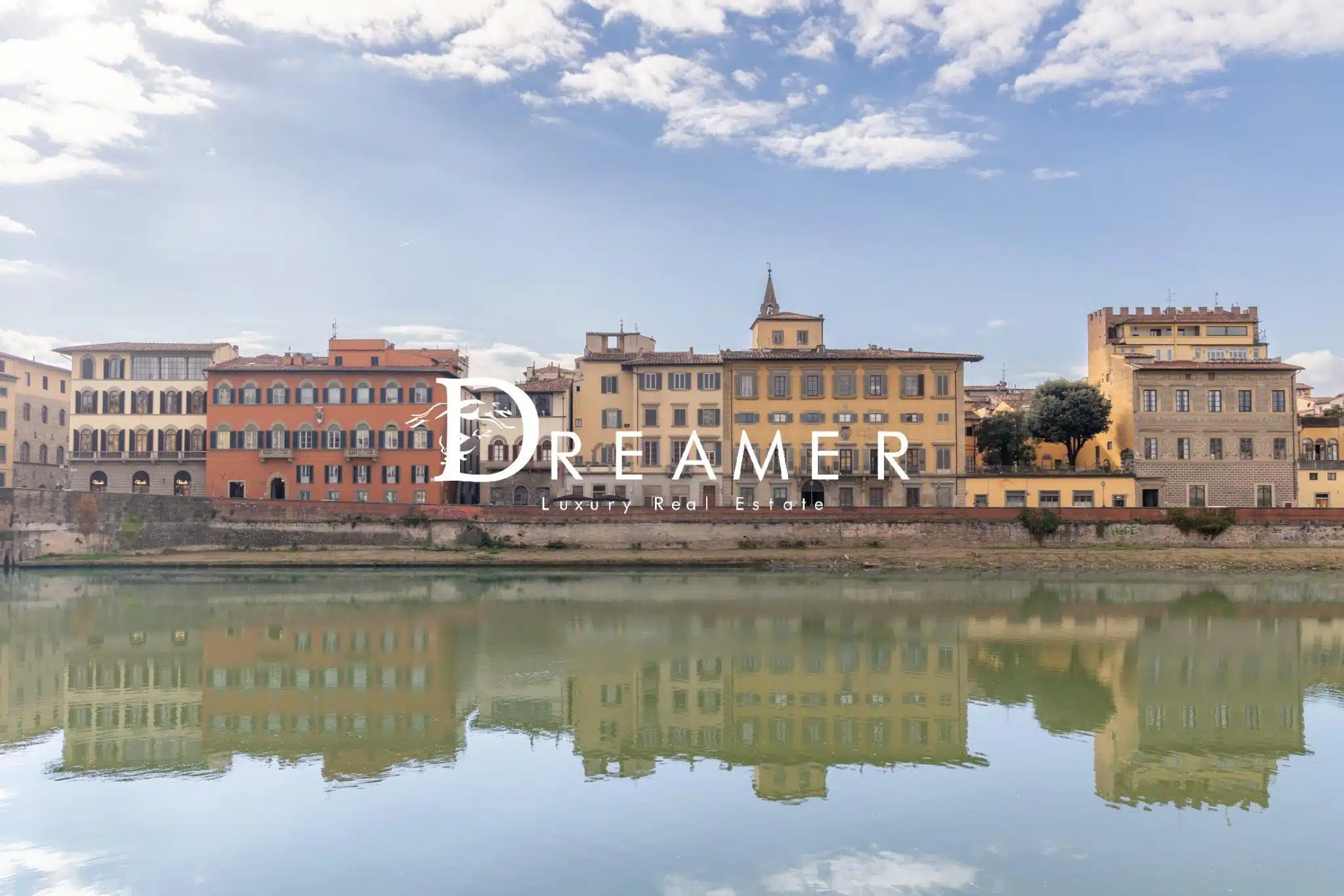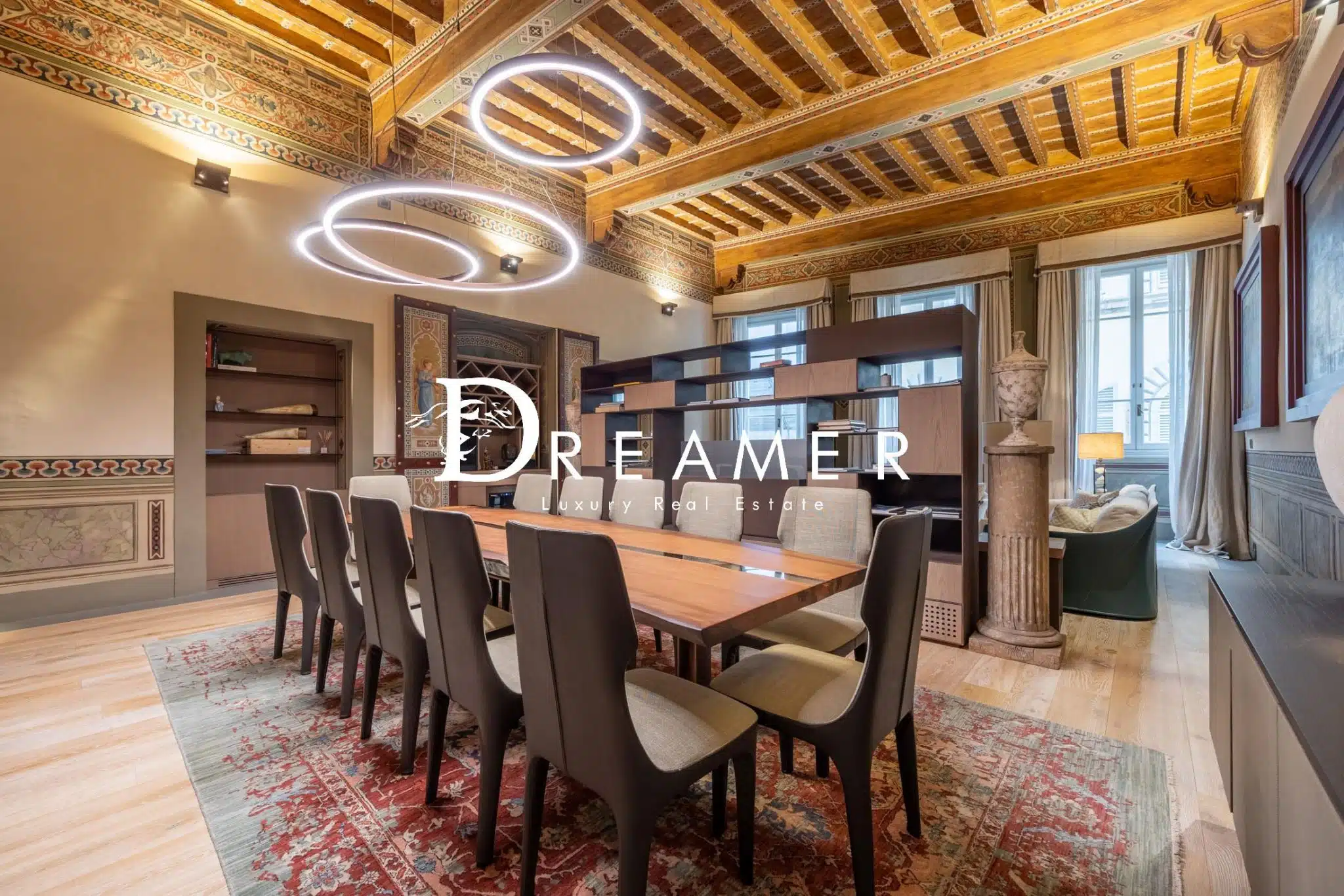 Exclusive completely renovated modern apartment with frescoes for sale in central Florence. Located on the first floor of a stately building on Lungarno Guicciardini, the property has been tastefully furnished with designer furniture and comprises a total of 360 sqm with 3 bedrooms and 4 bathrooms.