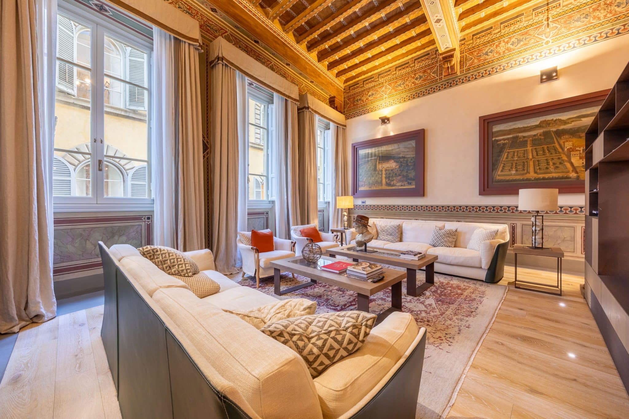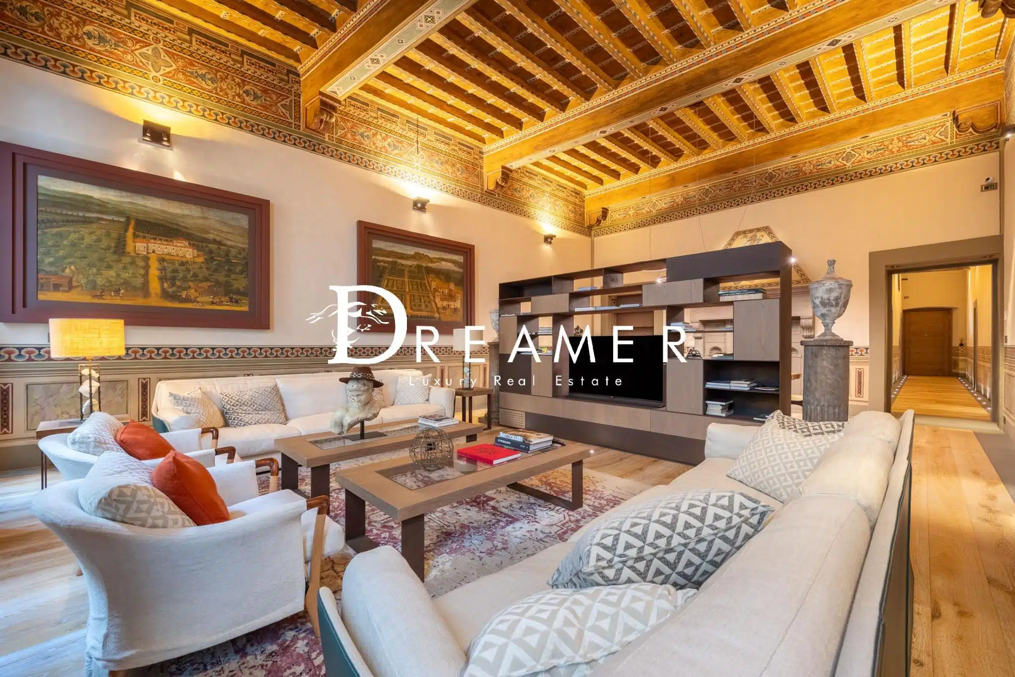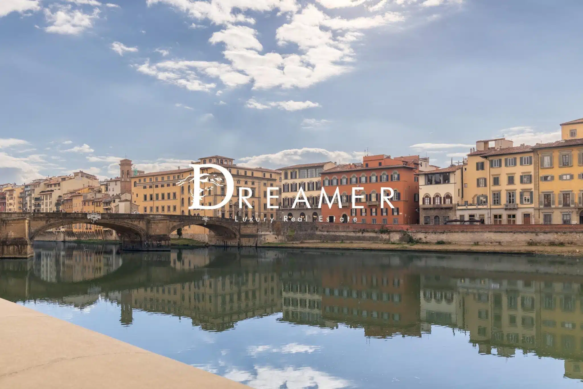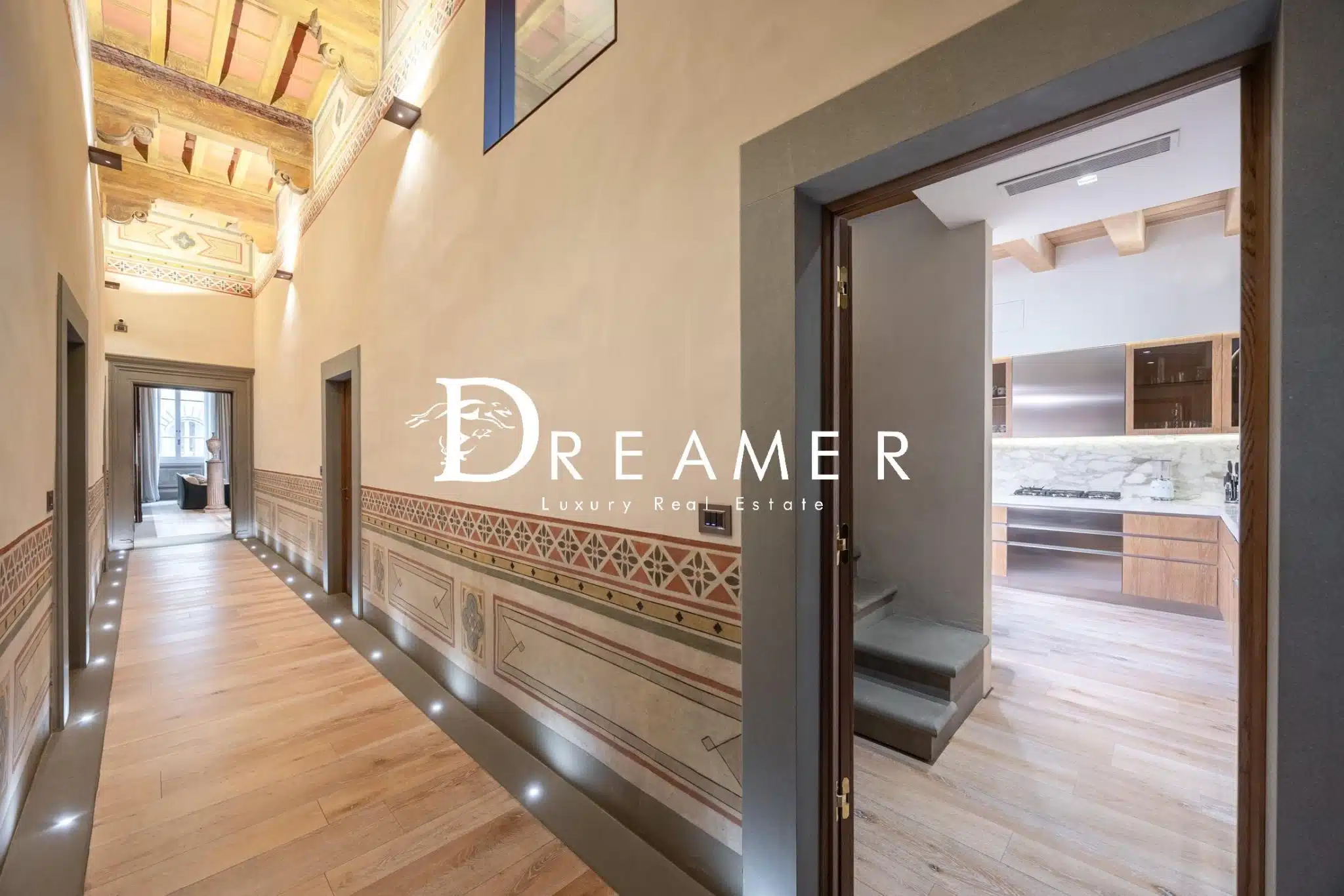 Exclusive completely renovated modern apartment with frescoes for sale in central Florence. Located on the first floor of a stately building on Lungarno Guicciardini, the property has been tastefully furnished with designer furniture and comprises a total of 360 sqm with 3 bedrooms and 4 bathrooms.