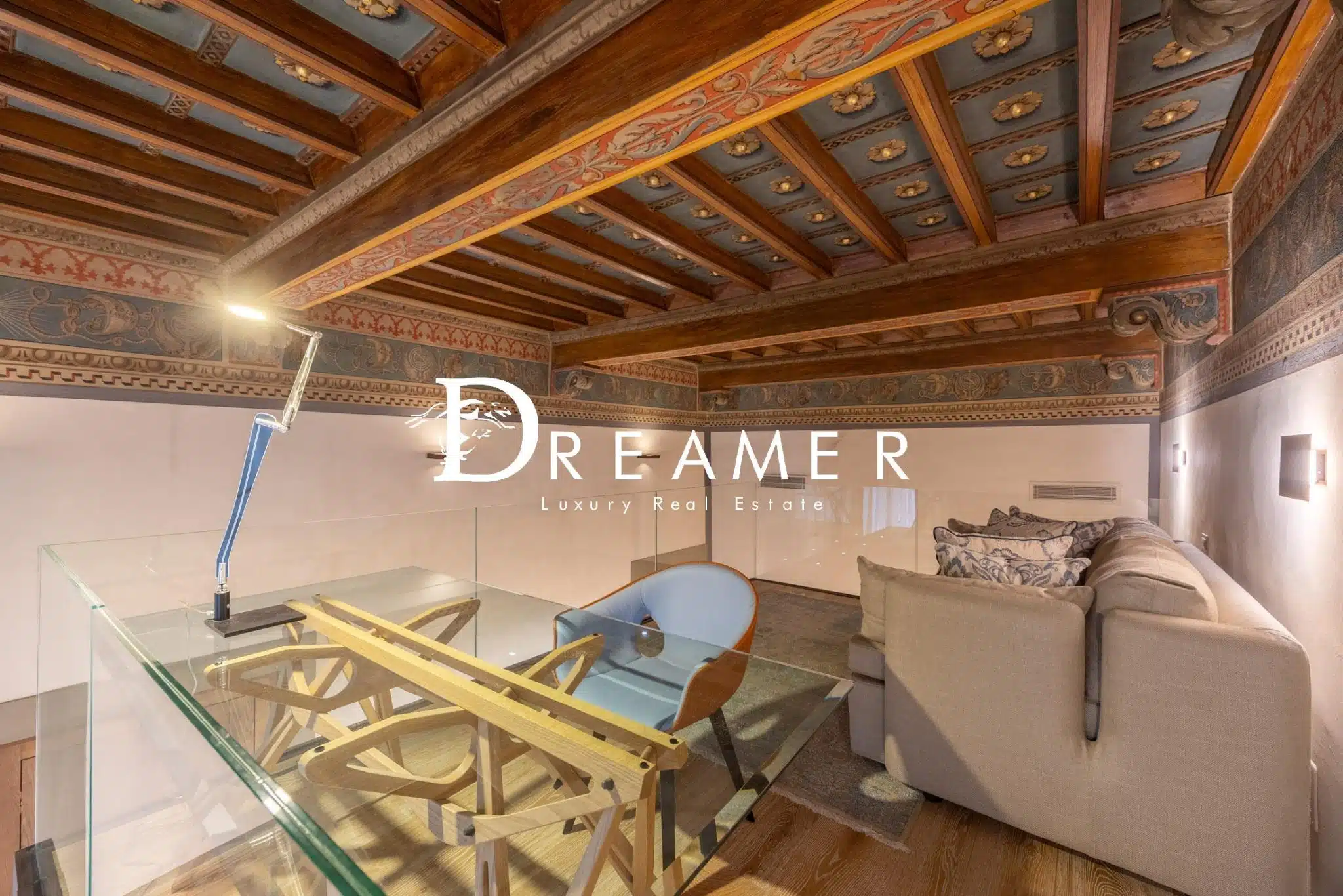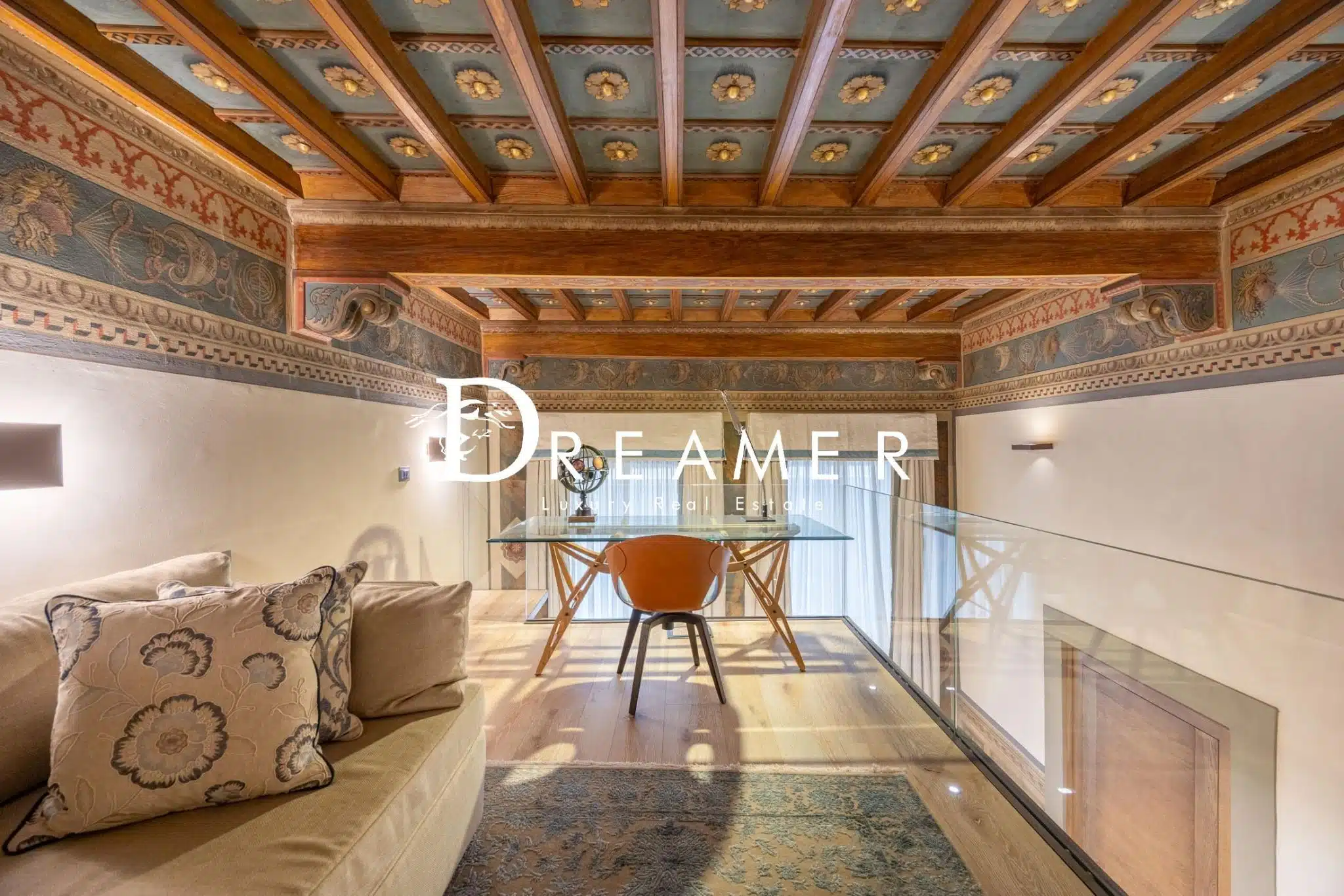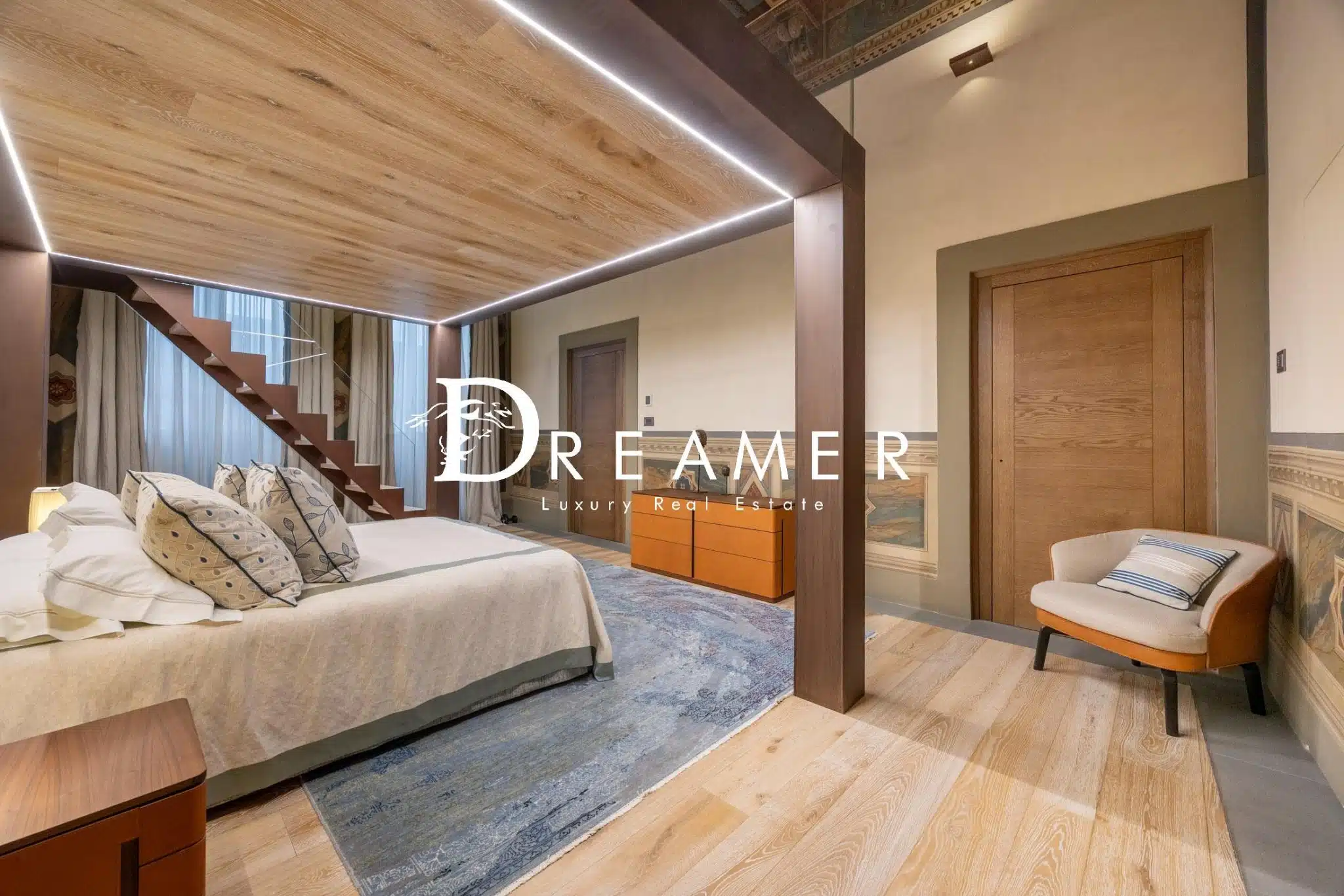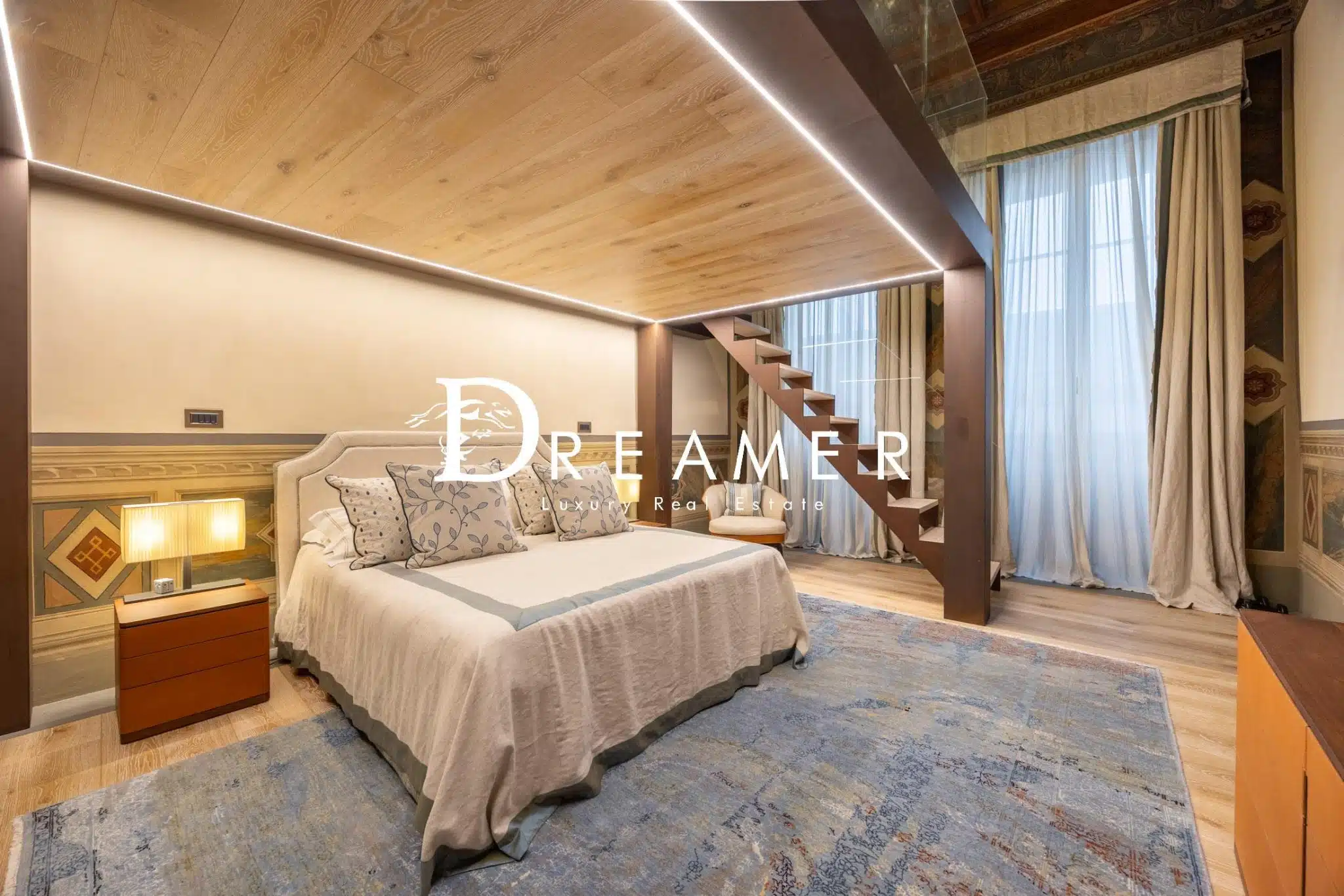 An elegant entrance hall with high ceilings leads to the apartment. The living area opens onto a spacious reception room embellished with refined décor, parquet floors, and a fireplace, with large windows overlooking one of the most iconic streets in the Oltrarno district. The living area is completed by a splendid eat-in kitchen with a glass ceiling, equipped with every comfort. This modern apartment features a dining room, a convenient guest bathroom, and practical built-in wardrobes. The sleeping area comprises three bedrooms, two with private bathrooms and one with a mezzanine. The apartment is also equipped with air conditioning and a state-of-the-art home automation system.
