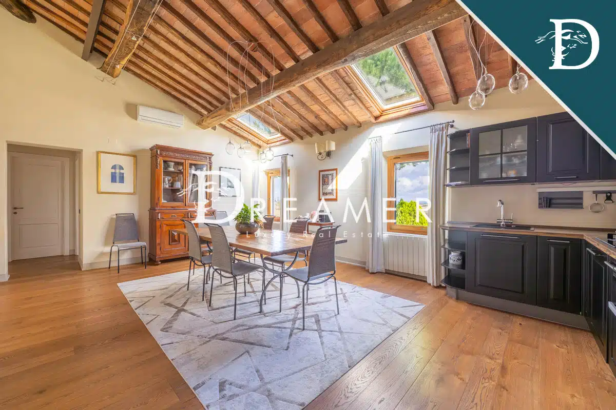 Outside, the farmhouse is surrounded by 1.5 ha of land, which host a magnificent garden and a splendid swimming pool with solarium area. Perfect for relaxing with a breathtaking view. The property also has a building permit that allows for any extensions, as it is not subject to landscape restrictions. Numerous parking spaces and a spacious garage complete the estate.
