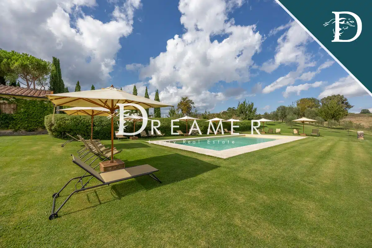 Stunning estate with pool for sale in the Tuscan hills, between the Crete Senesi and the Val d’Orcia. The property, surrounded by a park of about 1.5 ha, extends over a total surface area of about 760 sqm. It houses 13 bedrooms and 9 bathrooms and was the subject of a careful renovation in 2020.