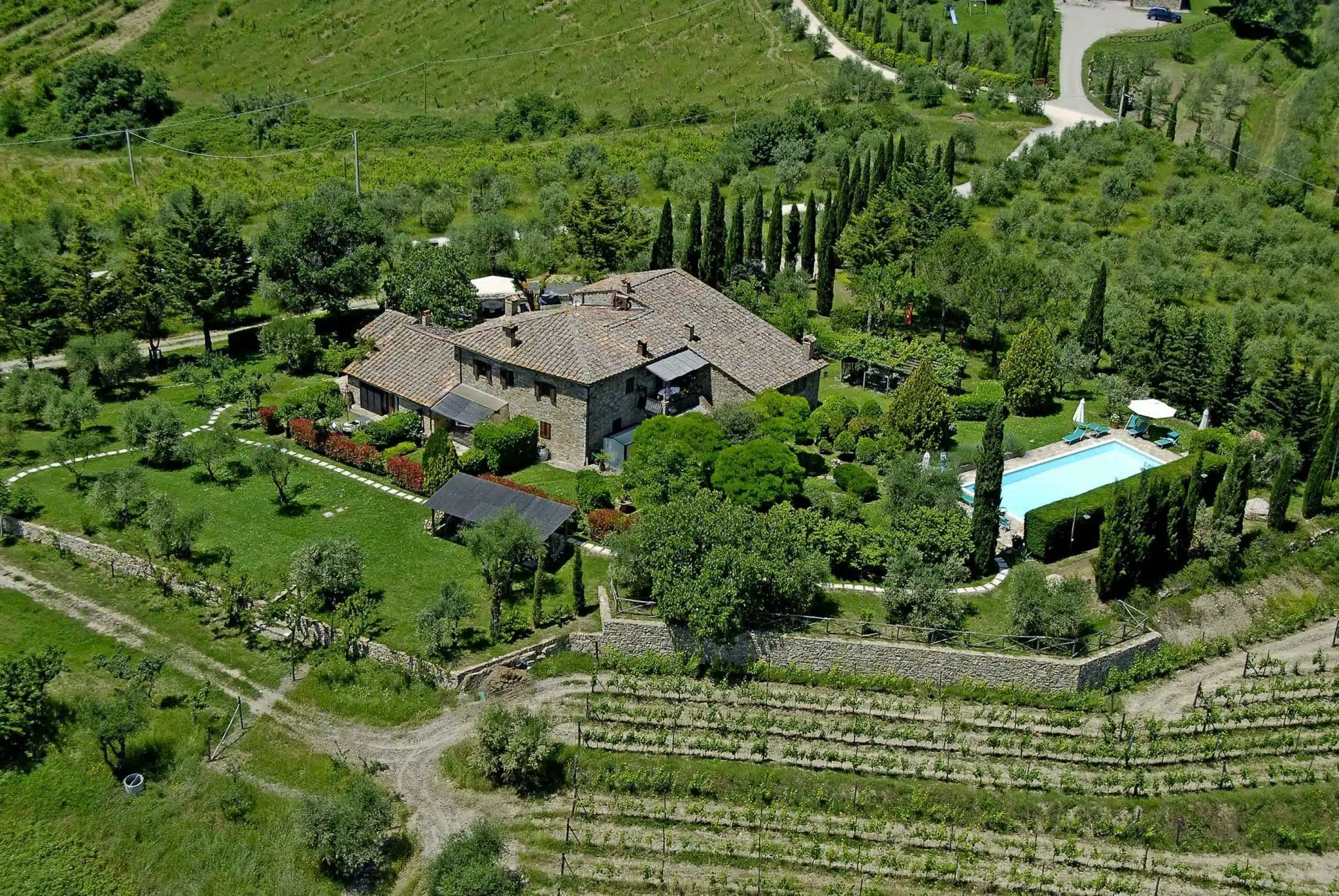 Charming organic wine estate with a swimming pool for sale in the hills of Castellina in Chianti, comprising a splendid two-level stone main villa and two independent apartments, totaling approximately 500 sq m. It presents 4 bedrooms and 6 bathrooms, as well as a cellar, rural outbuildings, and areas dedicated to agricultural production.