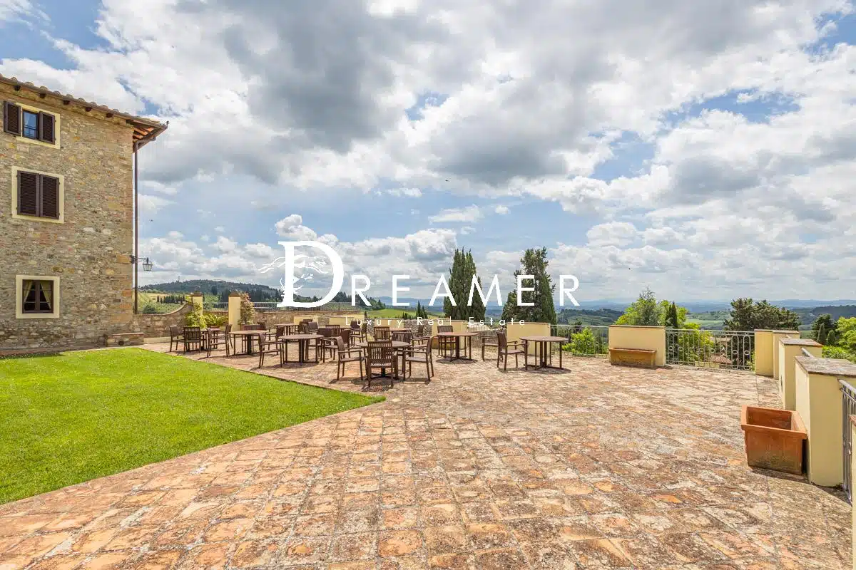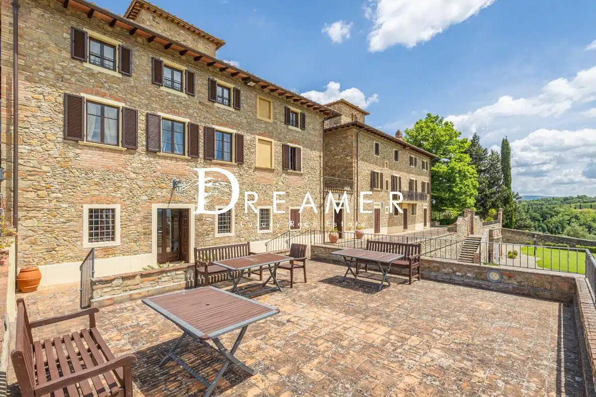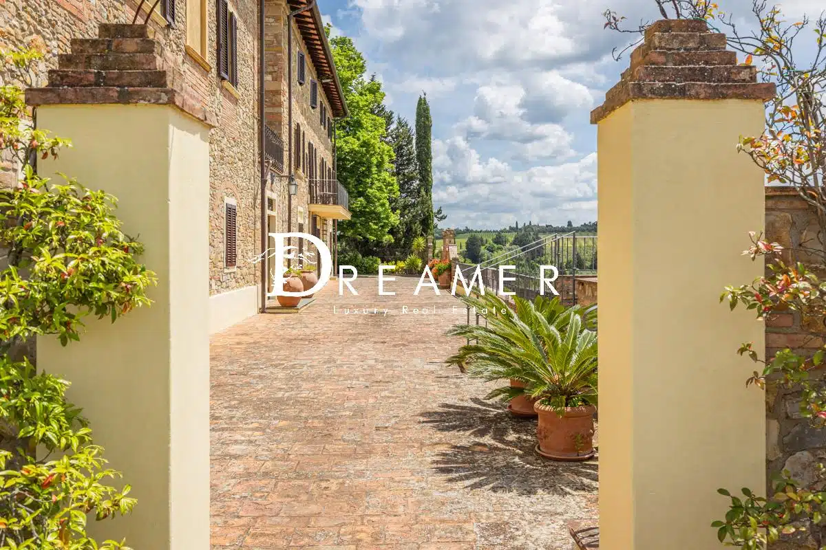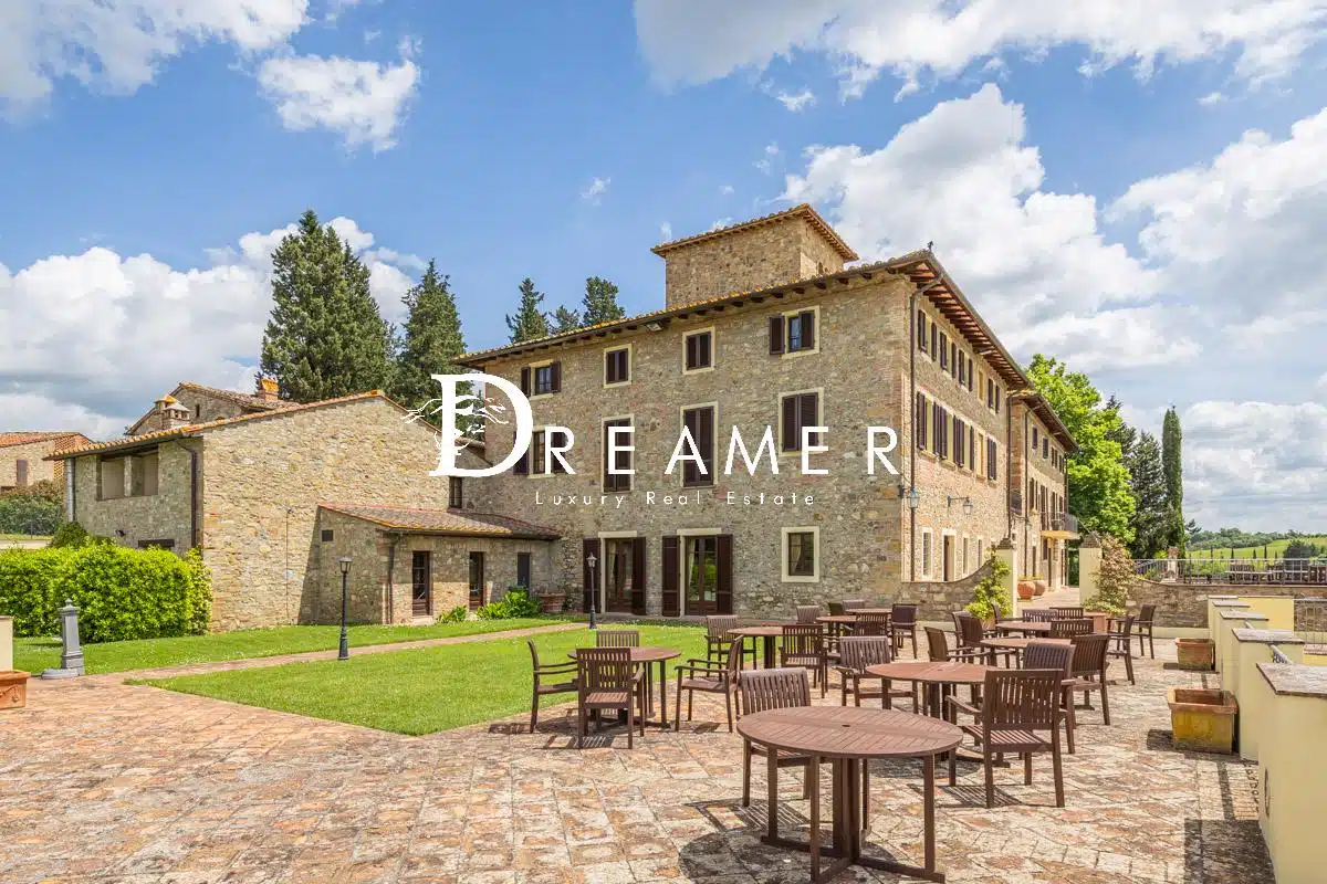 Elegant historic estate with pools for sale in the heart of the Tuscan hills, among the harmonious landscapes of the Chianti Classico. The property, dating back to the 16th century, has been carefully restored. It is currently used as a luxury accommodation facility with a total of approximately 2600 sqm. It is divided into 21 residential units, 39 bedrooms and 43 bathrooms. Situated in a dominant position near Barberino Val d’Elsa, it enjoys a spectacular view of neat vineyards, centuries-old olive groves and medieval villages, with Florence and Siena easily reachable in just over half an hour.