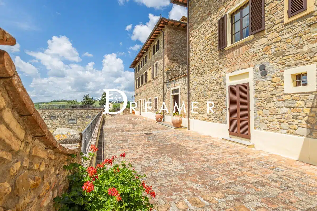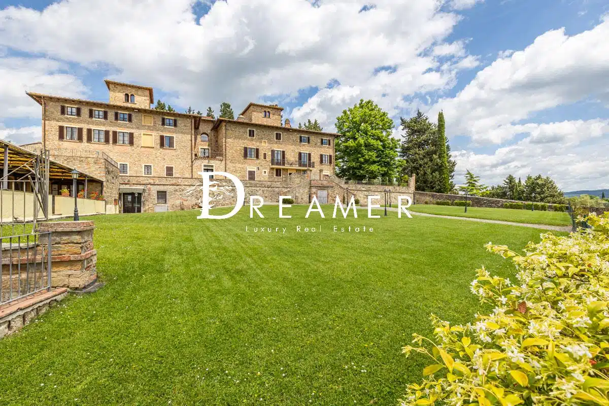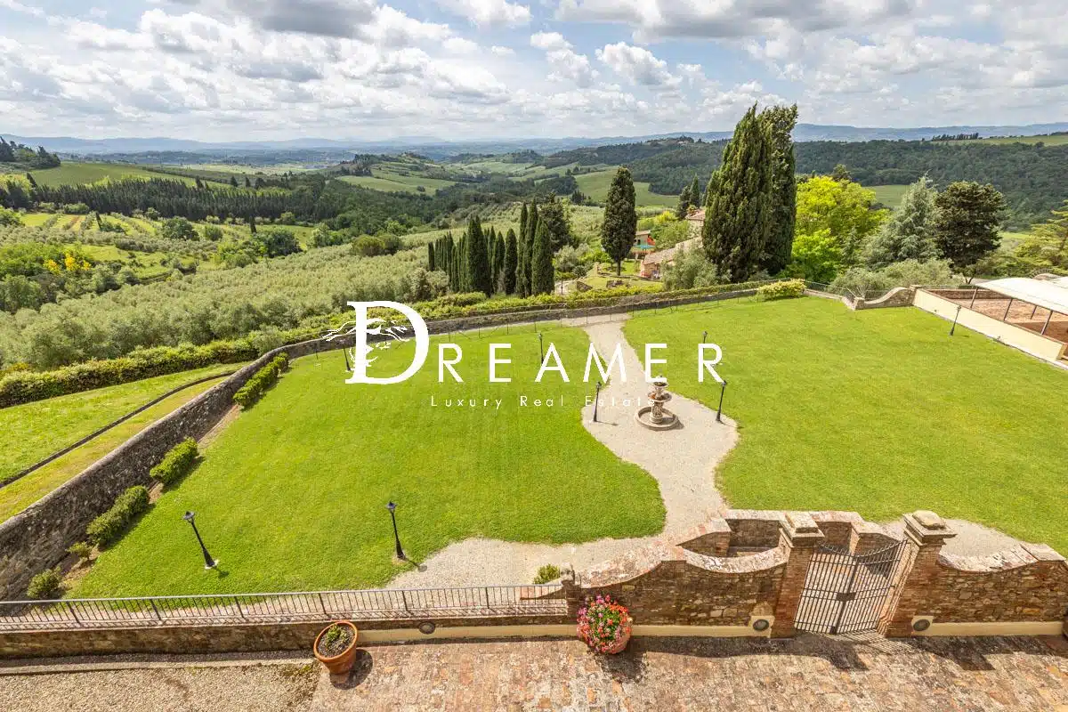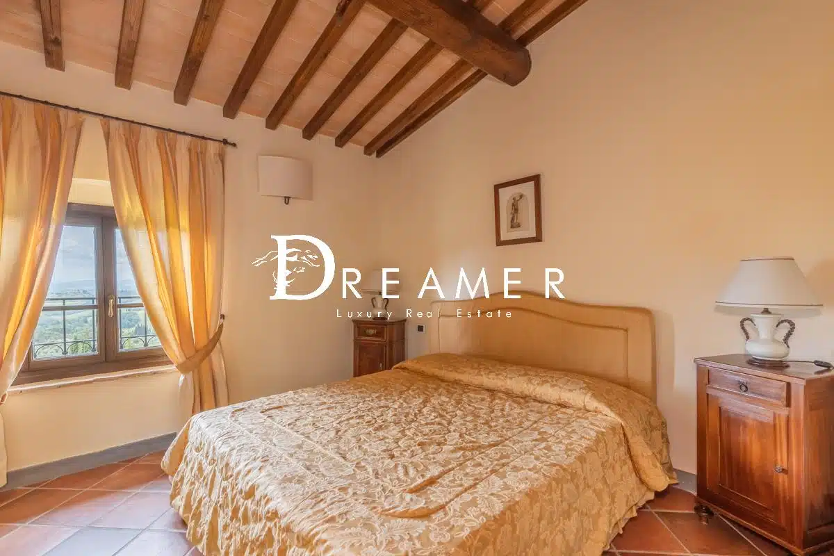 Elegant historic estate with pools for sale in the heart of the Tuscan hills, among the harmonious landscapes of the Chianti Classico. The property, dating back to the 16th century, has been carefully restored. It is currently used as a luxury accommodation facility with a total of approximately 2600 sqm. It is divided into 21 residential units, 39 bedrooms and 43 bathrooms. Situated in a dominant position near Barberino Val d’Elsa, it enjoys a spectacular view of neat vineyards, centuries-old olive groves and medieval villages, with Florence and Siena easily reachable in just over half an hour.