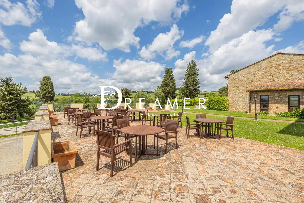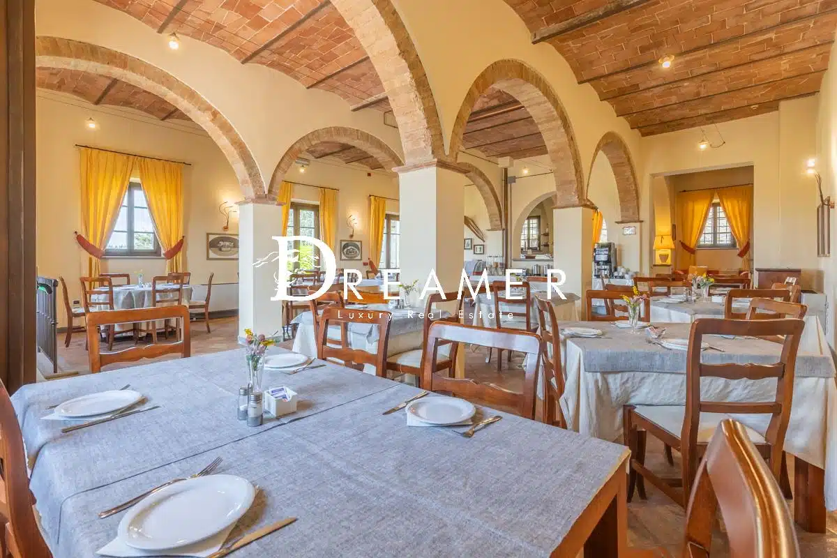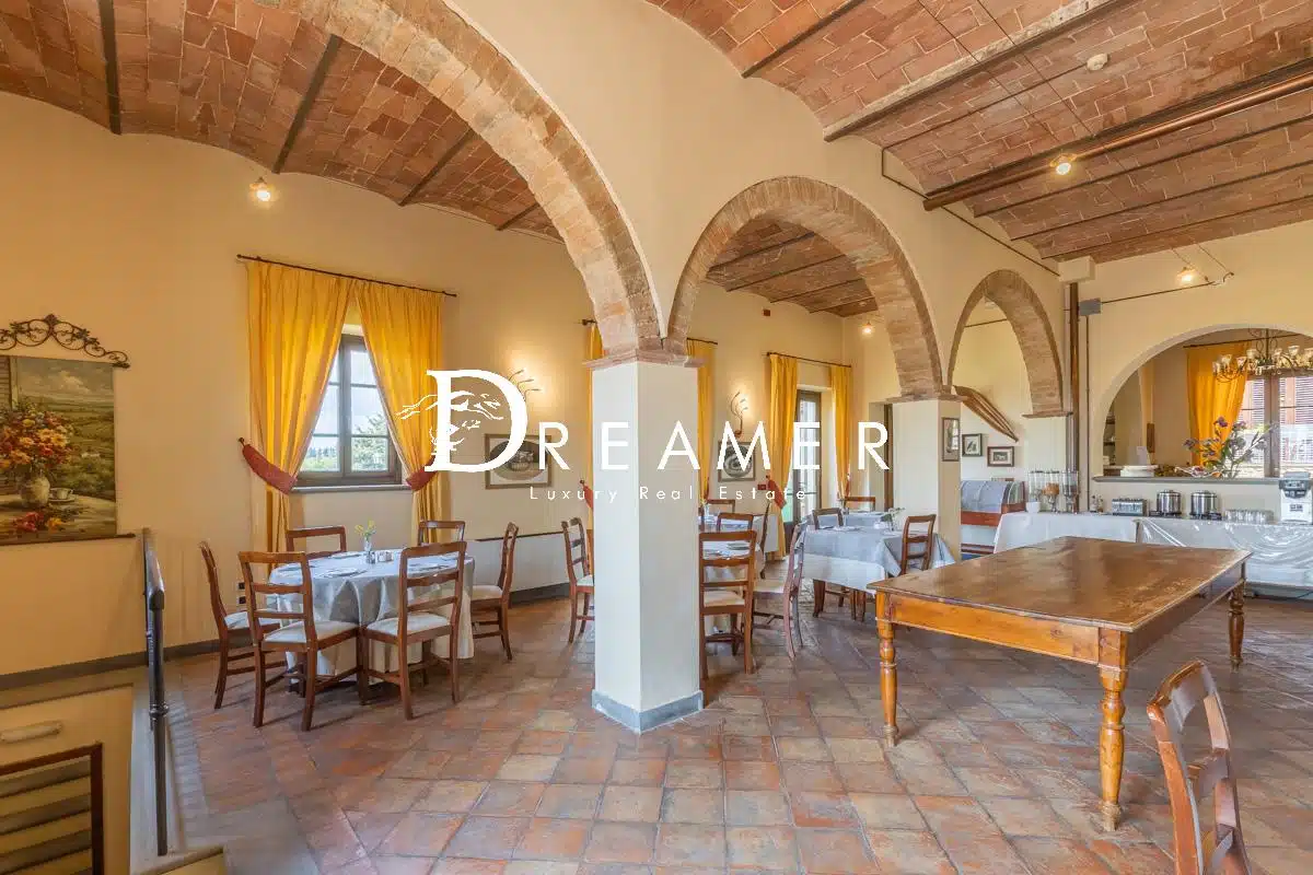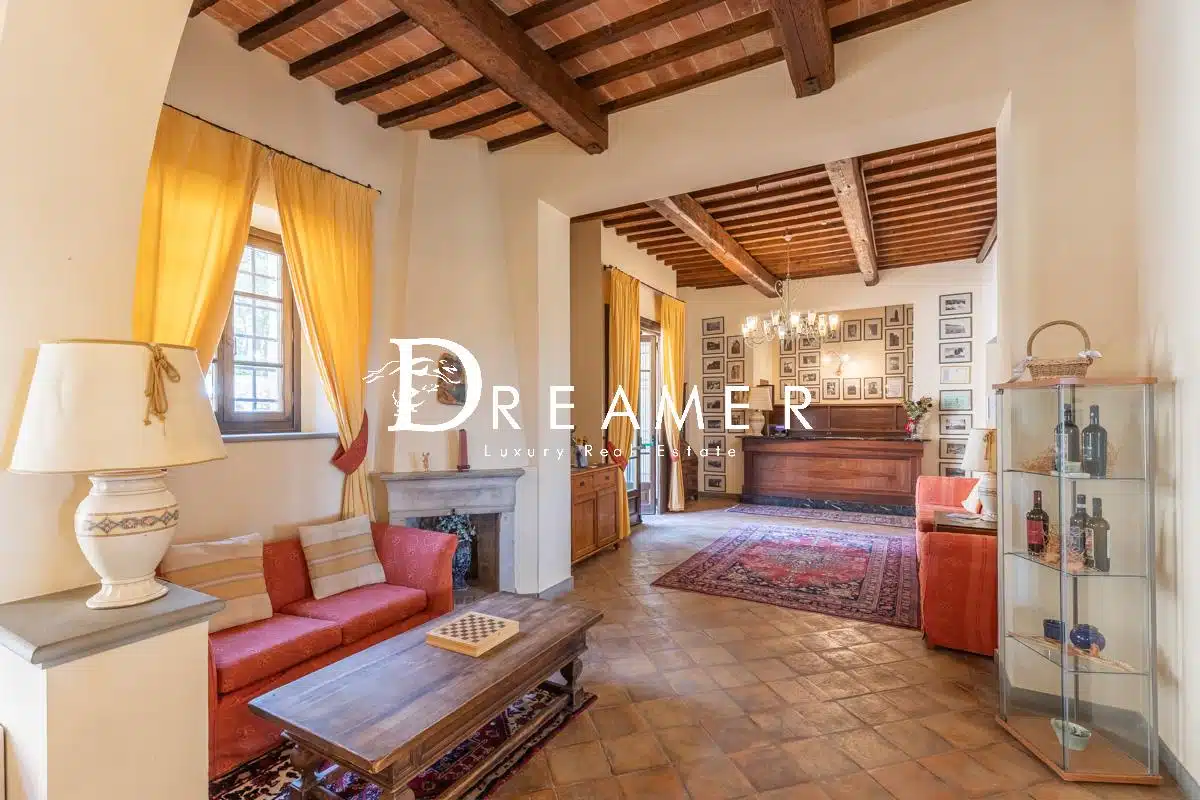 The common areas are large and bright, furnished with sober and elegant taste. They include living rooms, reception, management offices, dining rooms and spaces dedicated to the relaxation of guests. The residence preserves the authentic features of Tuscan architecture intact: stone walls, exposed wooden beams, terracotta floors, fireplaces in pietra serena and rustic furnishings of value. The interiors have been expertly renovated, maintaining the warm and welcoming atmosphere of the country manor houses, while offering every modern comfort.
