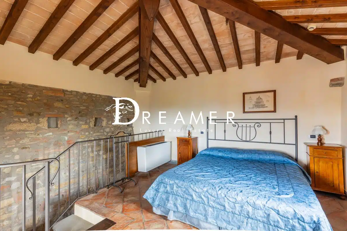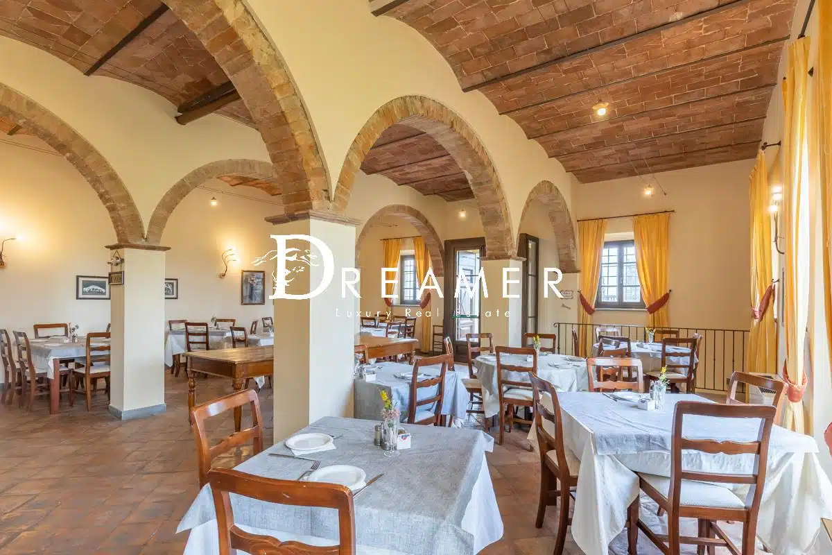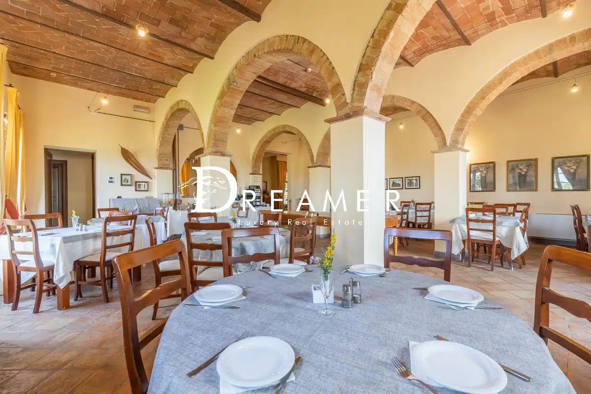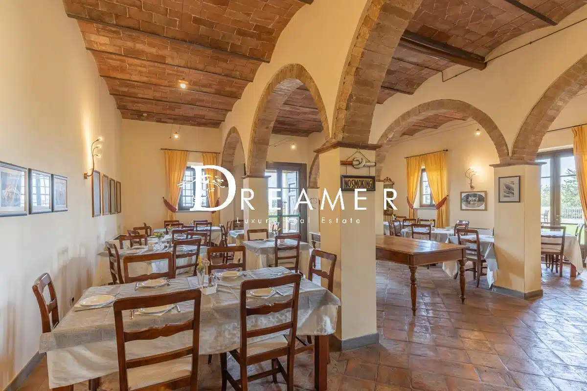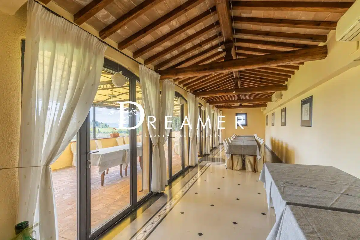 The common areas are large and bright, furnished with sober and elegant taste. They include living rooms, reception, management offices, dining rooms and spaces dedicated to the relaxation of guests. The residence preserves the authentic features of Tuscan architecture intact: stone walls, exposed wooden beams, terracotta floors, fireplaces in pietra serena and rustic furnishings of value. The interiors have been expertly renovated, maintaining the warm and welcoming atmosphere of the country manor houses, while offering every modern comfort.