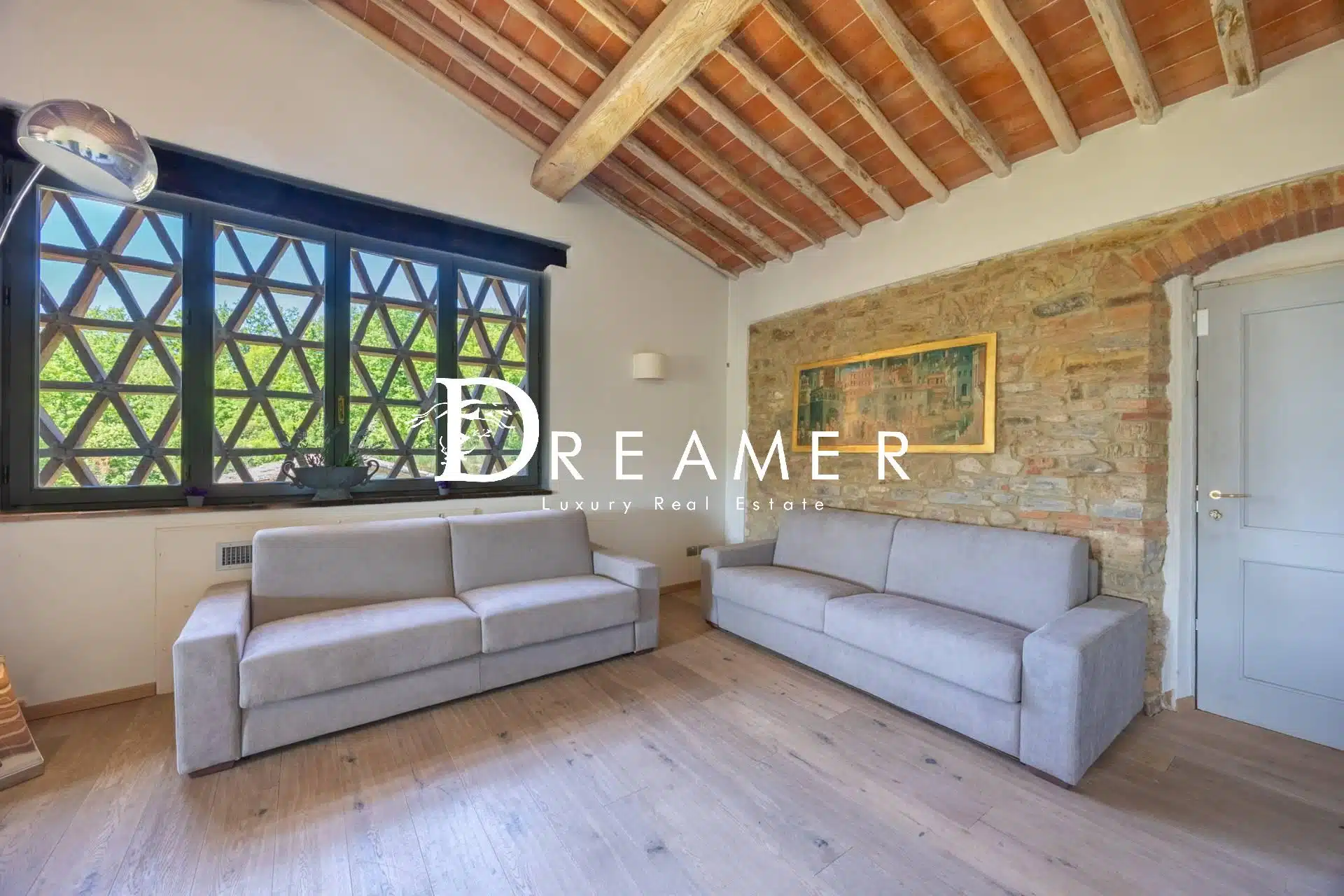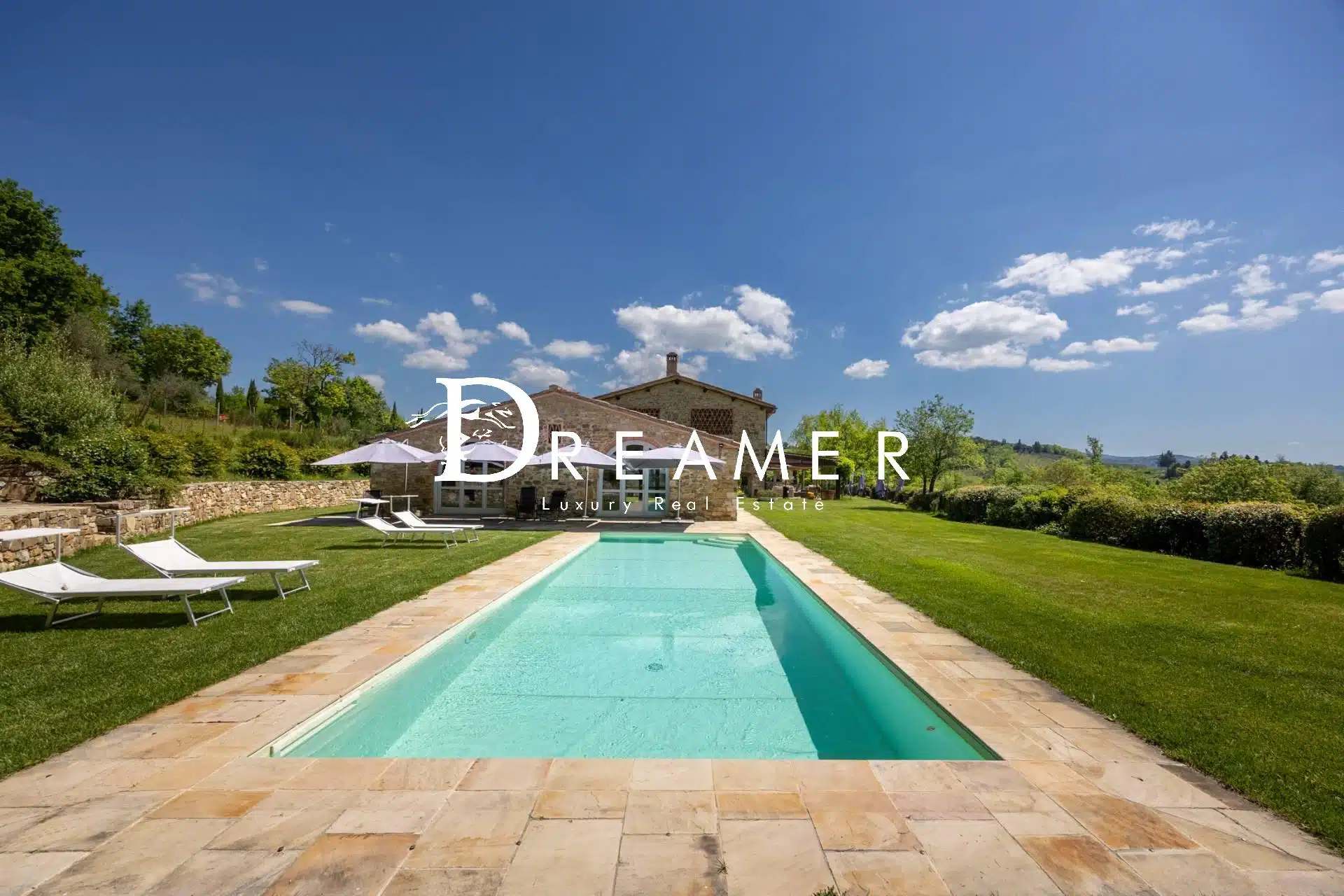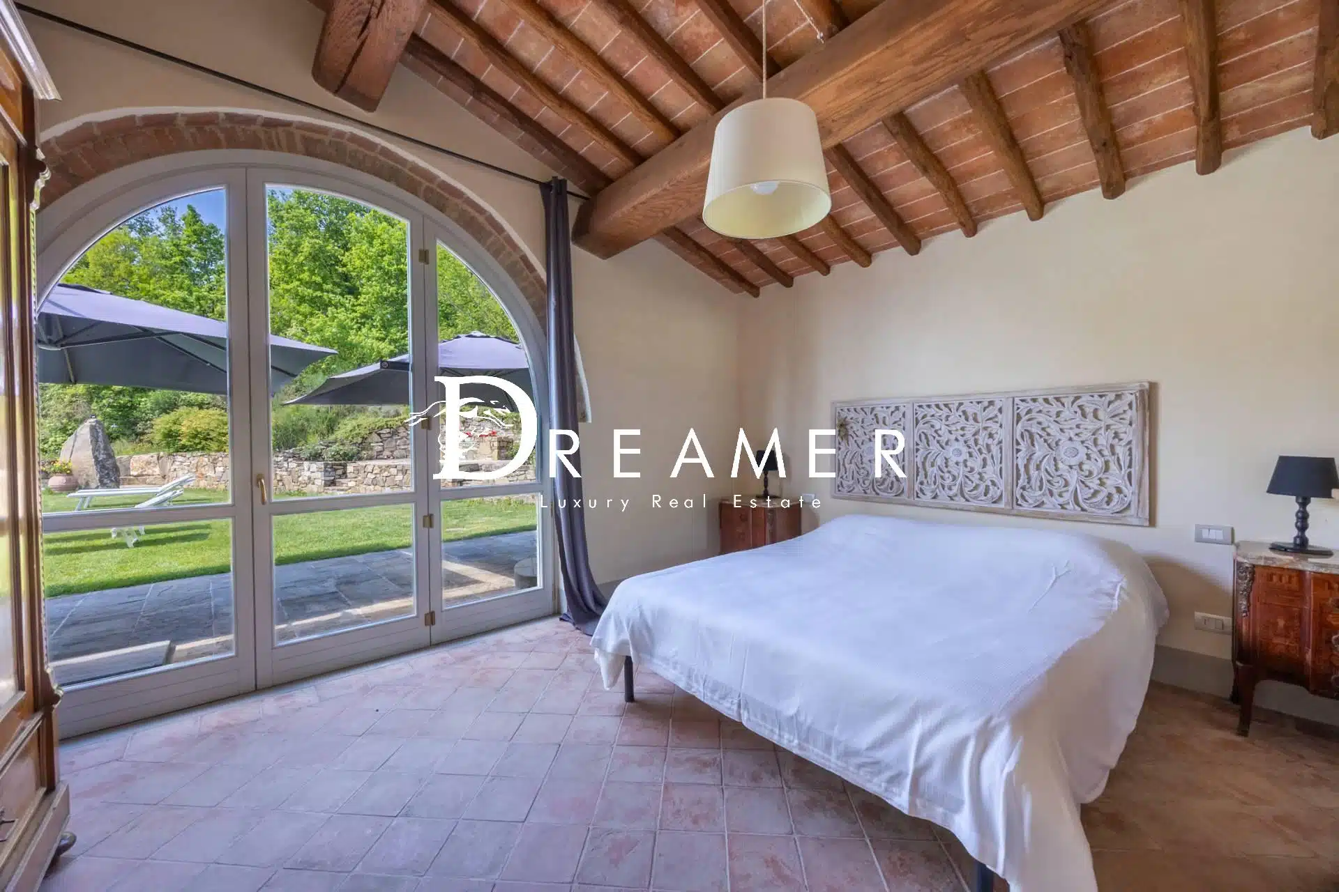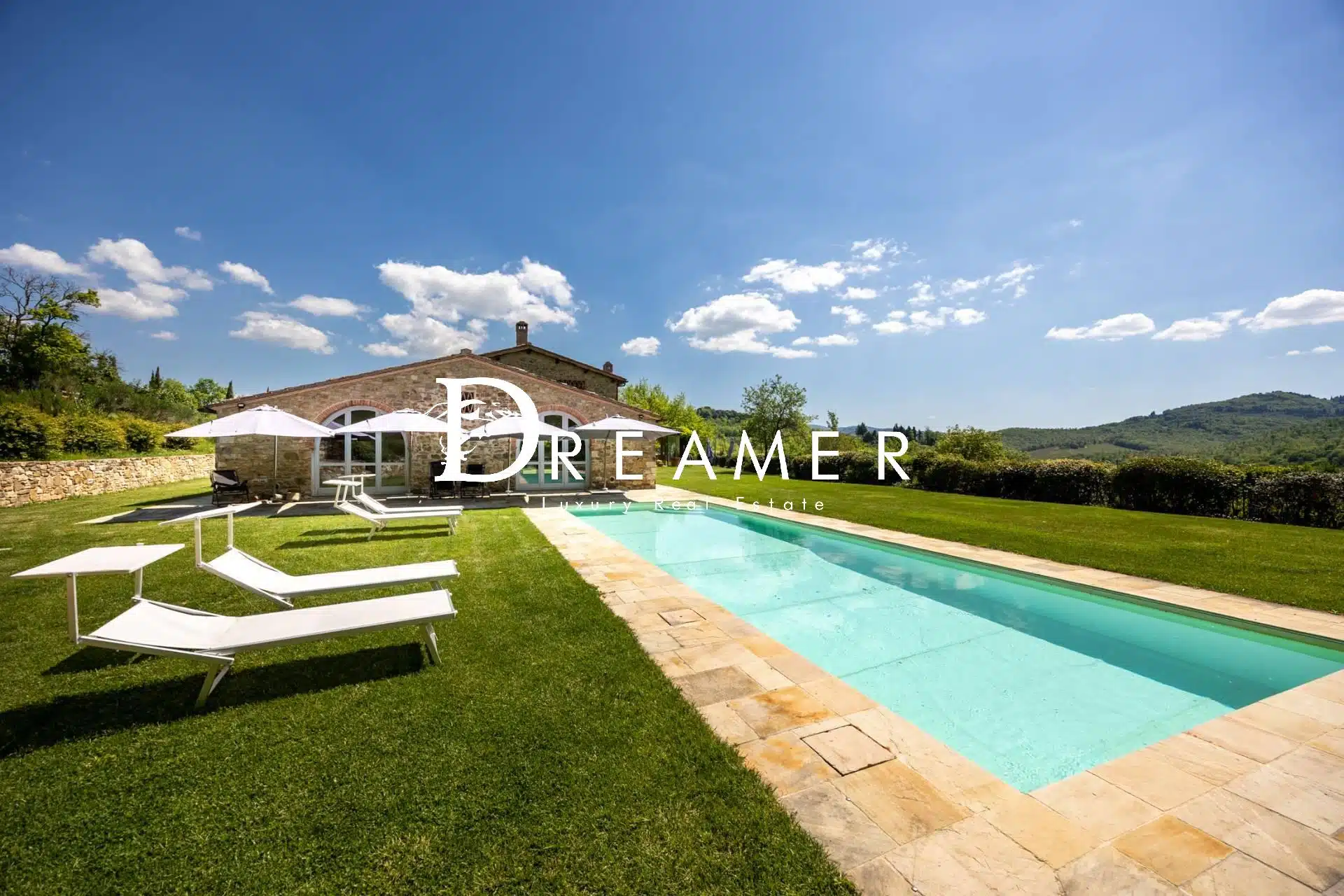 Tuscan villa for sale in the hills of Florence, a few minutes from Greve in Chianti and less than an hour from Florence and Siena. The property, in a dominant position on the Tuscan hills, consists of a main villa and an annex, for a total of 545 sqm with 8 bedrooms and 8 bathrooms.