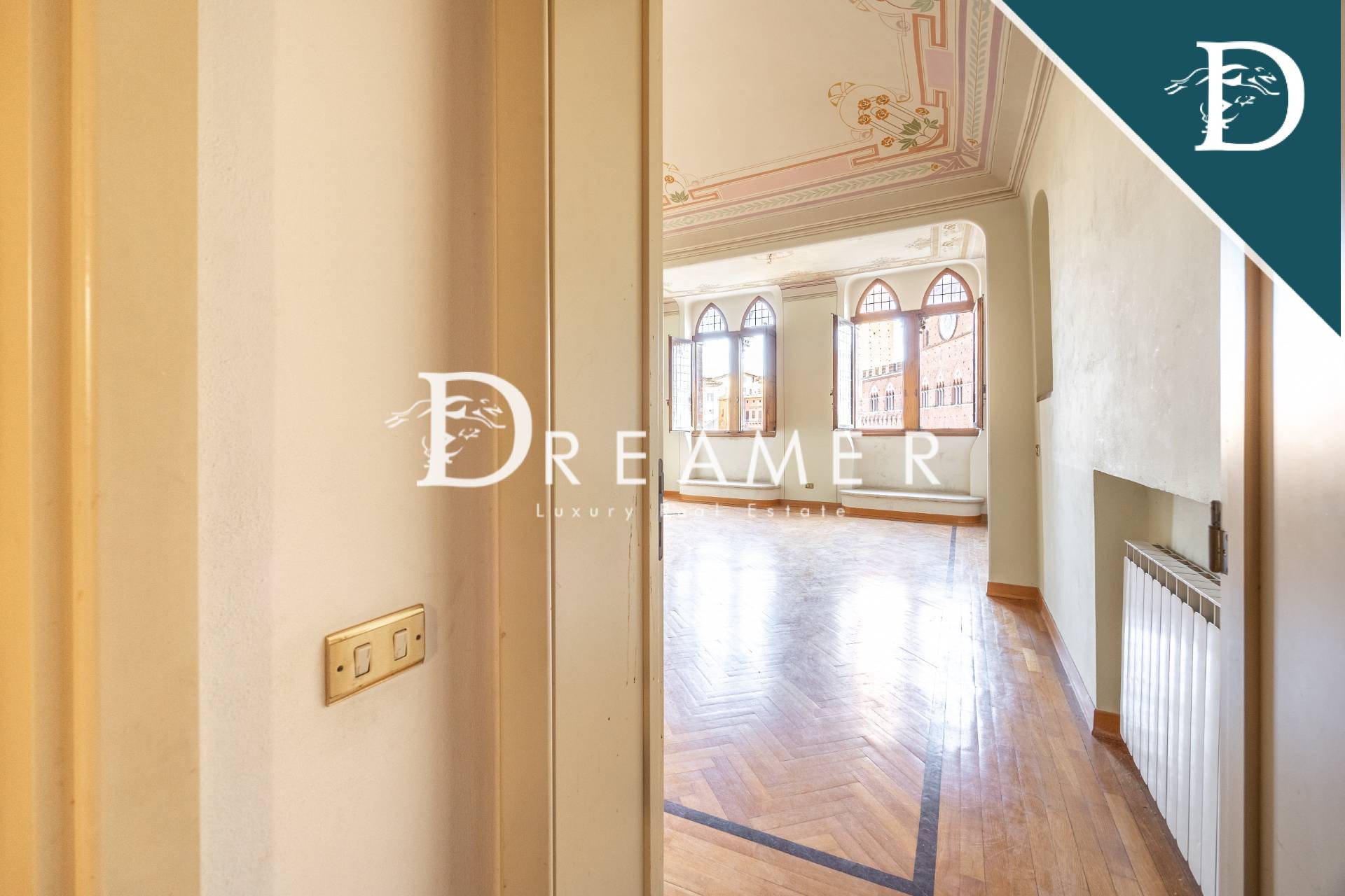 Prestigious Apartment for sale in Piazza del Campo, the main square of the Historic Center of Siena. The property, spread over three independent floors, comprises a total of 240 sqm with 3 bedrooms and 2 bathrooms. It is part of the prestigious Palazzo Mattasala Lambertini.