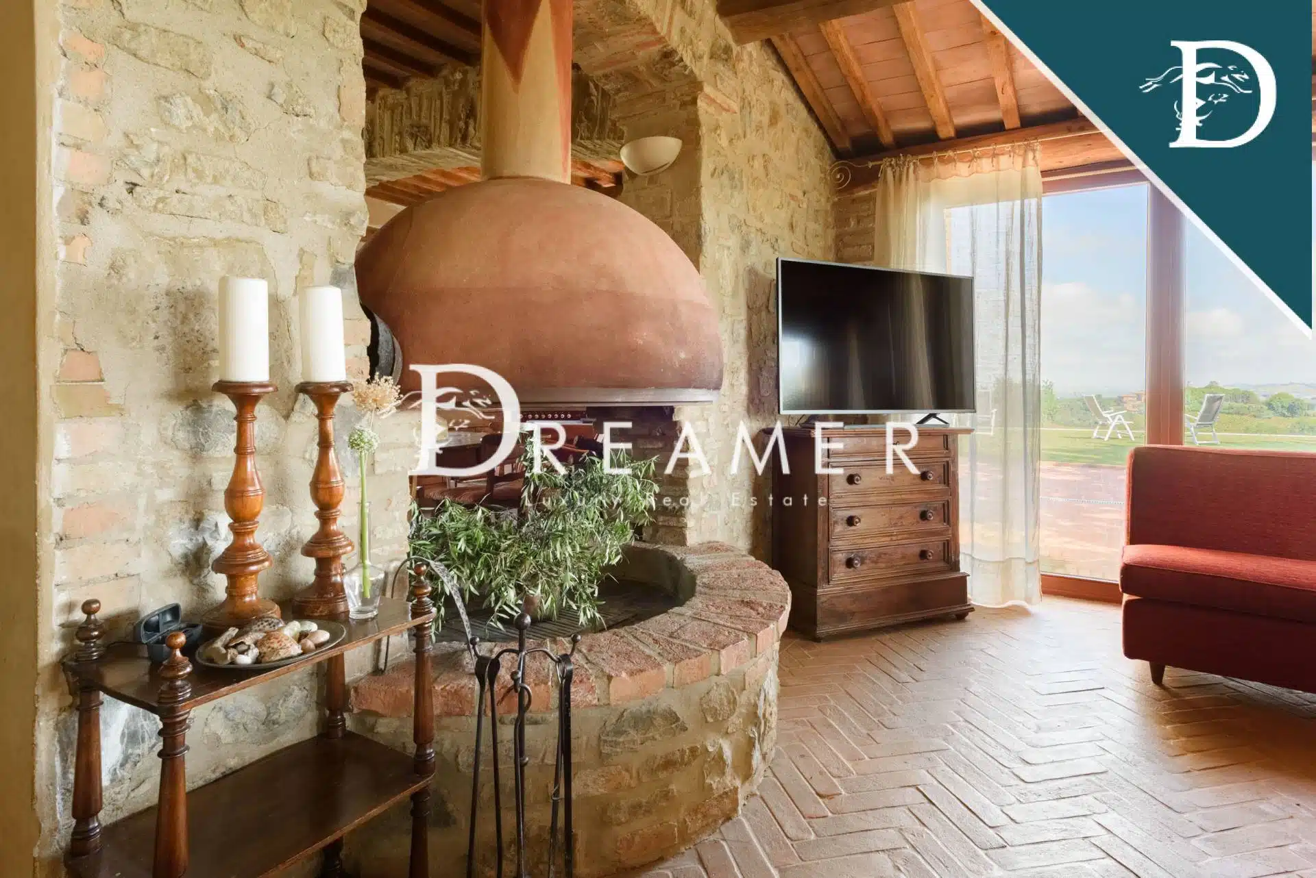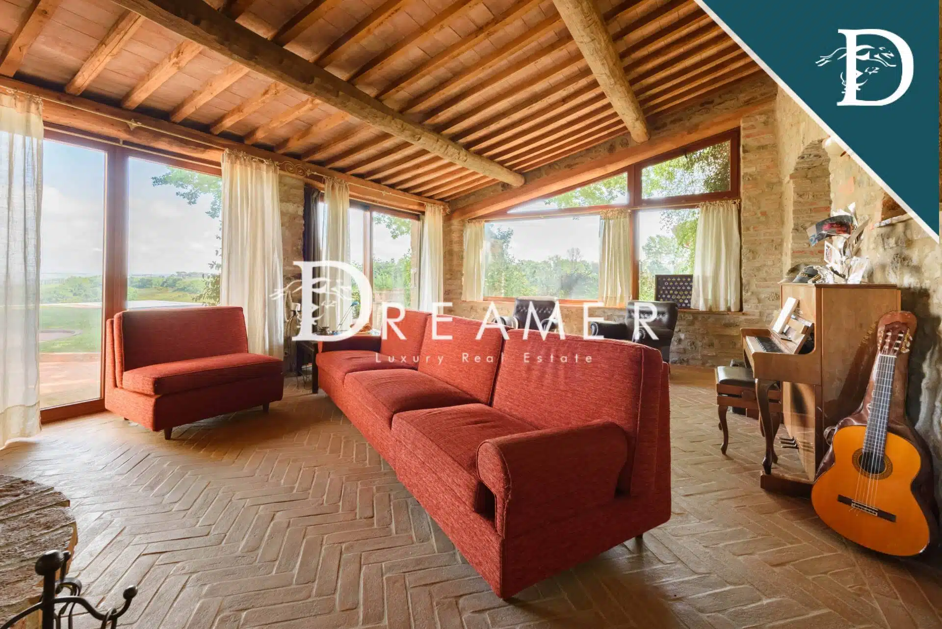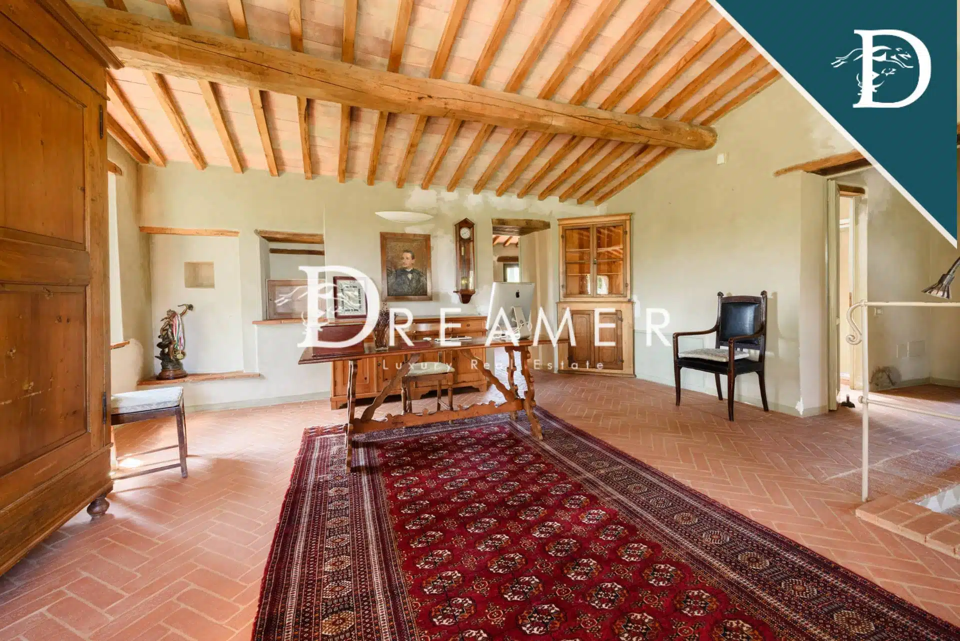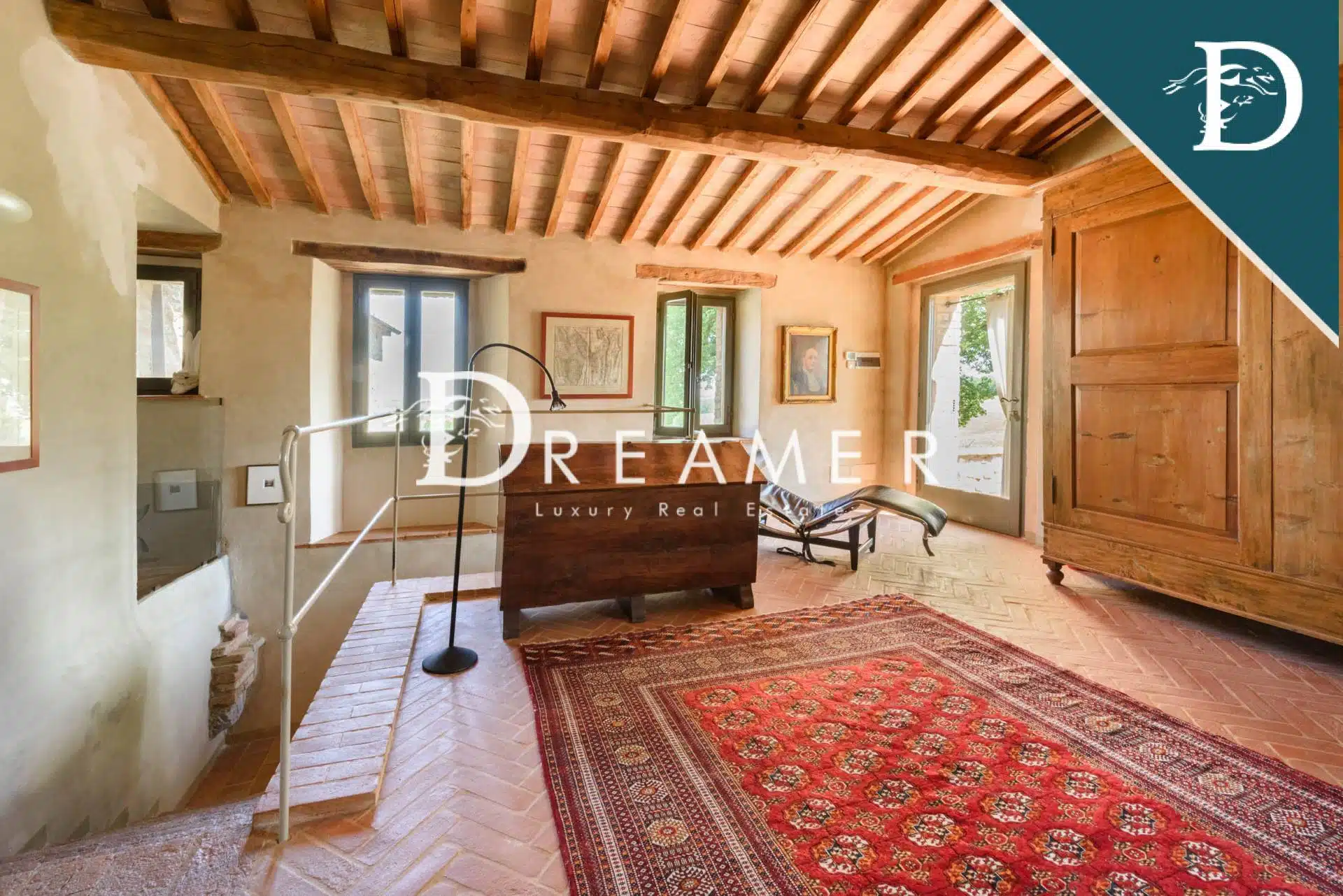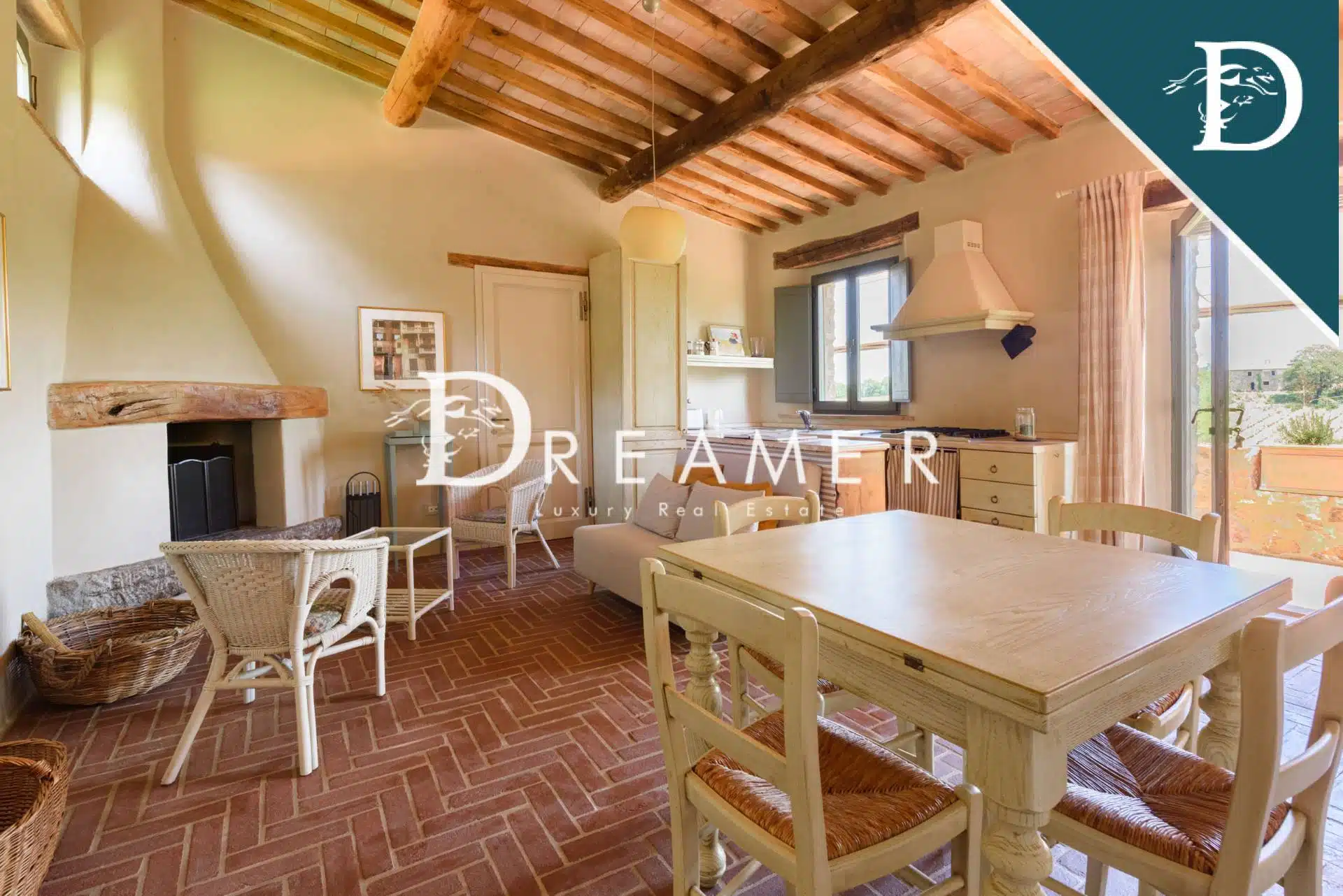 The entrance to the main farmhouse opens onto a large and bright living room with windows overlooking the surrounding land and providing views of the green hills of the Val d’Orcia. On the ground floor there is also a comfortable and spacious eat-in kitchen and a large dining room. Elegant stairs lead to the first floor, which houses the sleeping area and features 4 double bedrooms, each with large windows, and 3 bathrooms. With its refined style, the main farmhouse represents a perfect fusion between rustic and contemporary thanks to the choice of finishing materials. The property is completed by a splendid terrace, ideal for enjoying moments of relaxation outdoors.