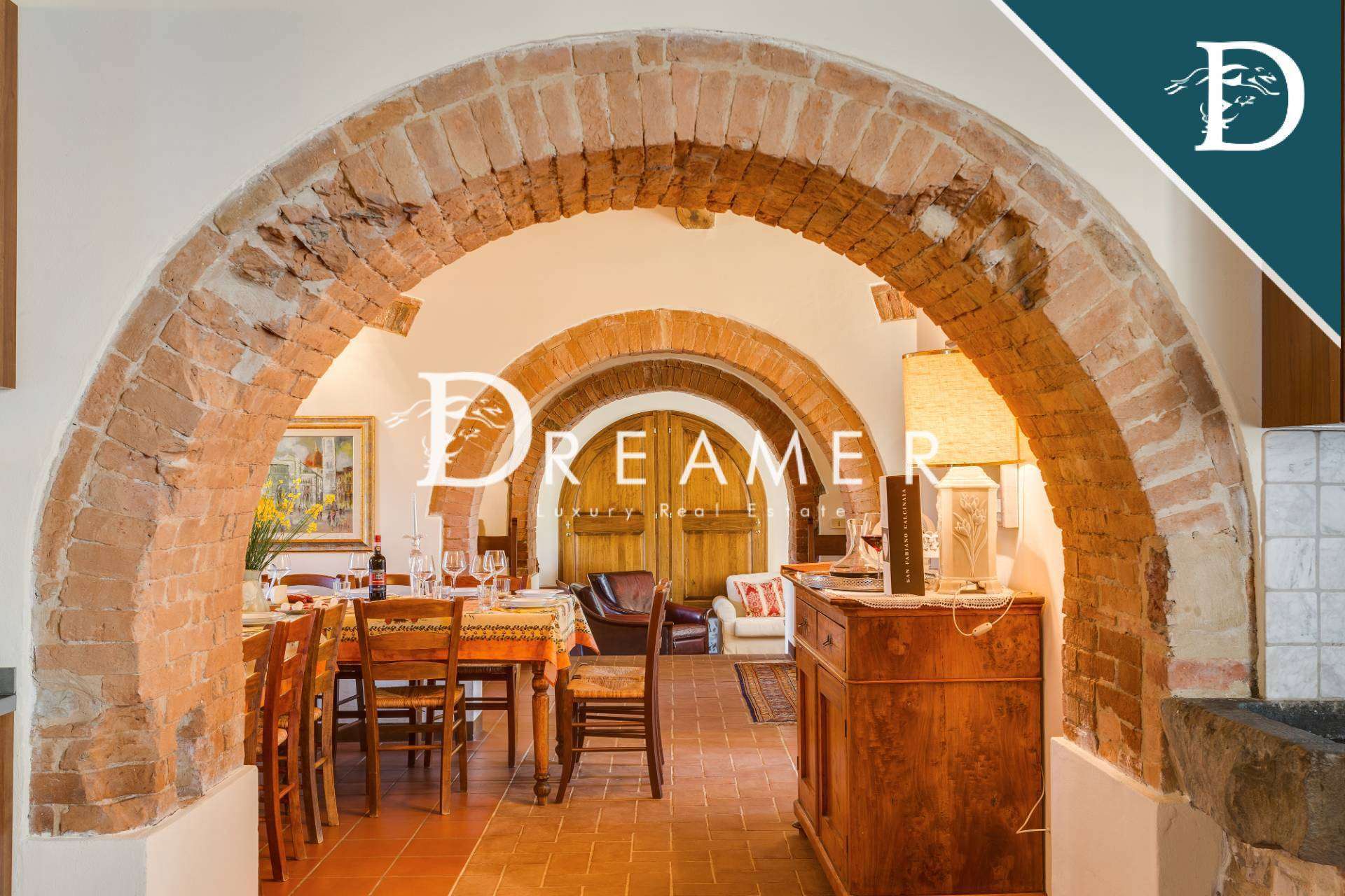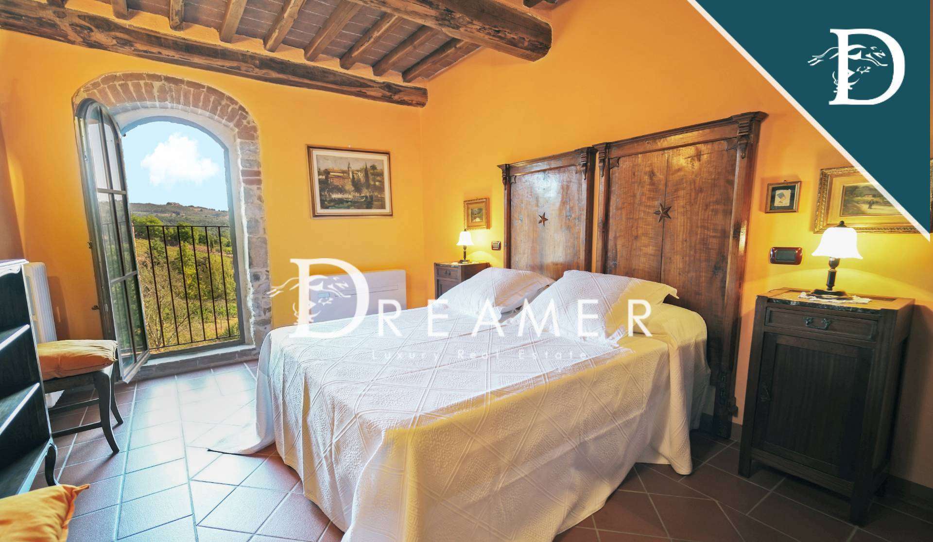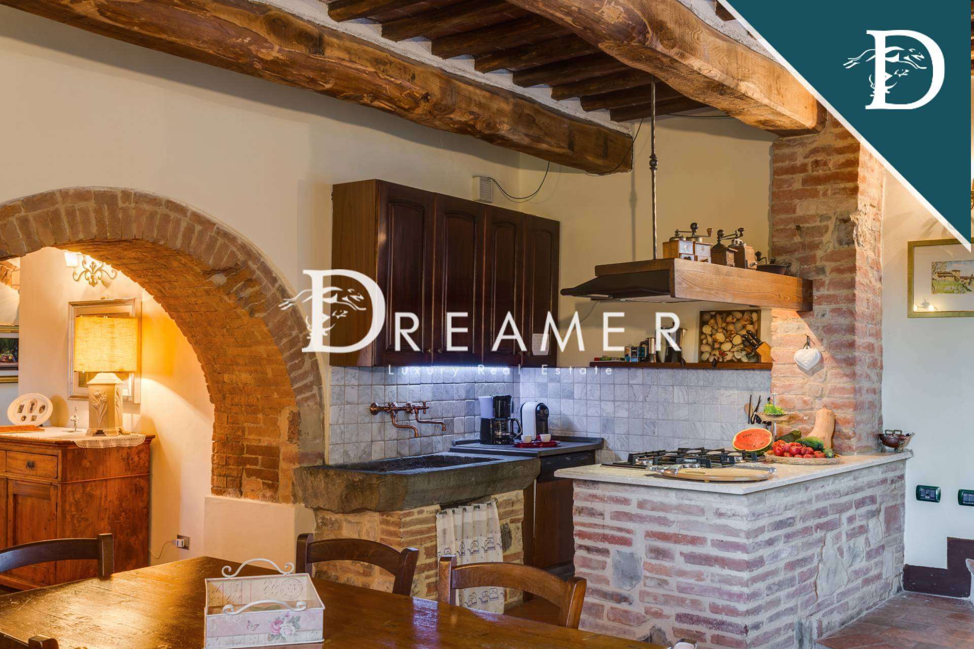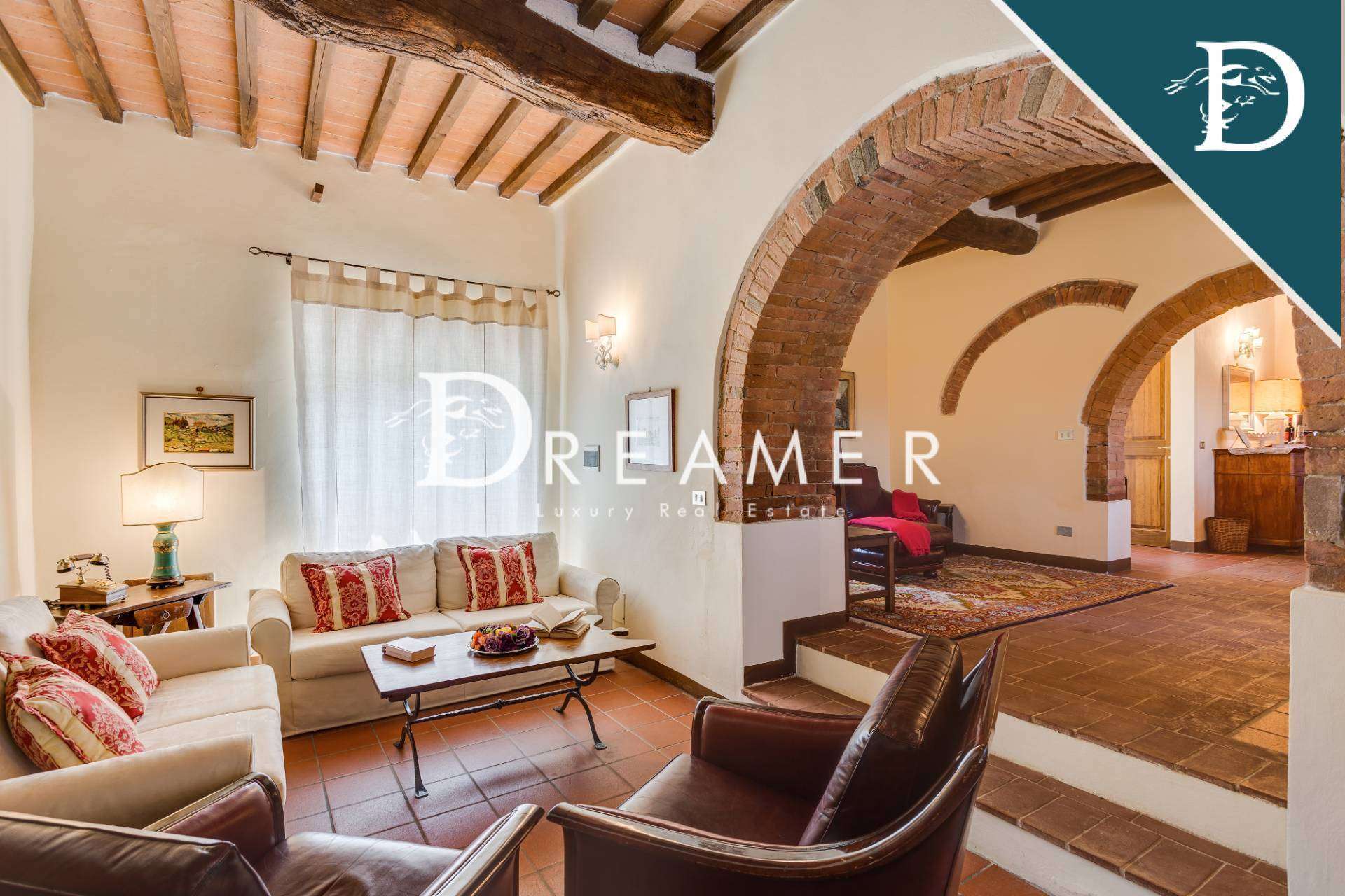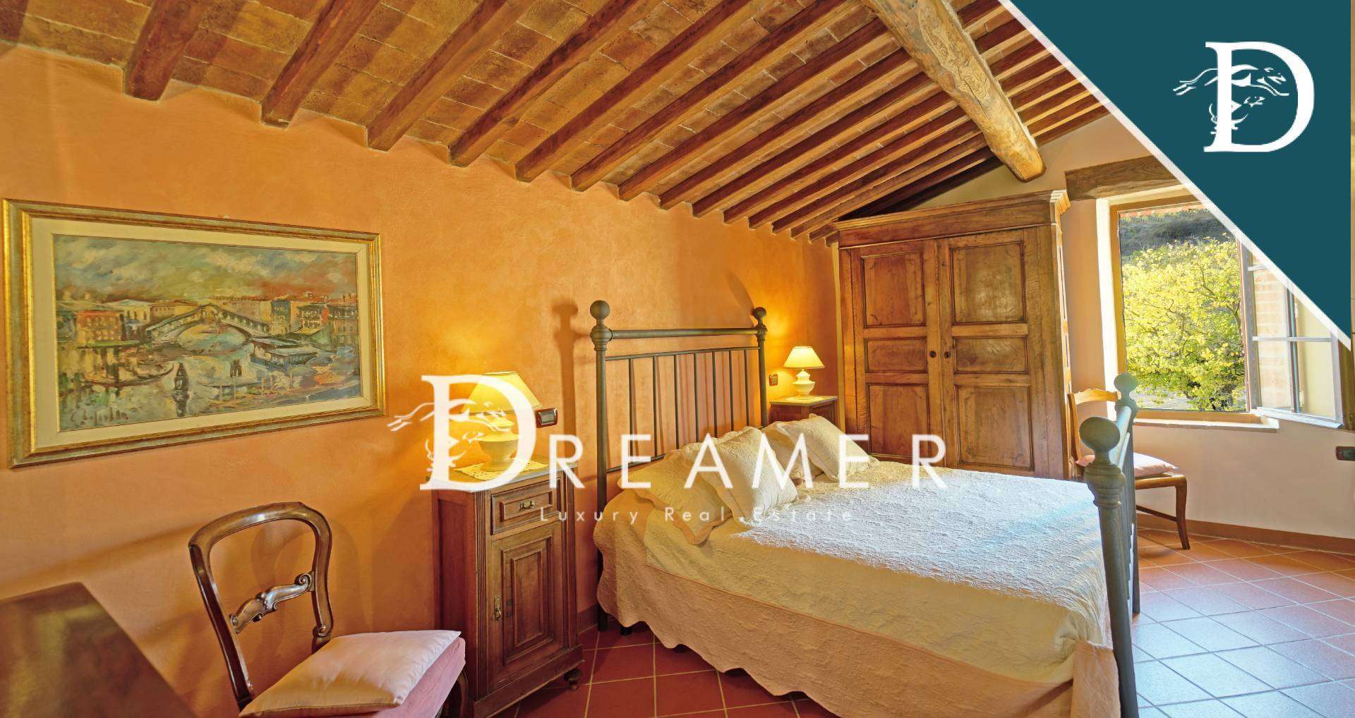Typical Tuscan Villa from the 1200s for sale located in the fascinating landscape of the Chianti Senese hills. A few kilometers from Siena. The farmhouse, perfectly renovated, is made up of two buildings, a main villa and a barn for a total of 690 sqm. Also an estate of 26 hectares of land and a wonderful swimming pool.