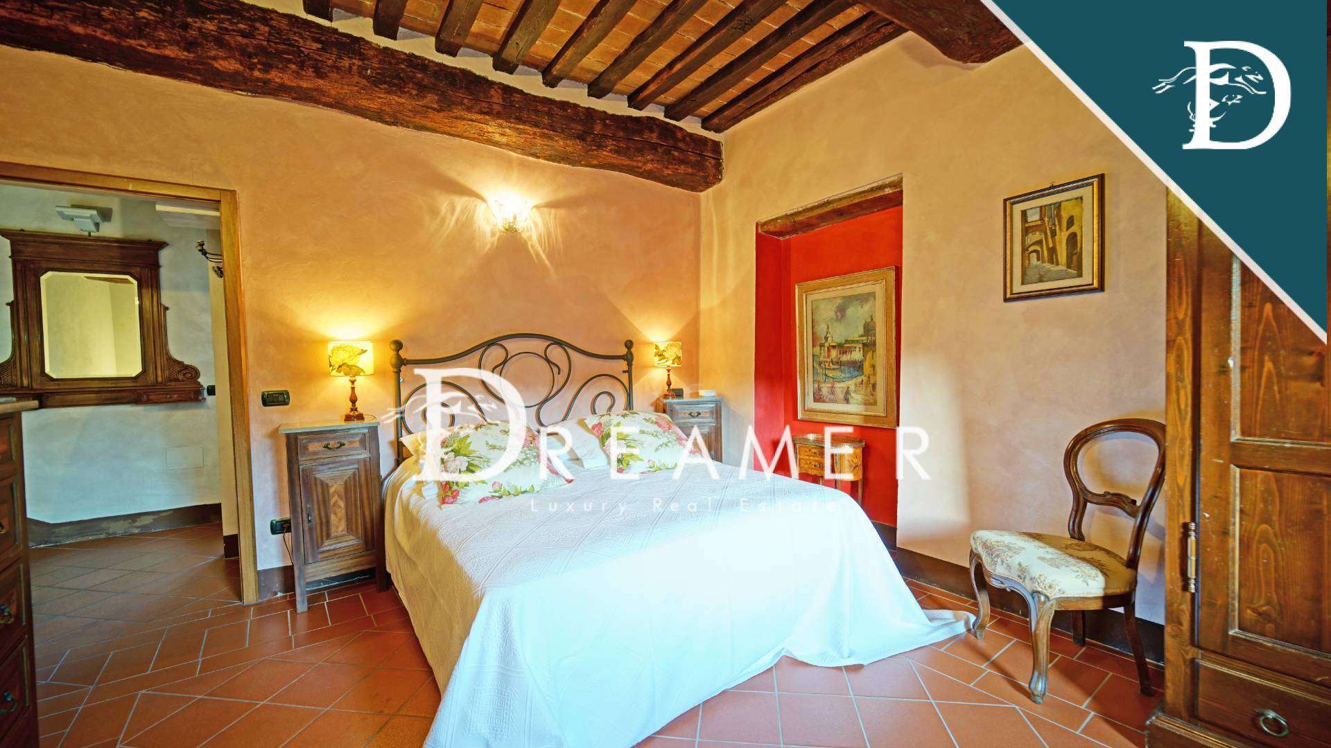 The main villa, with a fourteenth-century watchtower, spreads over 3 levels. With a total of 8 bedrooms and 7 bathrooms. On the ground floor, there is a large double living room, kitchen and bathroom. Going up to the first floor, there is the sleeping area, consisting of 6 bedrooms, 4 bathrooms, a kitchen, a dining room and two loggias. On the second and last floor, there is a large study, 2 bedrooms with a bathroom and a hallway.