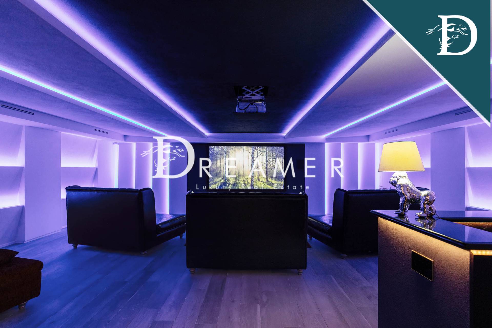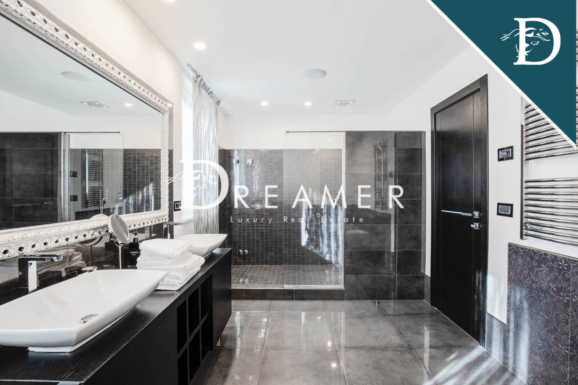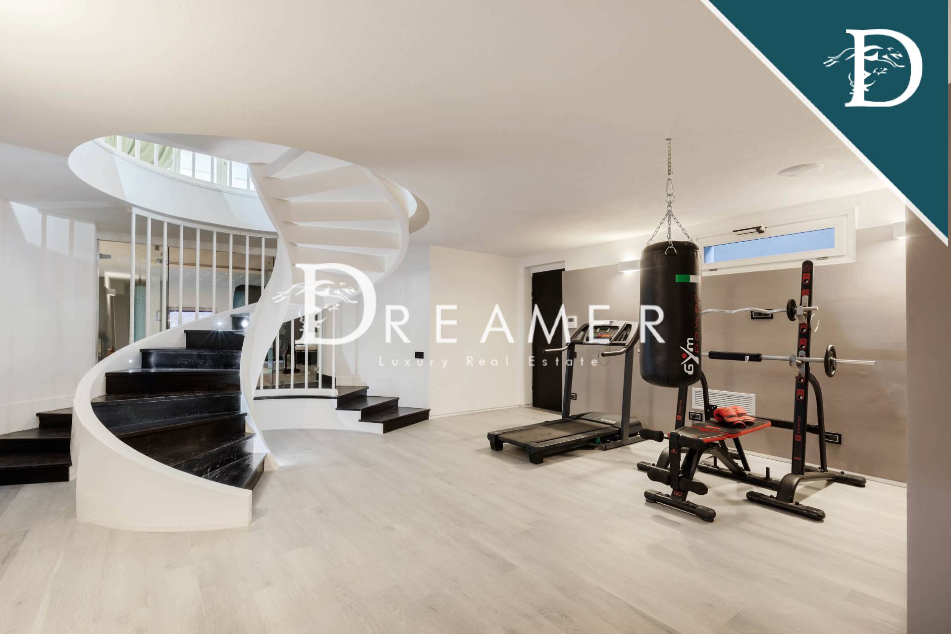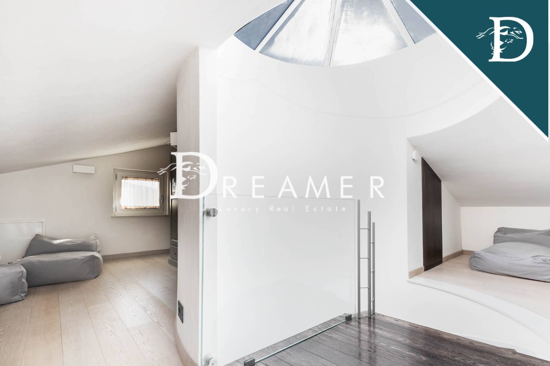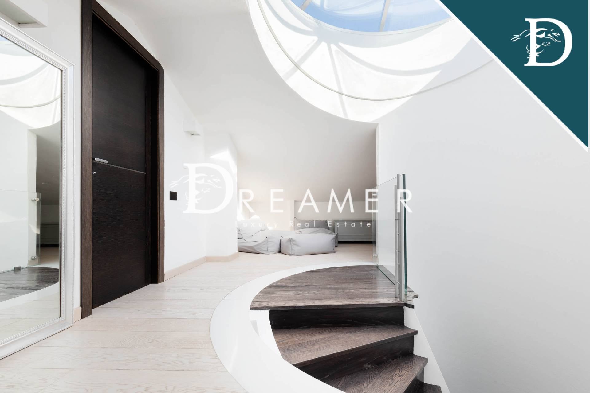 On the first floor, a covered terrace connects the mezzanine to the sleeping area, consisting of the master bedroom with walk-in closet and ensuite bathroom, and 2 other double bedrooms and 2 bathrooms; each bedroom has a private balcony. The attic floor hosts an additional double bedroom with private bathroom. Finally, going down to the basement, there is a large and luxurious spa area, with hydromassage pool, Turkish bath, gym, changing room, 2 bathrooms and a convenient laundry room. The floor is completed by a fabulous cinema room with 4K video projector and bar area, perfect for gathering with friends and family.
