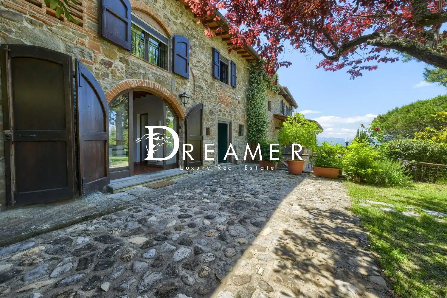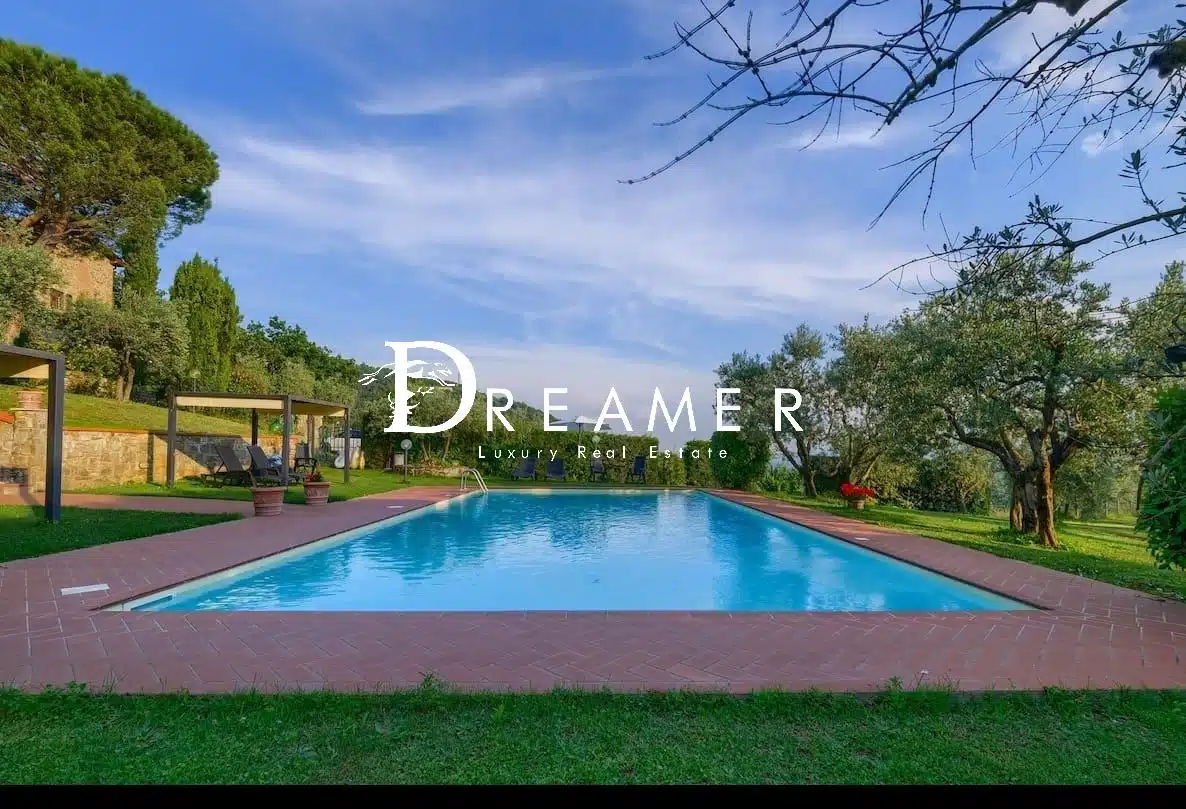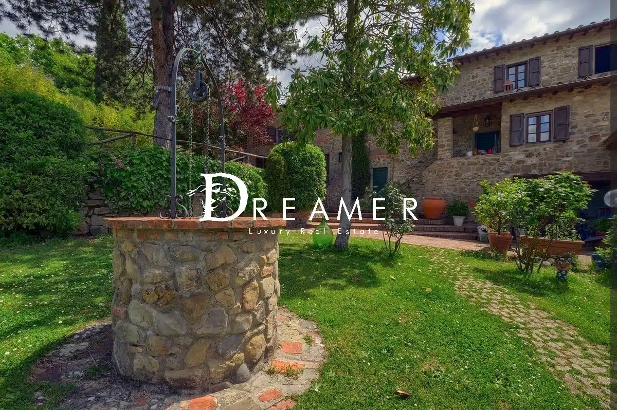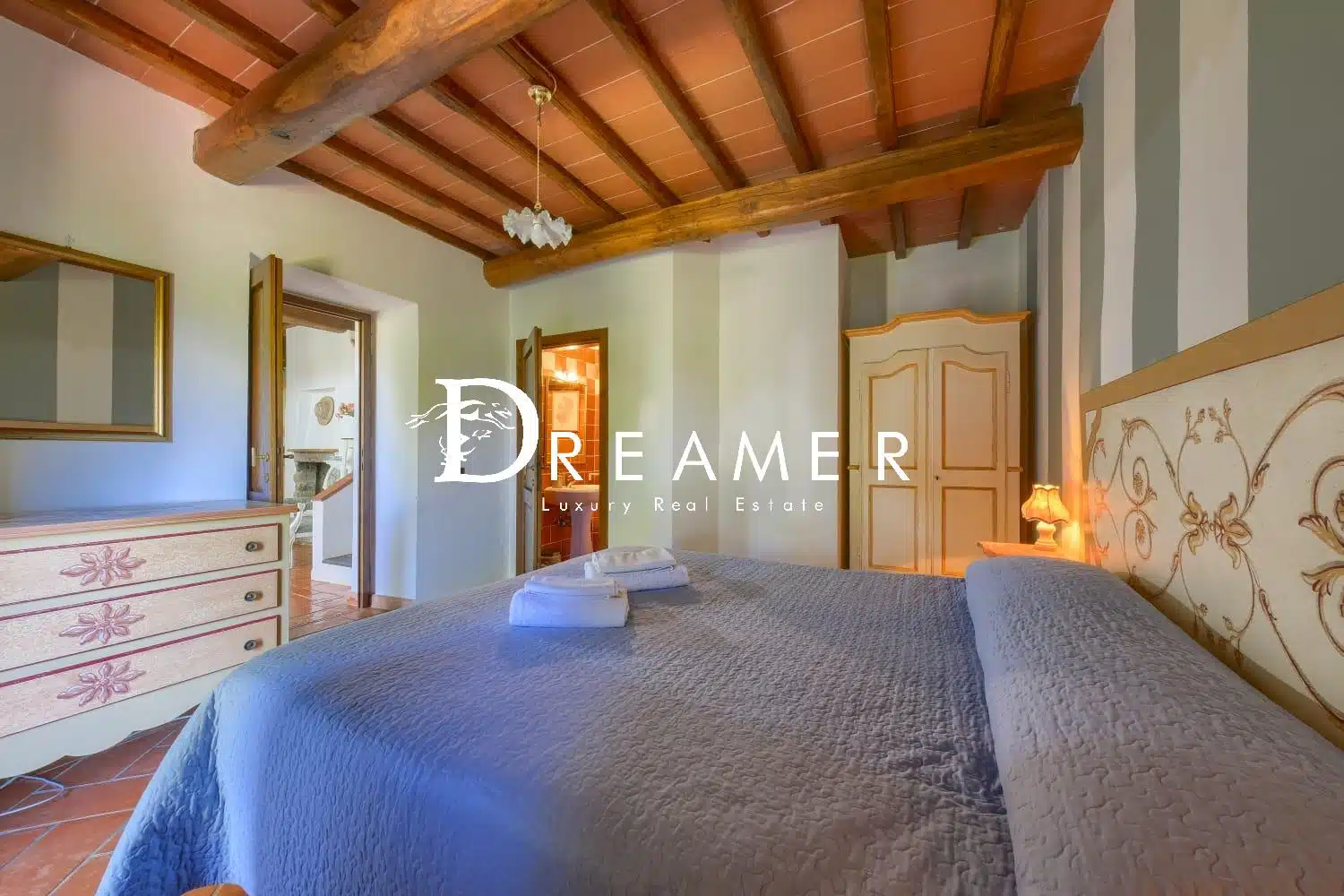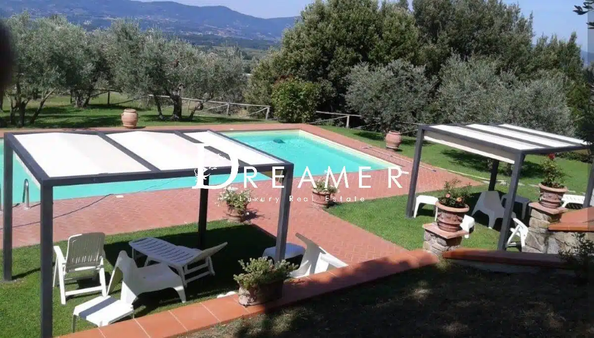 Splendid Tuscan farmhouse with pool for sale in the hills of Reggello, just 30 minutes from Florence. The property, located in a dominant position in the Tuscan hills, comprises a main villa divided into two residential units, totaling 360 sqm, with 7 bedrooms and 6 bathrooms.