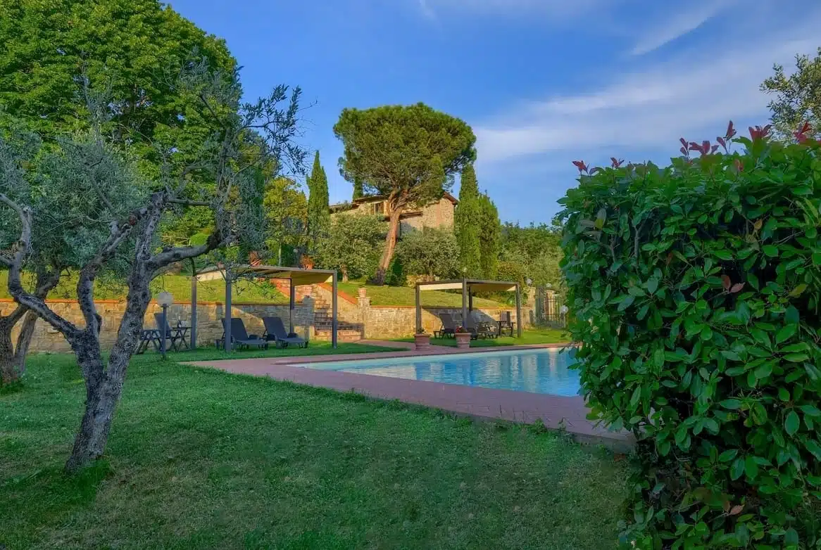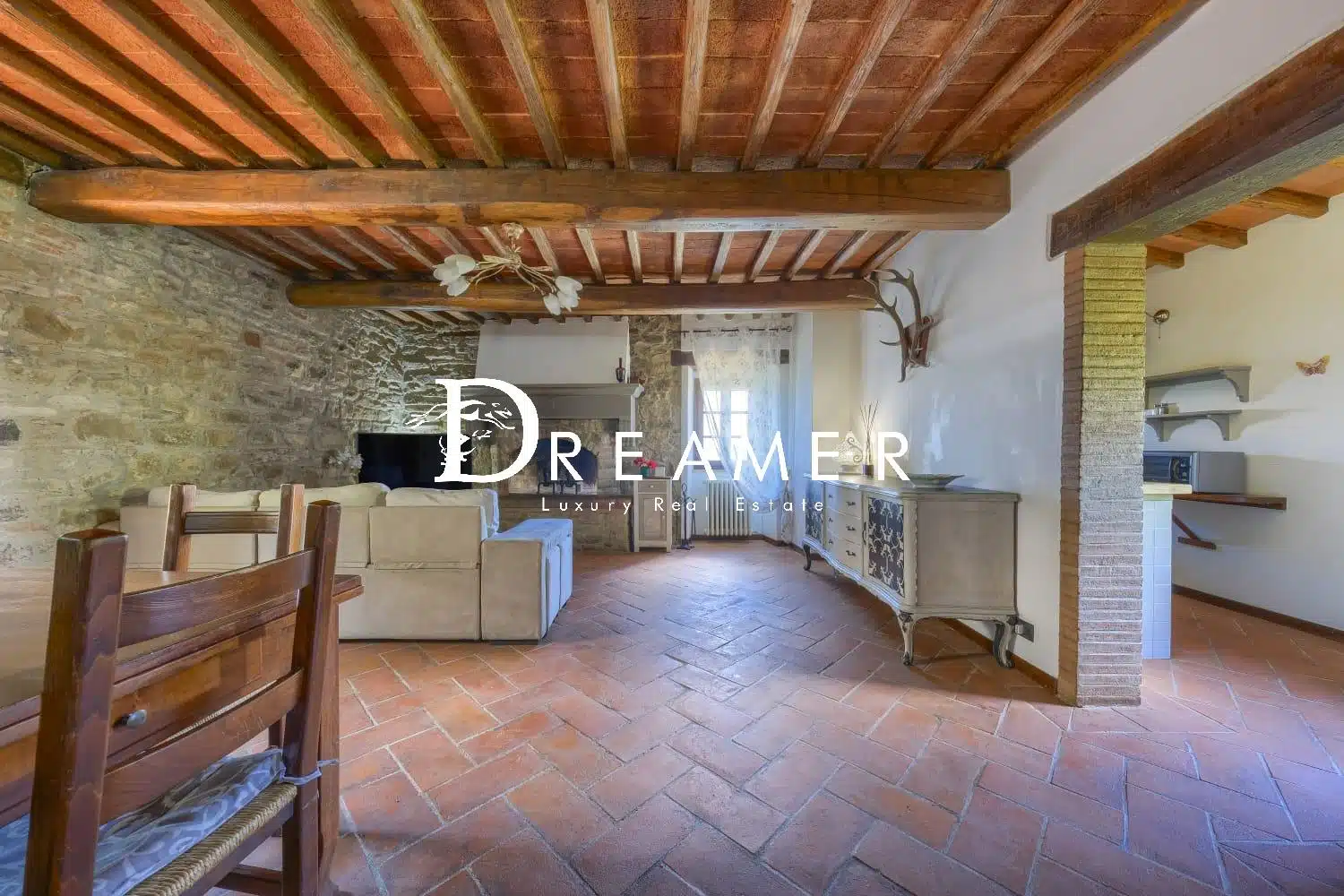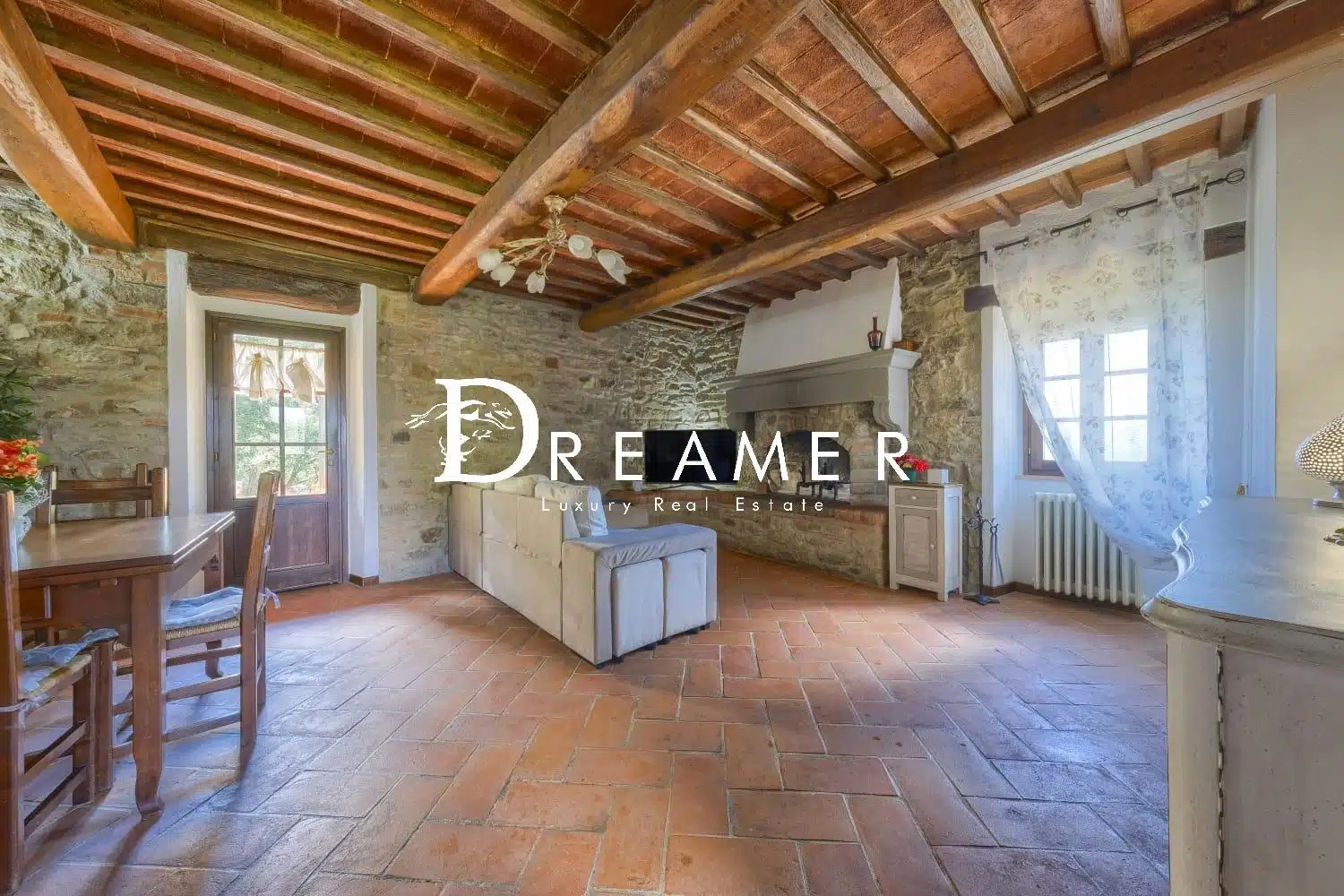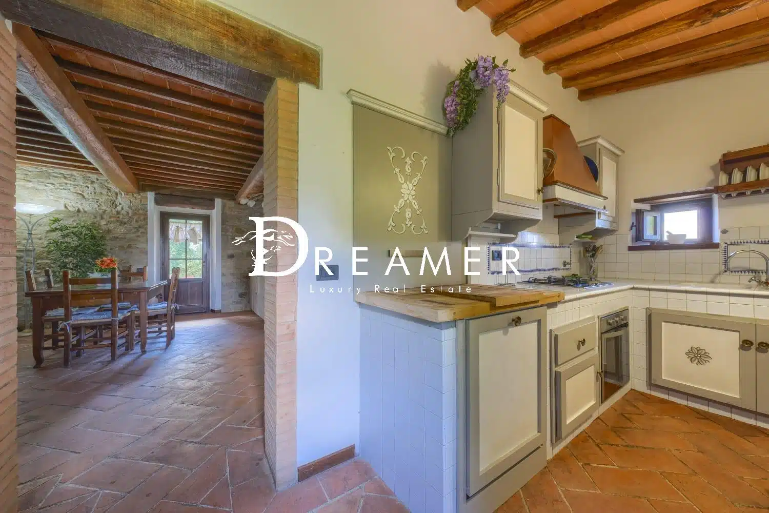 Splendid Tuscan farmhouse with pool for sale in the hills of Reggello, just 30 minutes from Florence. The property, located in a dominant position in the Tuscan hills, comprises a main villa divided into two residential units, totaling 360 sqm, with 7 bedrooms and 6 bathrooms.