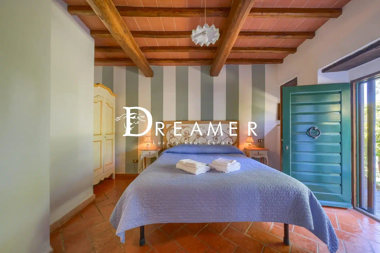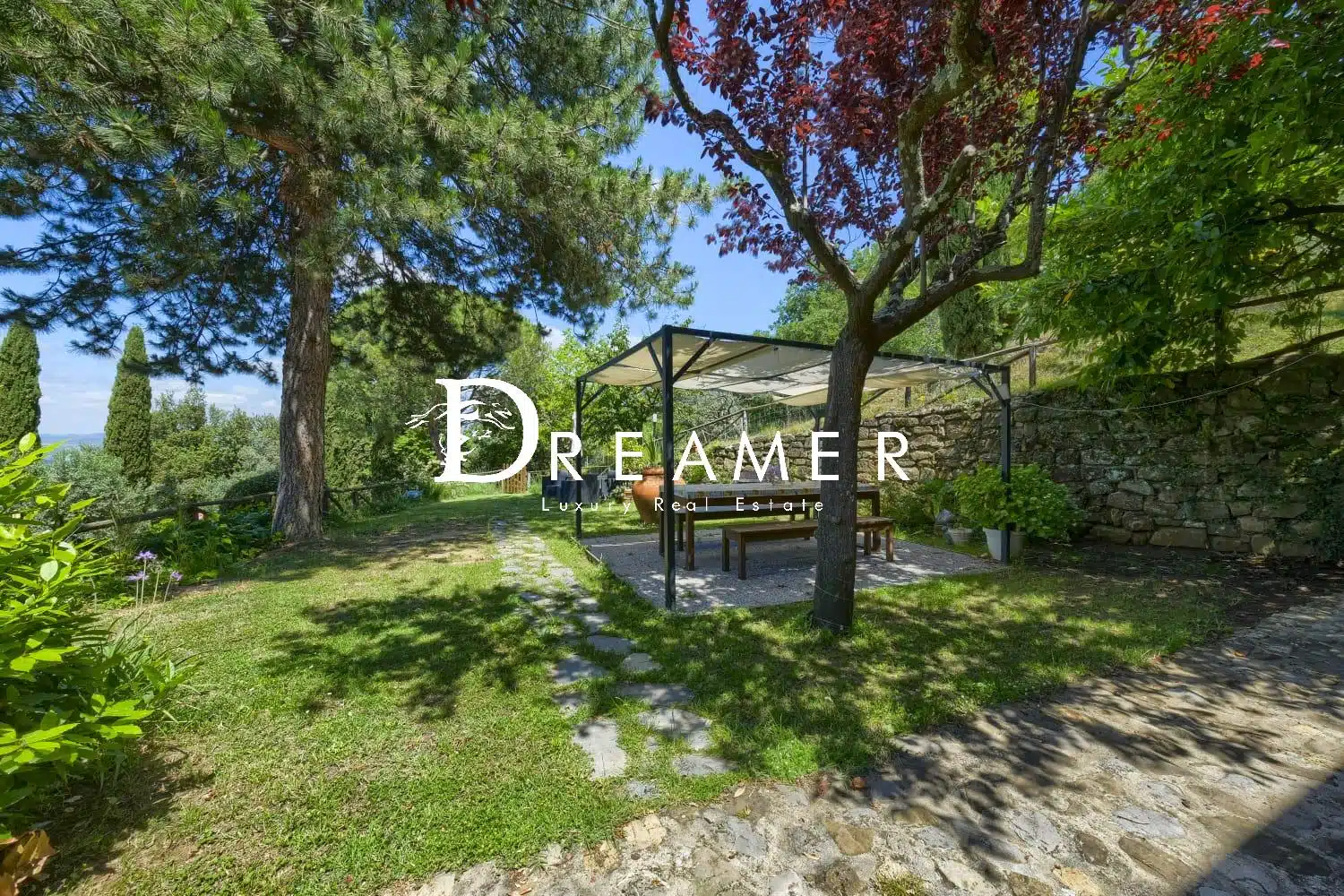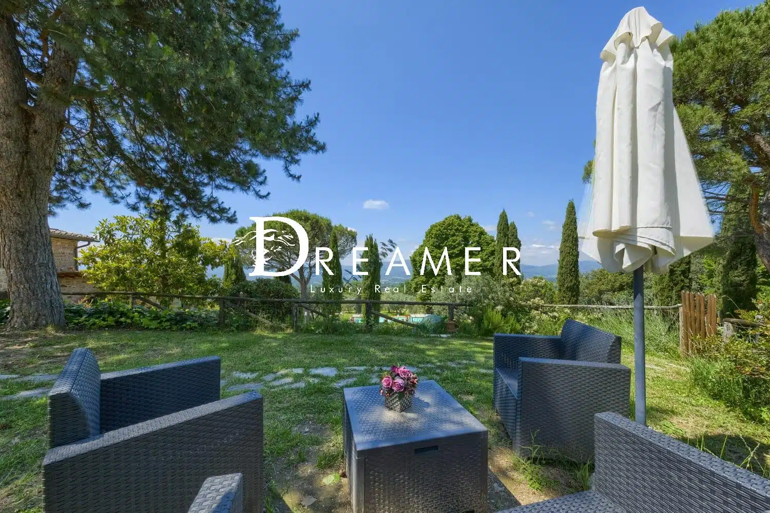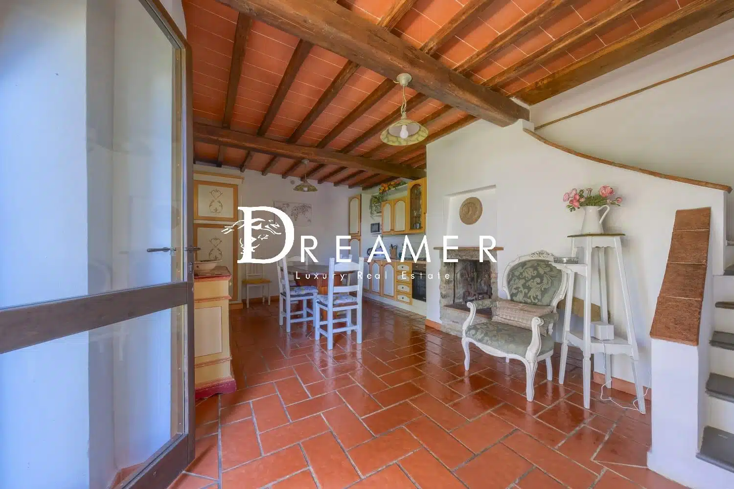 The farmhouse is surrounded by a one-hectare fenced garden with a swimming pool, in an excellent panoramic and private location. The total land measures approximately 4.3 hectares, divided between woodland and olive grove. There is also ample parking for at least six cars, independent heating, and a private well that guarantees complete water autonomy. Access to the property is via two private roads, partially unpaved but well-maintained.