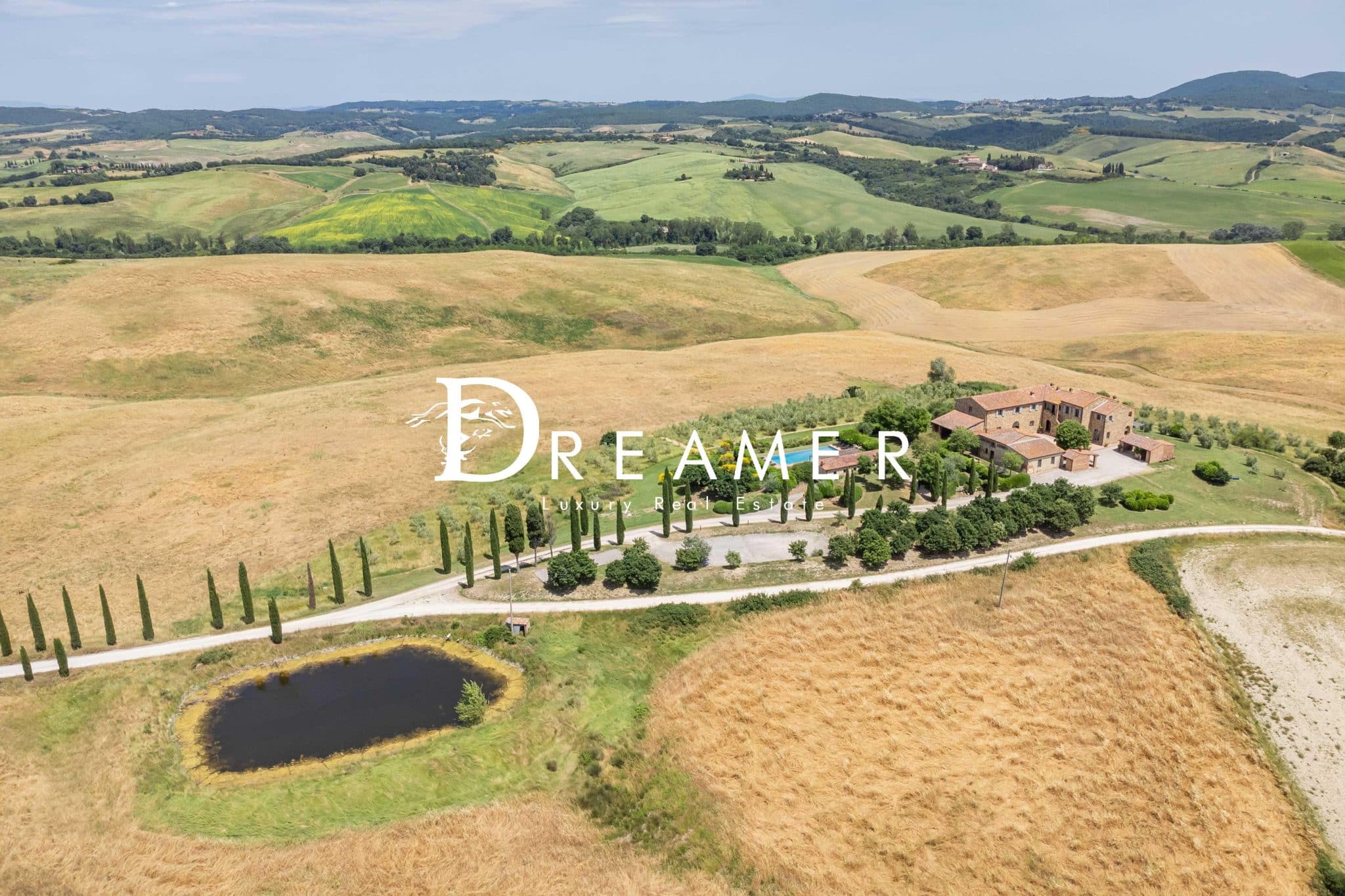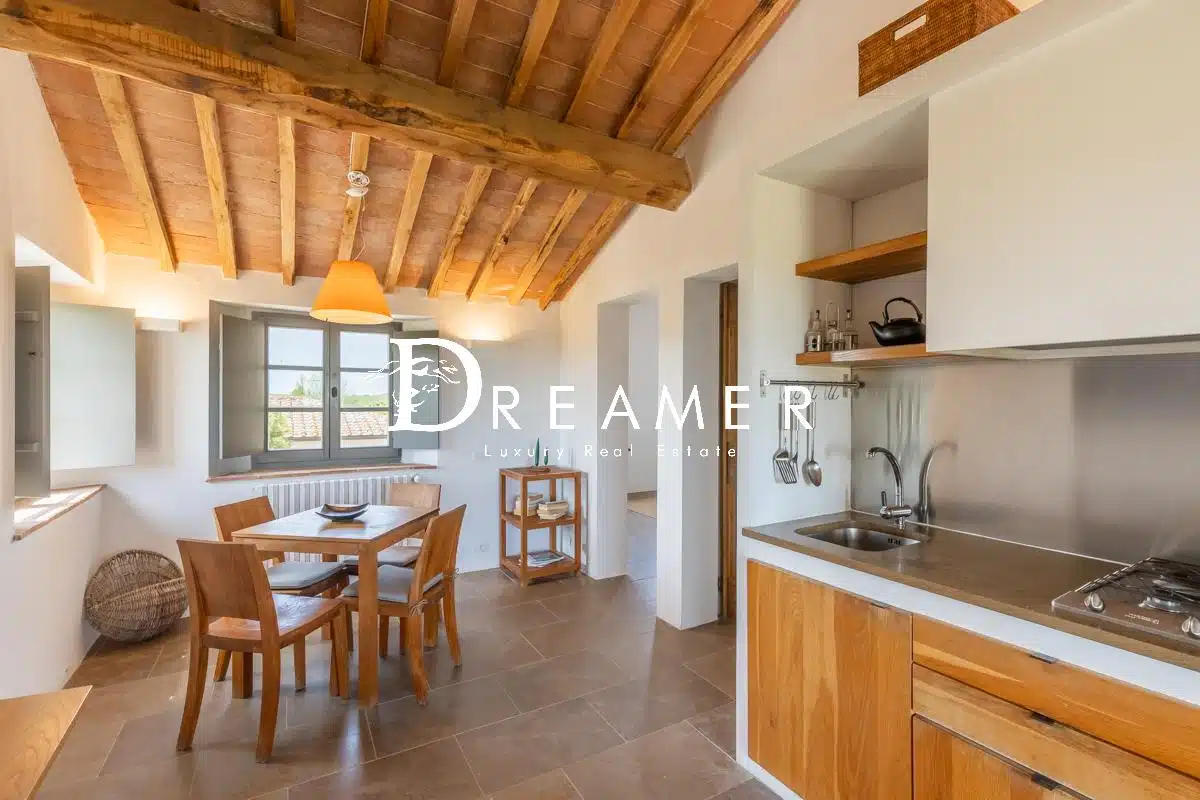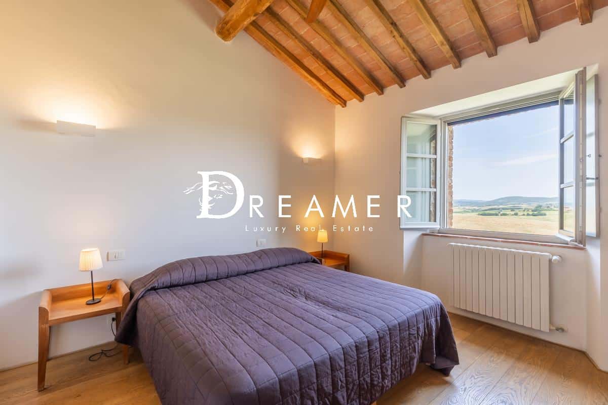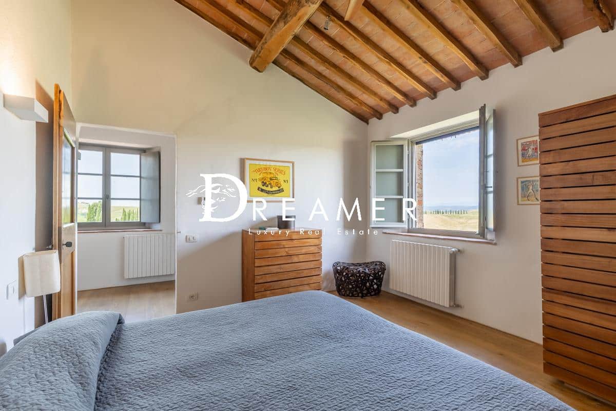 Located in the municipality of Asciano, the property is surrounded by an enchanting landscape characterized by rolling hills, cypress trees and hilltop villages such as San Giovanni d’Asso, Montalcino and Siena. Finally, thanks to its strategic shape and unique location, the farmhouse is ideal for use as a private residence but also for weddings and events.